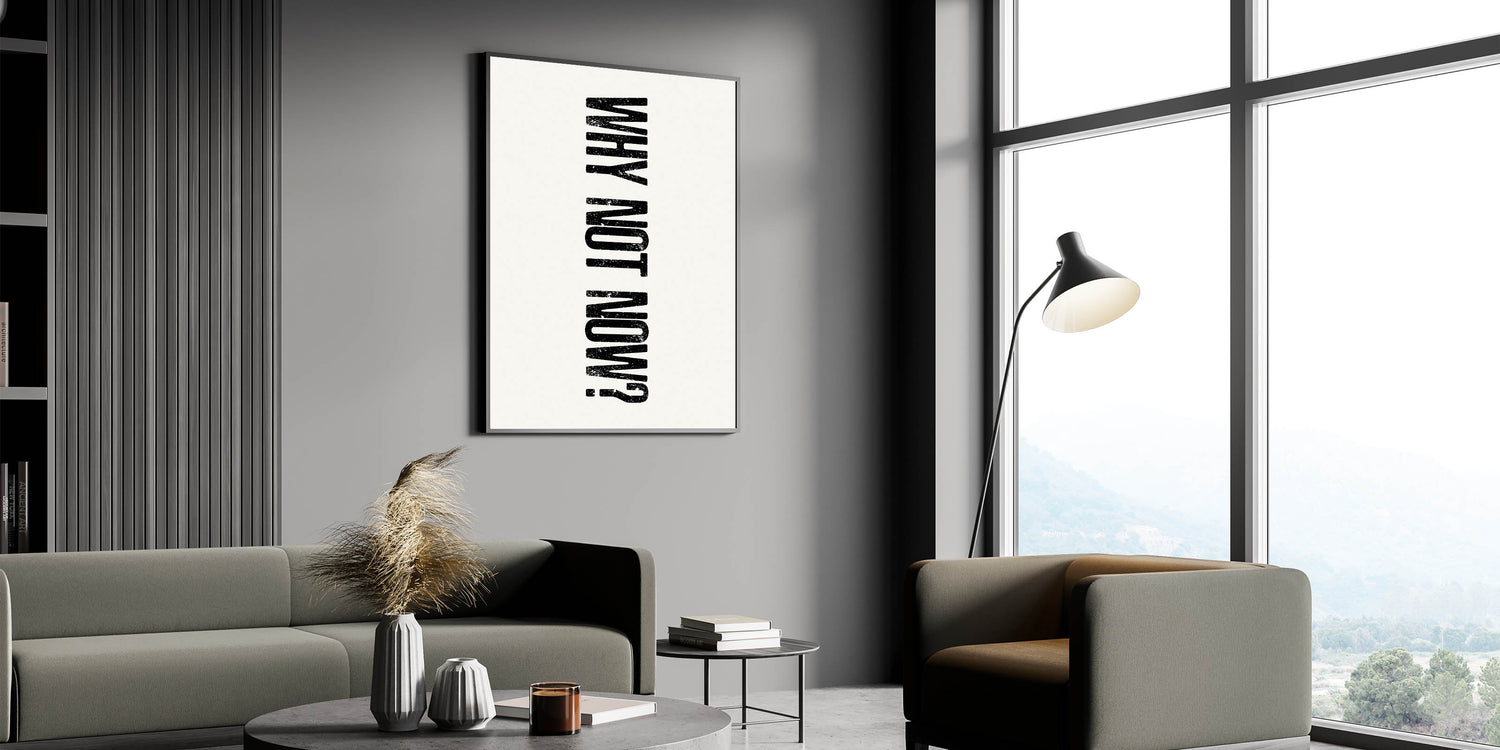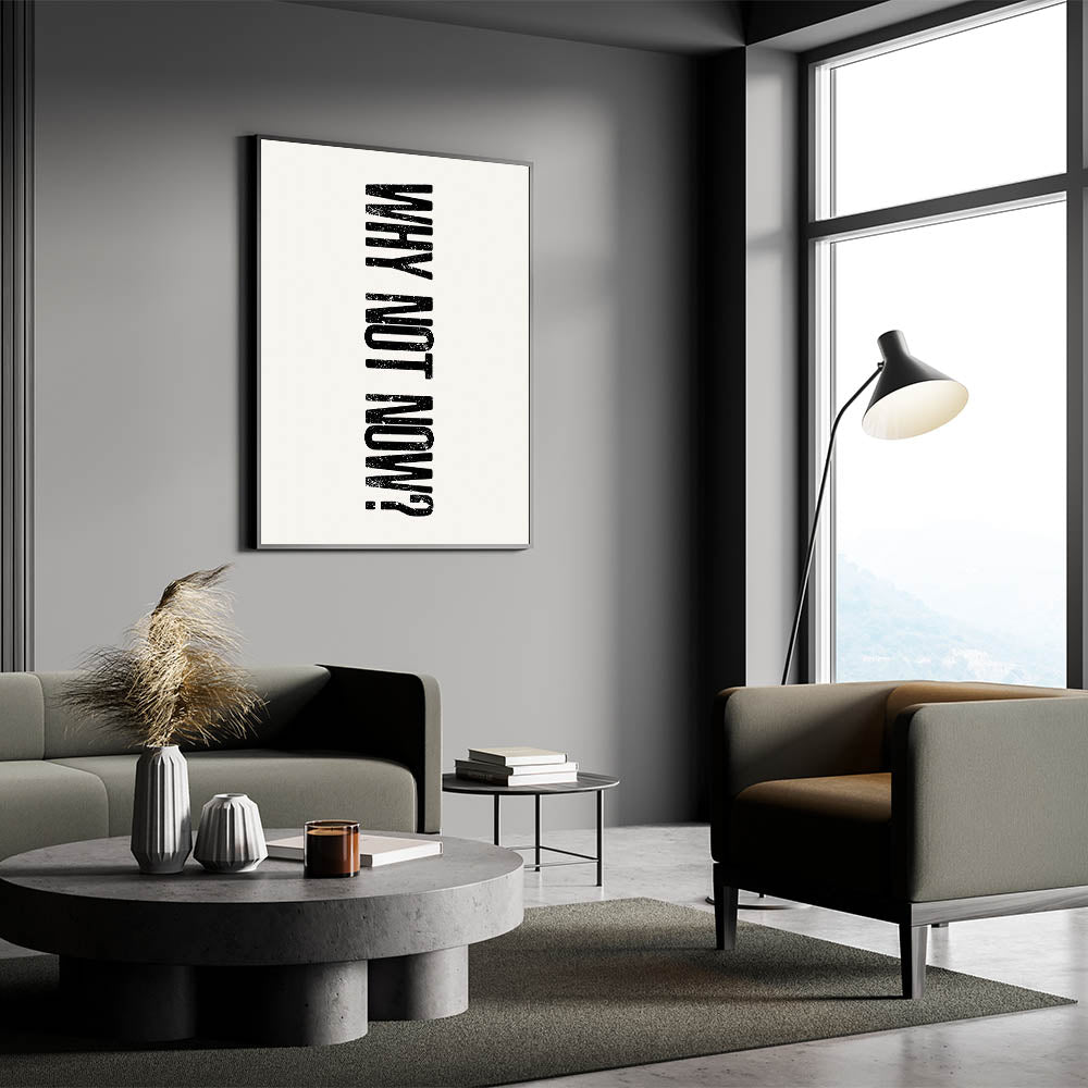 Embrace a bold, motivational message with this electric wall art featuring the powerful phrase "WHY NOT NOW?" in distressed black typography. This minimalist design, with its vertical orientation and high-contrast style, serves as a constant reminder to take action and seize the moment. Whether you're looking for a piece that inspires productivity or adds an edge to your modern decor, this vibrant art print is perfect for your living space or workspace.