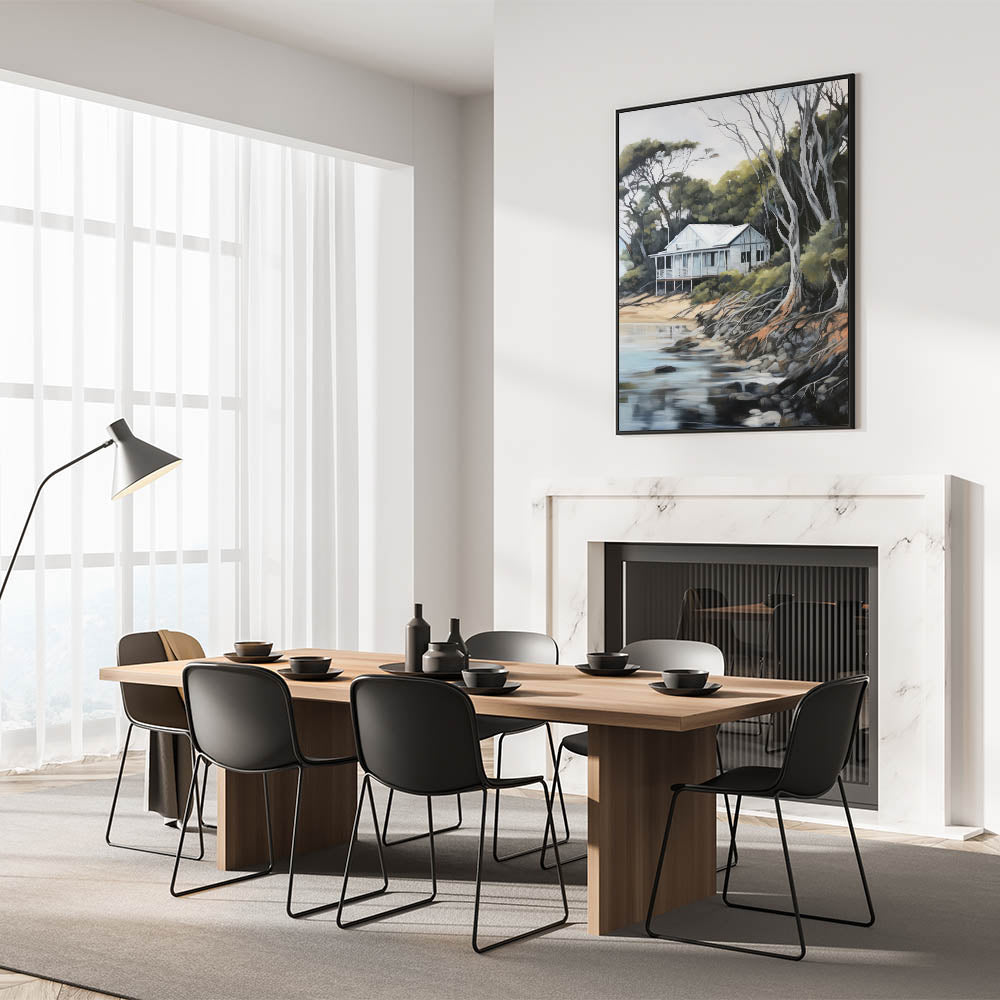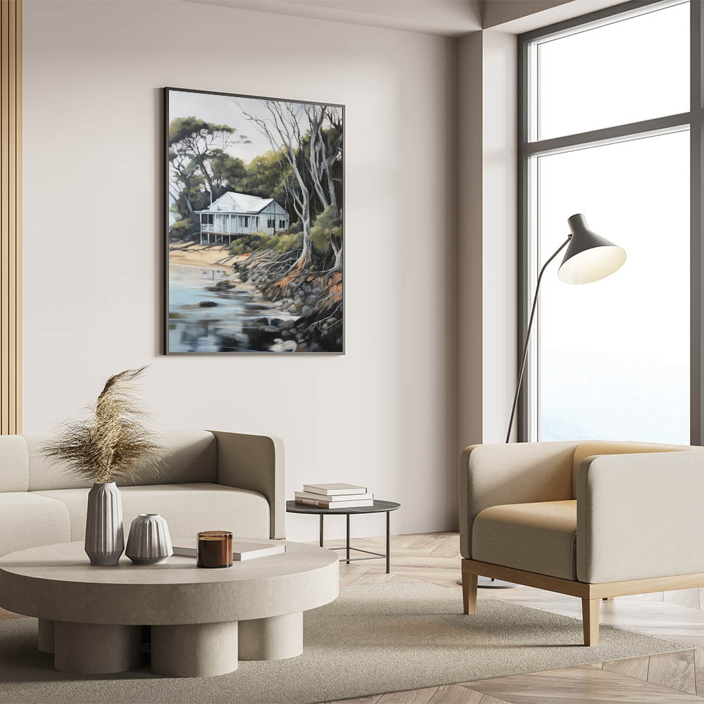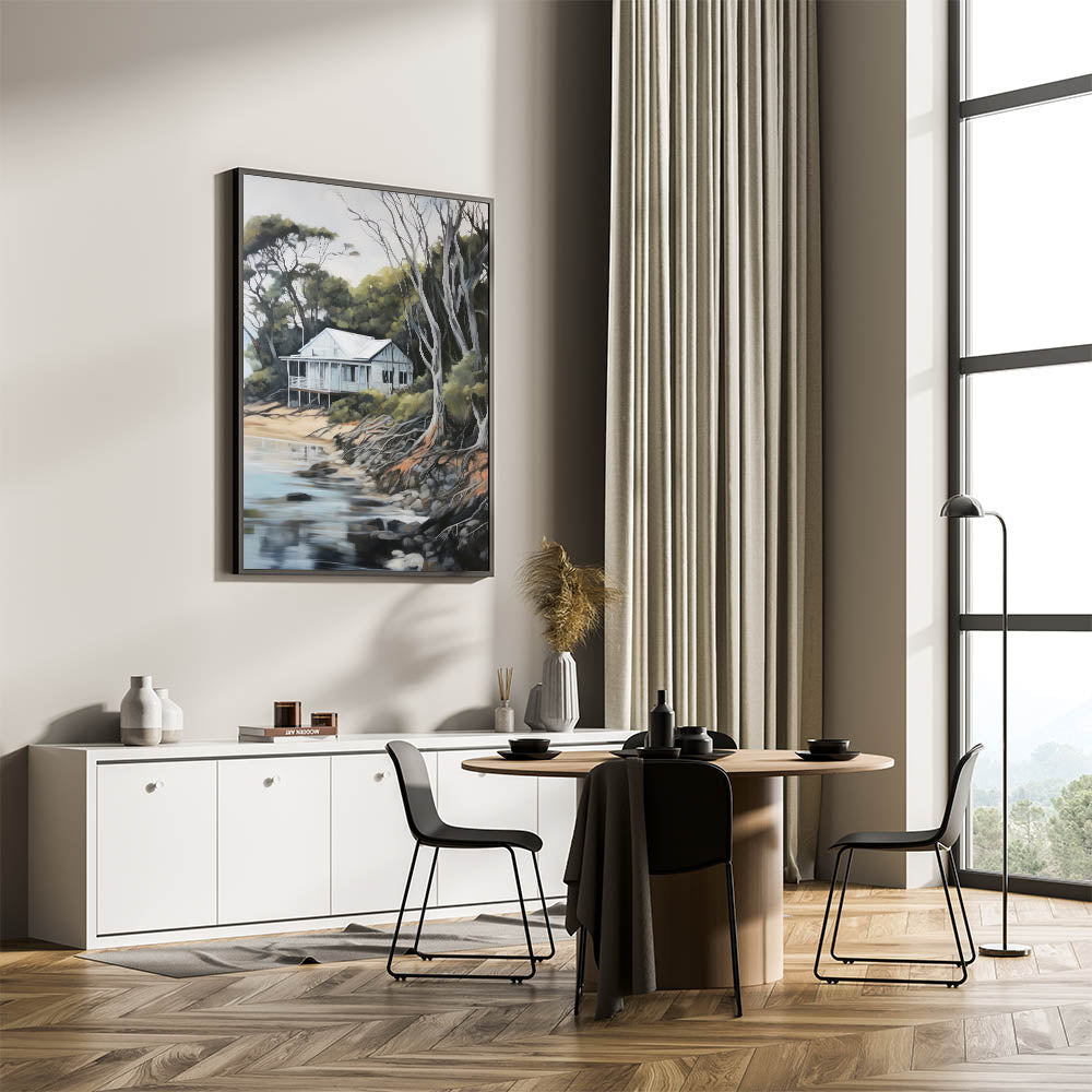 Bring the serenity of nature into your home with this electric coastal cabin art, perfect for creating a peaceful and relaxing atmosphere.