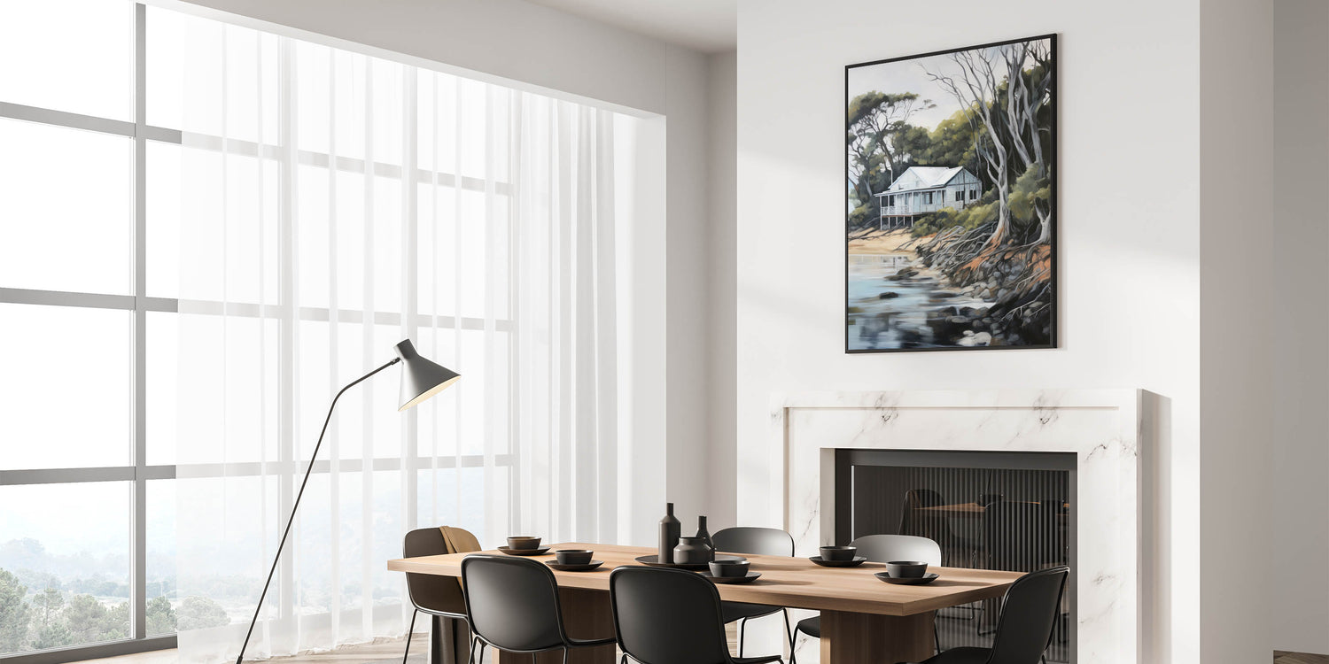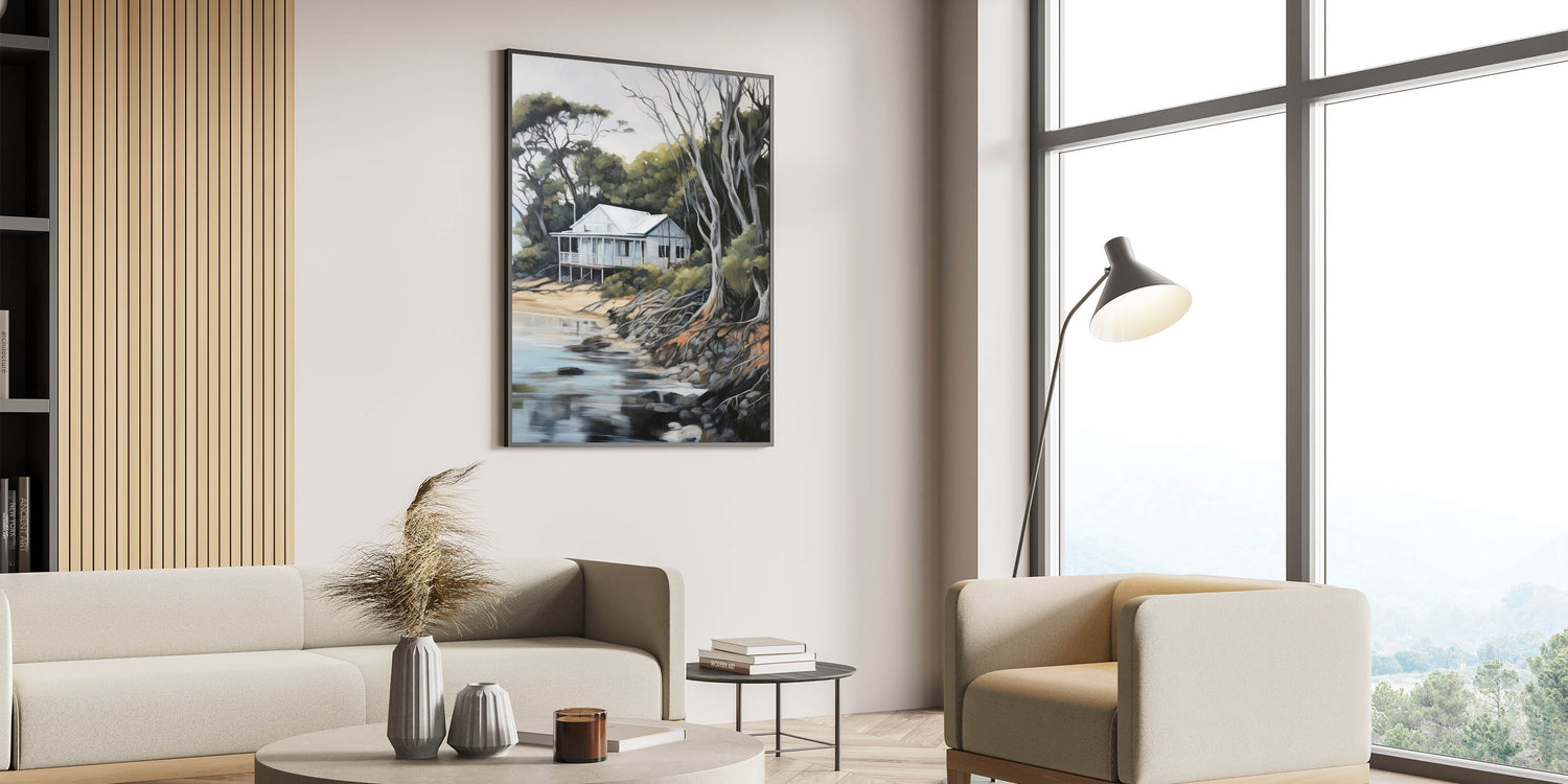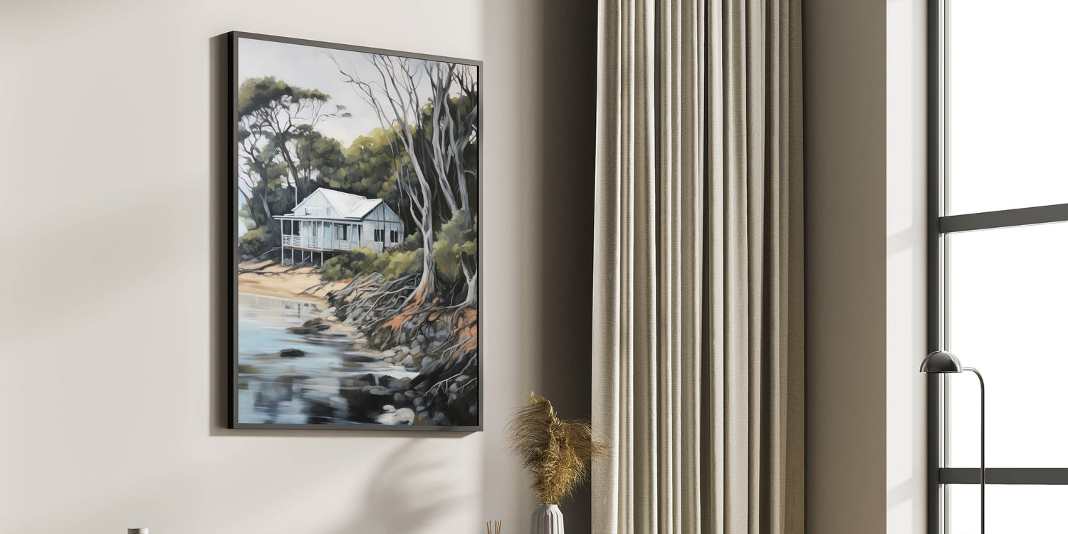 Bring the serenity of nature into your home with this electric coastal cabin art, perfect for creating a peaceful and relaxing atmosphere.