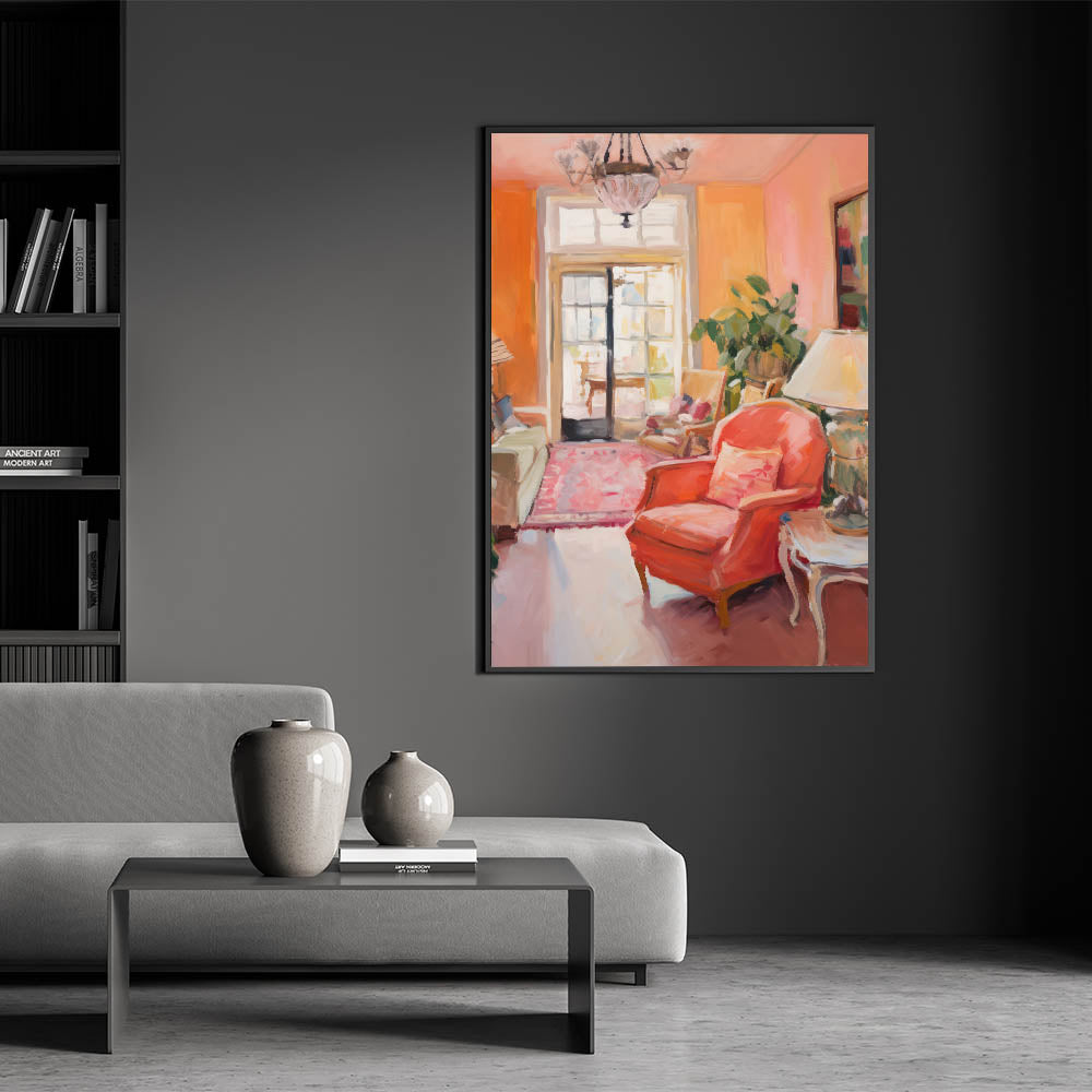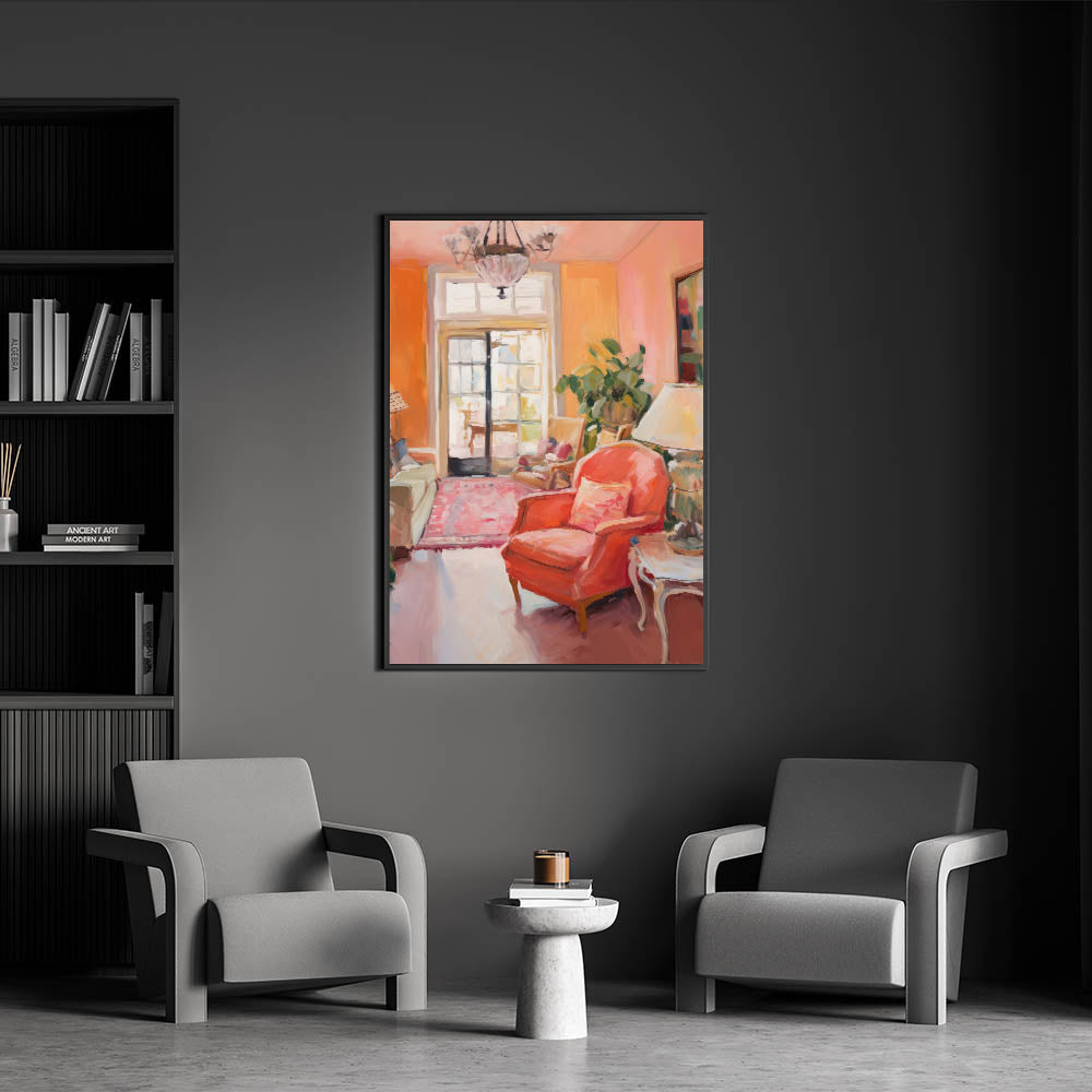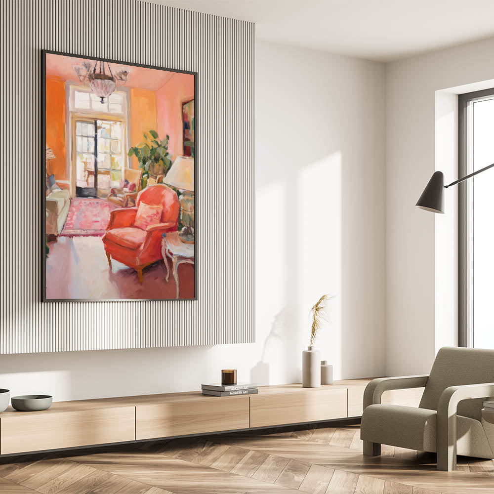 Add warmth and charm to your home with this electric wall art that captures a cozy living room bathed in warm, soft light. The vibrant hues of orange and pink, along with the comforting presence of the armchair and decorative plants, create an inviting and cheerful atmosphere. This electric art canvas blends contemporary artistic style with the comforting familiarity of home, making it the perfect addition to any space that needs a touch of color and life.