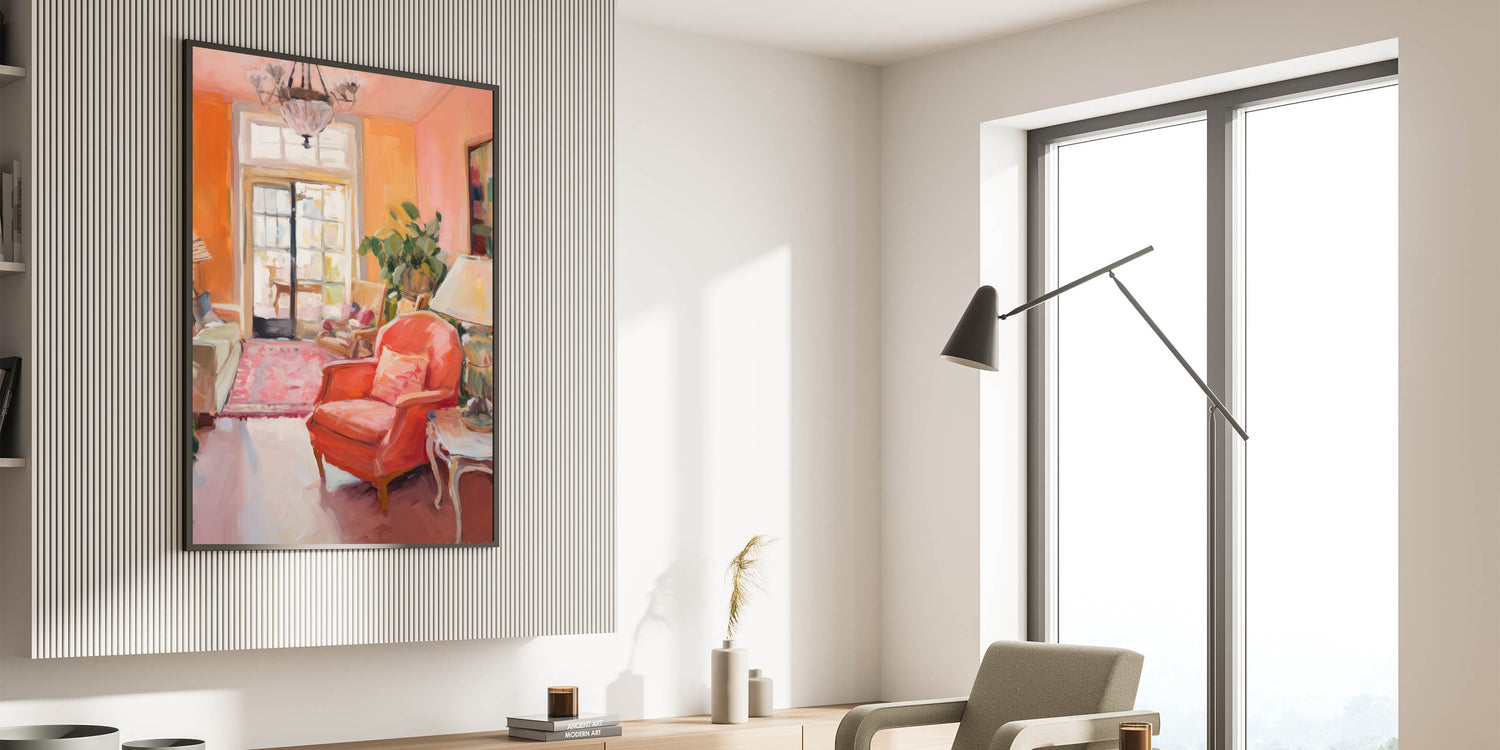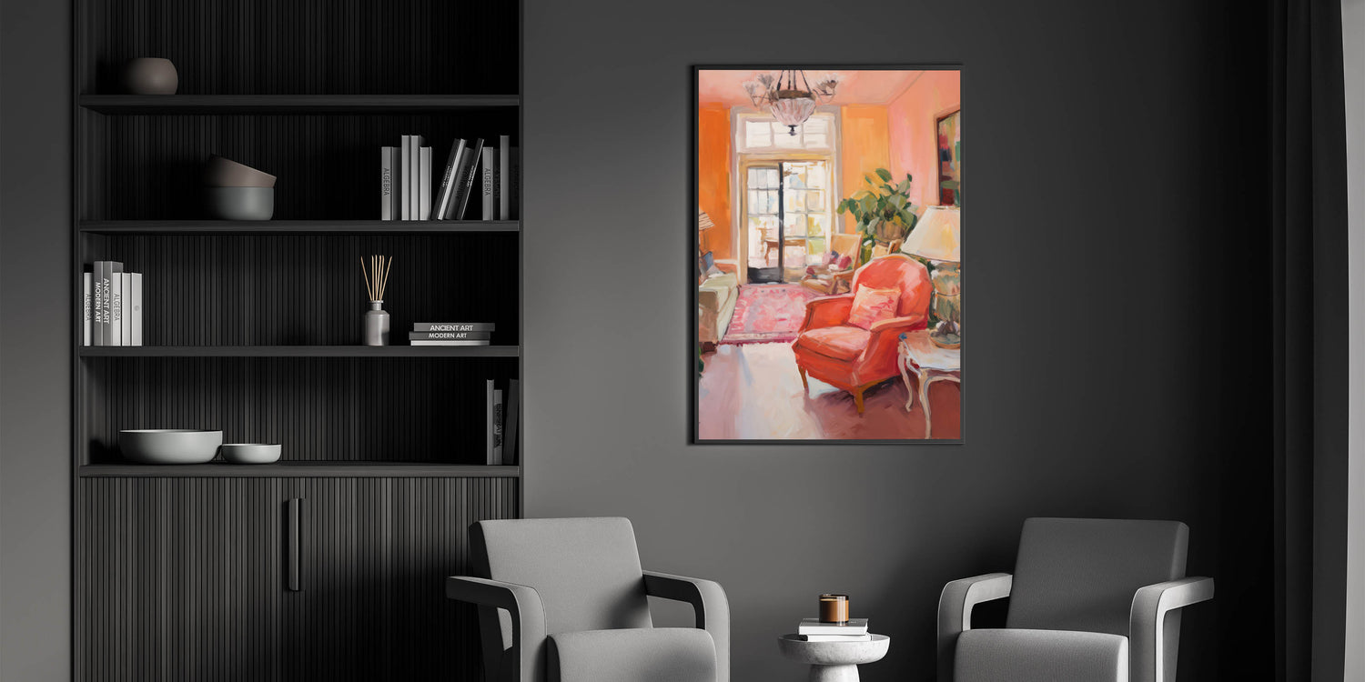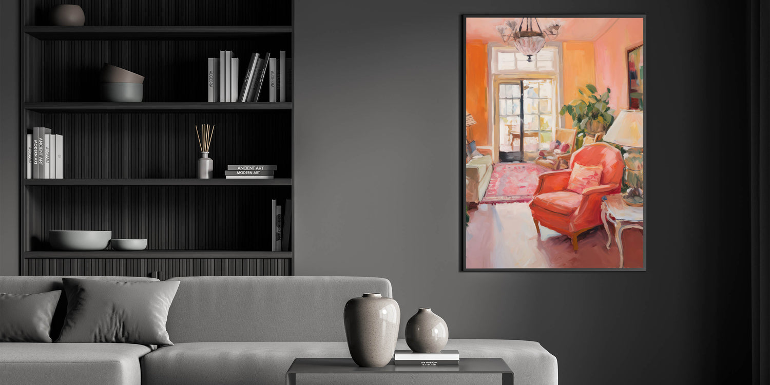 Add warmth and charm to your home with this electric wall art that captures a cozy living room bathed in warm, soft light. The vibrant hues of orange and pink, along with the comforting presence of the armchair and decorative plants, create an inviting and cheerful atmosphere. This electric art canvas blends contemporary artistic style with the comforting familiarity of home, making it the perfect addition to any space that needs a touch of color and life.