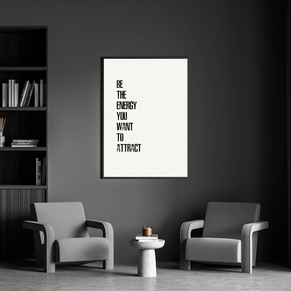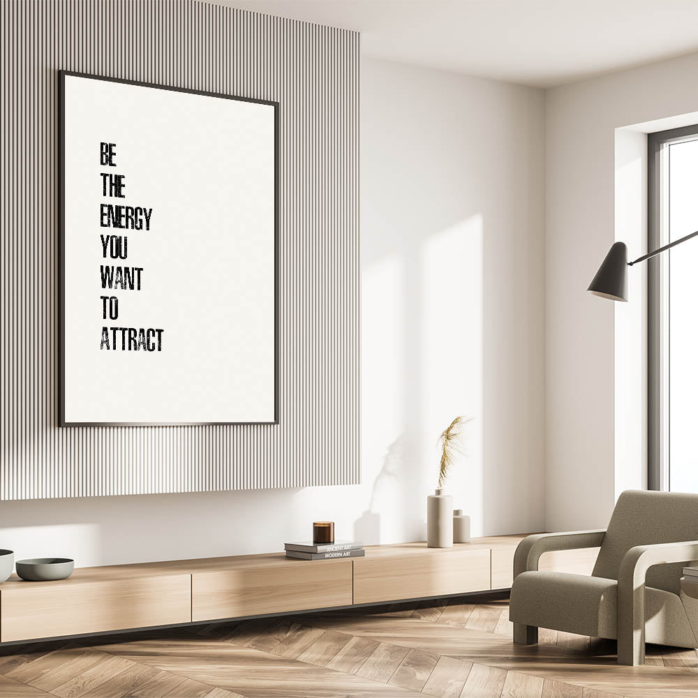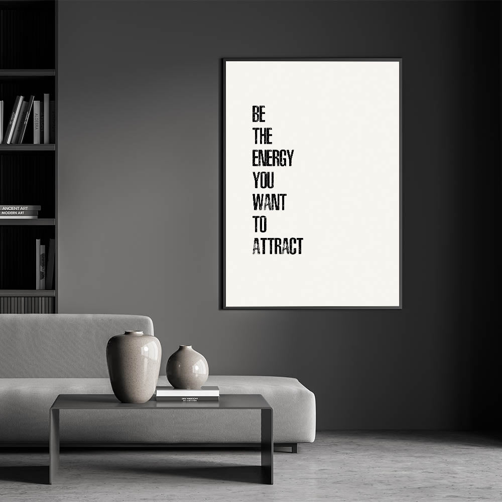 Inspire yourself and others daily with this powerful electric wall art featuring the phrase "Be the Energy You Want to Attract." This minimalist typography piece, designed with distressed black text on a clean white background, encourages positivity and mindfulness. The sleek vertical arrangement adds a bold and modern touch to any interior, making it the perfect addition to your home or office decor.