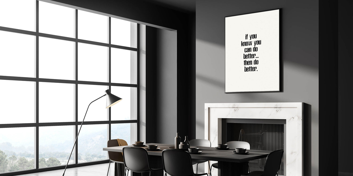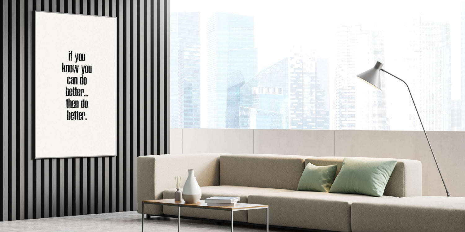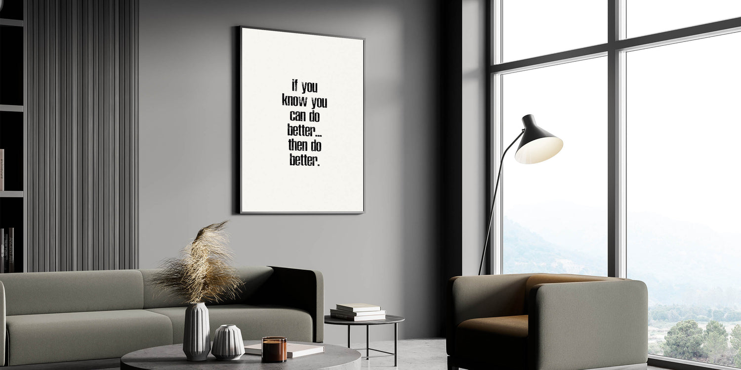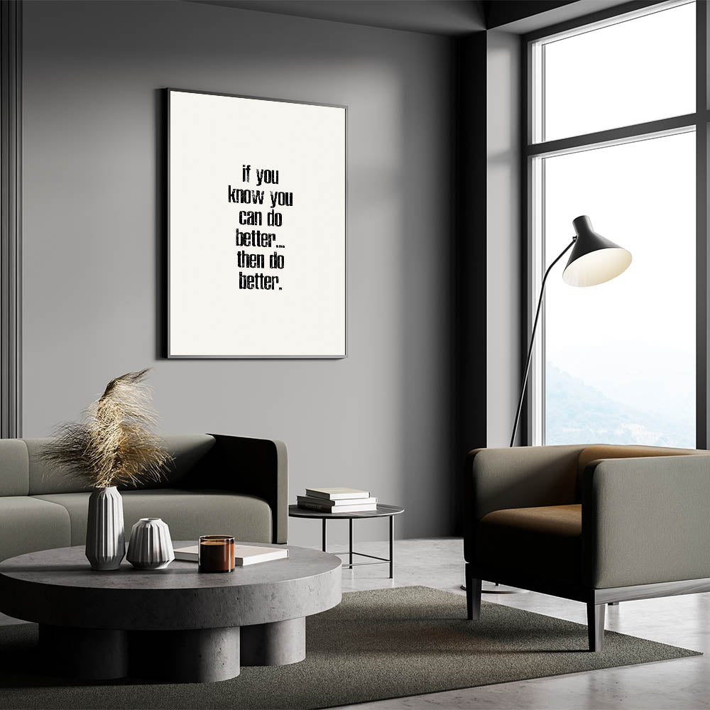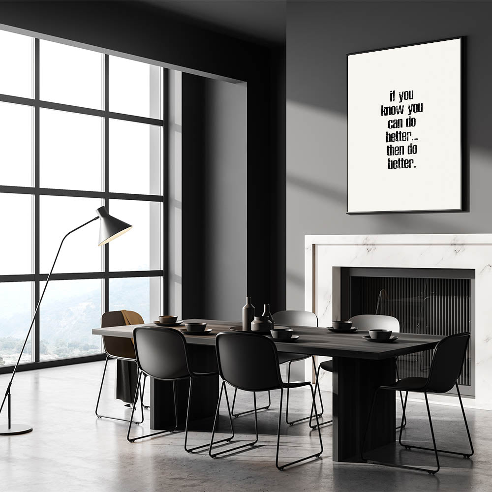 Motivate yourself and others with this powerful electric wall art featuring the phrase "If You Know You Can Do Better... Then Do Better." This minimalist typography design, with its distressed black text on a clean white background, encourages self-improvement and growth. The vertical layout adds a modern and bold touch, making this vibrant art print a perfect choice for any room where inspiration is needed.