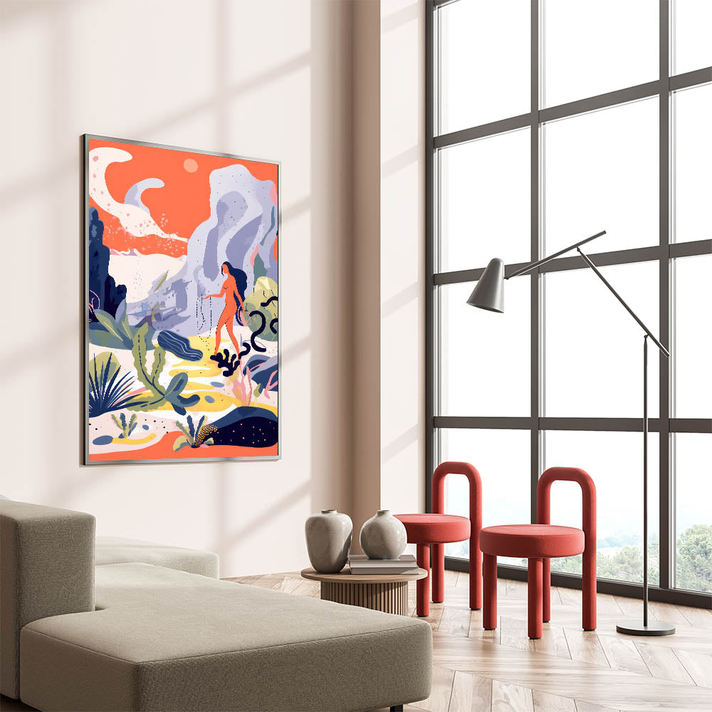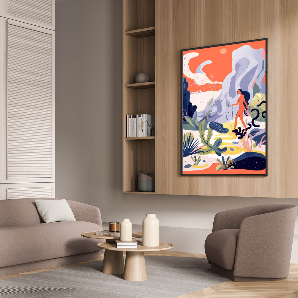 Bring a sense of wonder and intrigue to your home with this eye-catching electric wall art, featuring a surreal desert landscape. The artwork depicts a vibrant and abstract scene with bold, flowing shapes, a mysterious figure walking across the desert, and dynamic plant life, all rendered in striking electric tones. The vivid oranges, blues, and muted pastels come together to create a unique and modern composition that captivates the viewer's imagination.