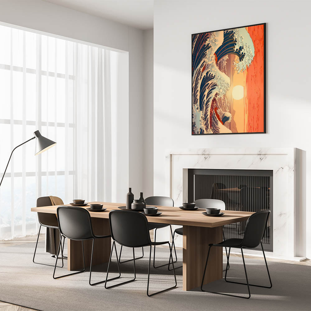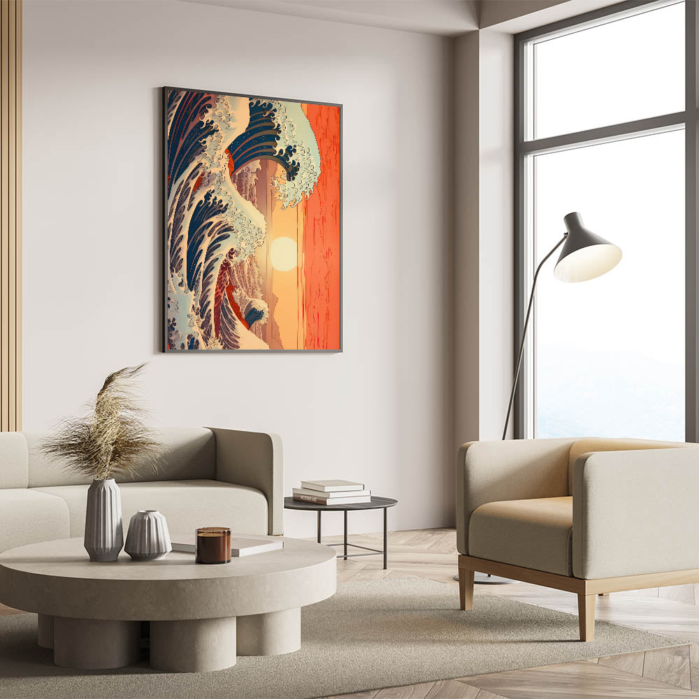 Immerse yourself in the power of nature with this electric wave wall art, featuring a dynamic ocean scene set against a vibrant sunset. The bold waves, painted in deep blues and highlighted with splashes of white, contrast beautifully with the warm orange and coral tones of the sunset. This striking piece combines the energy of the sea with the tranquility of the evening sky, making it a perfect focal point for modern and coastal-inspired interiors.
