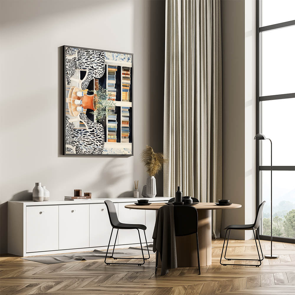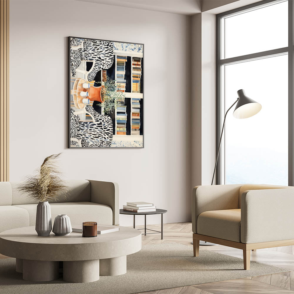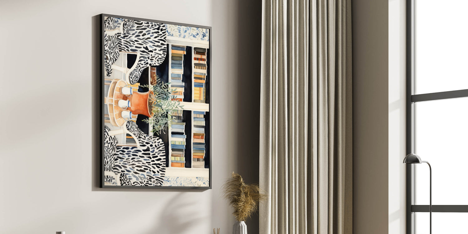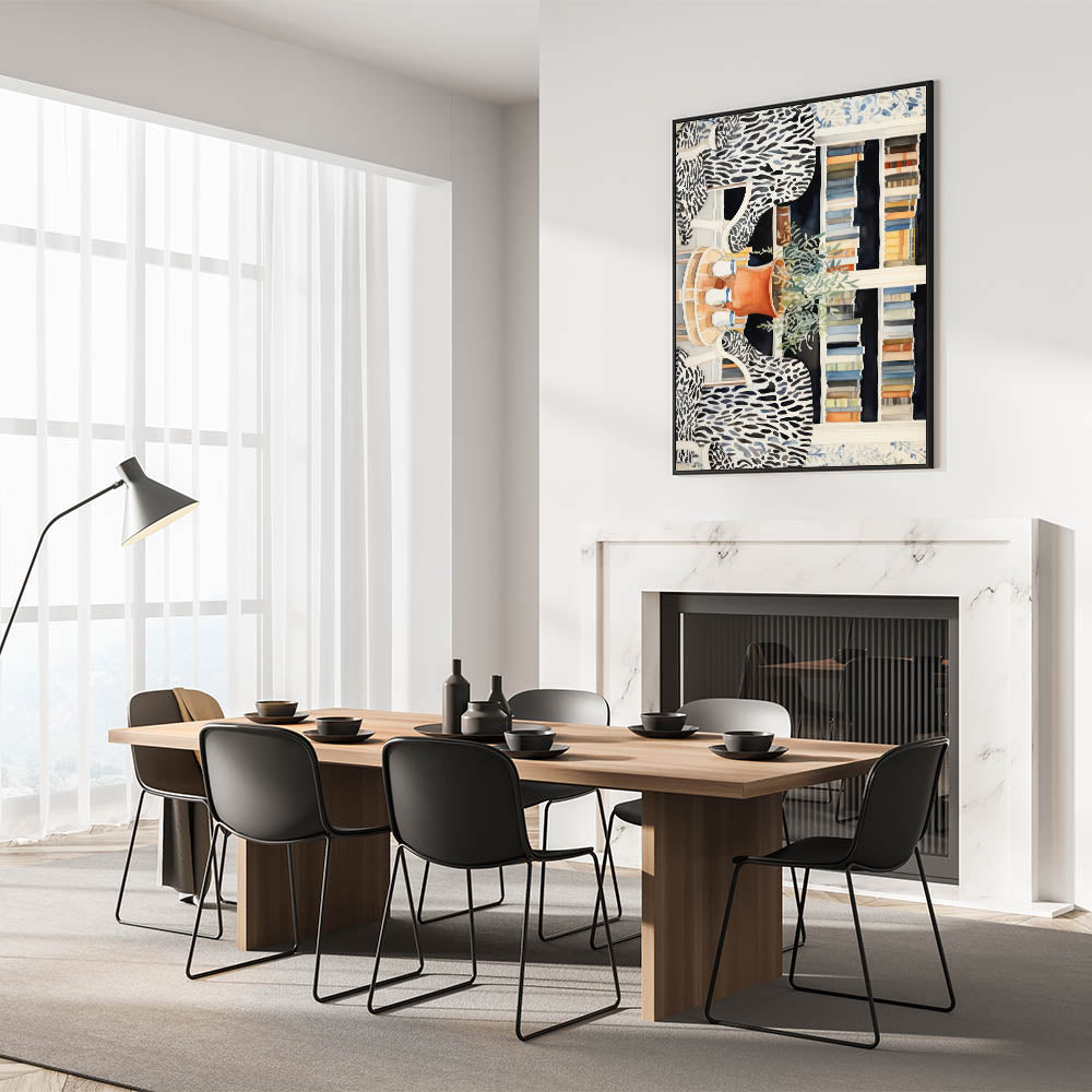 Create a refined and artistic ambiance with this electric-themed library artwork. Featuring a cozy library nook with zebra-patterned chairs, shelves of colorful books, and a touch of nature with the greenery on a terracotta pot, this piece brings a perfect balance of modernity and sophistication. The intricate details and bold patterns make this electric art canvas an ideal statement piece for living rooms, offices, or study spaces.