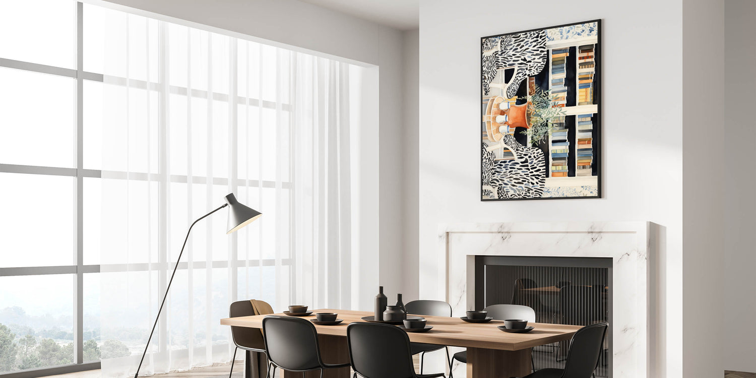 • Unique electric artwork combining classic library elements with bold, contemporary patterns.