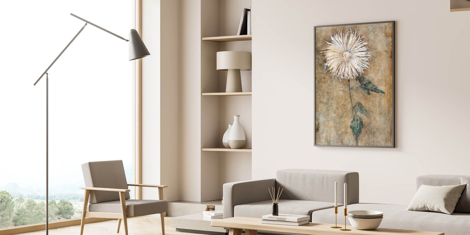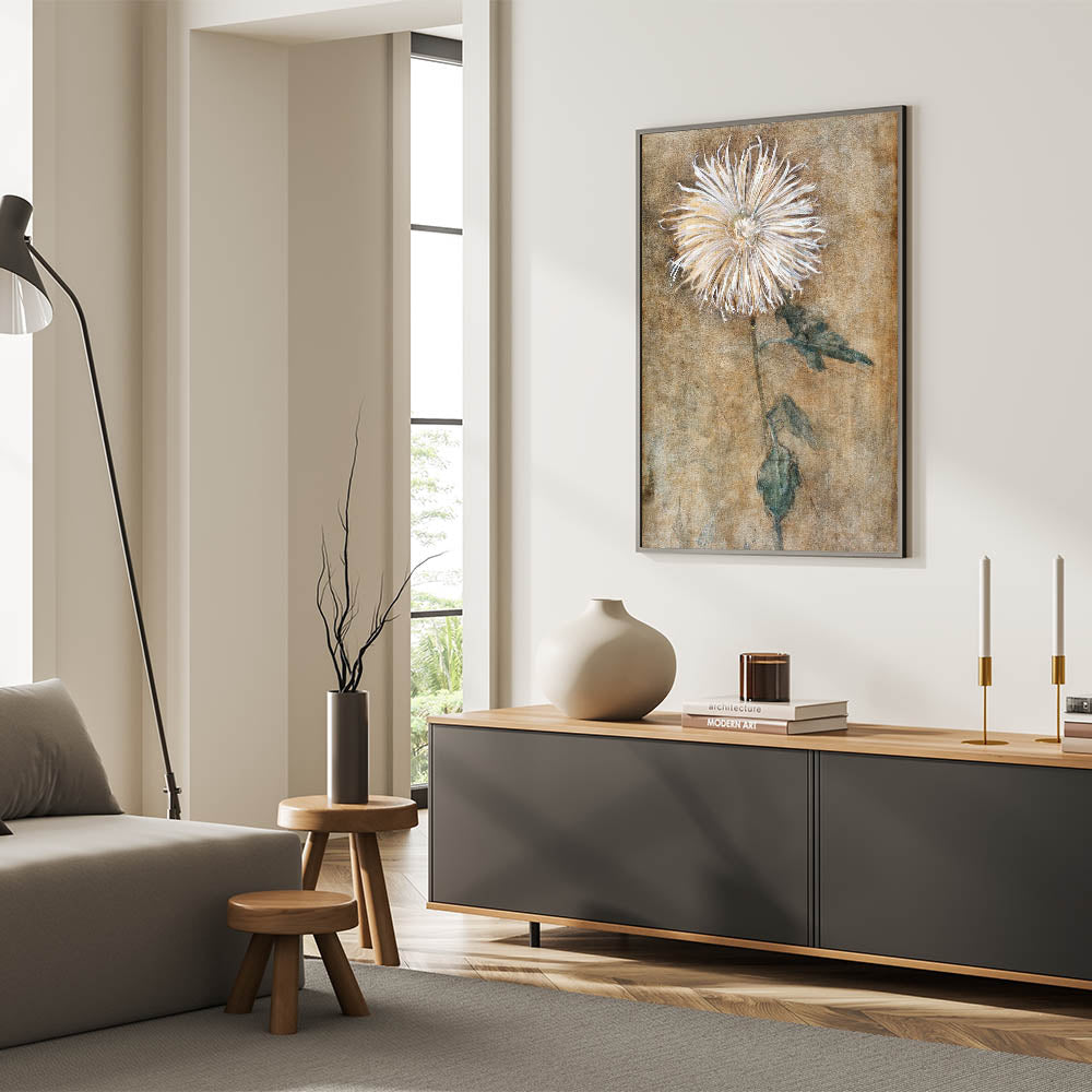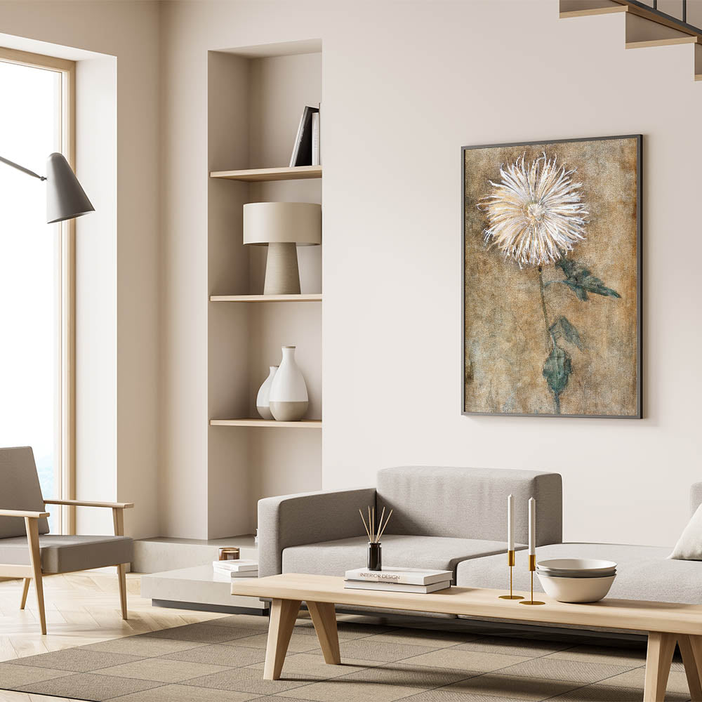 Bring a sense of elegance and simplicity into your space with this beautiful depiction of a chrysanthemum flower. This modern wall art piece, inspired by minimalist design, features soft, earthy tones and a delicate floral motif that adds a touch of tranquility to any room. Ideal for those who appreciate contemporary art, this piece embodies modern design elements, making it a perfect addition to trendy home decor collections.