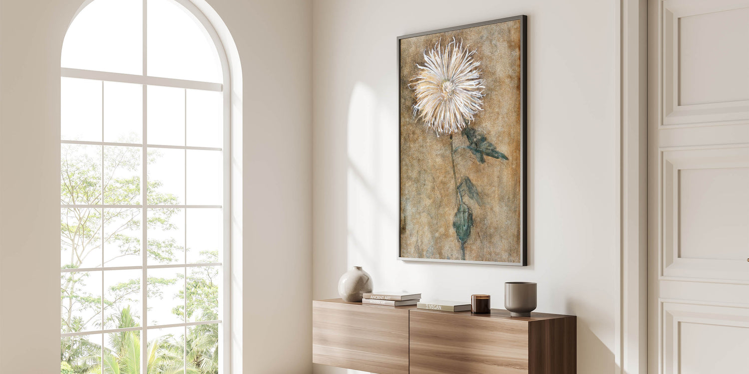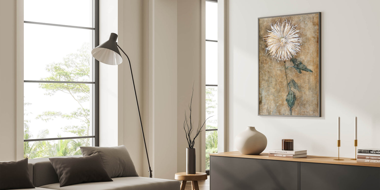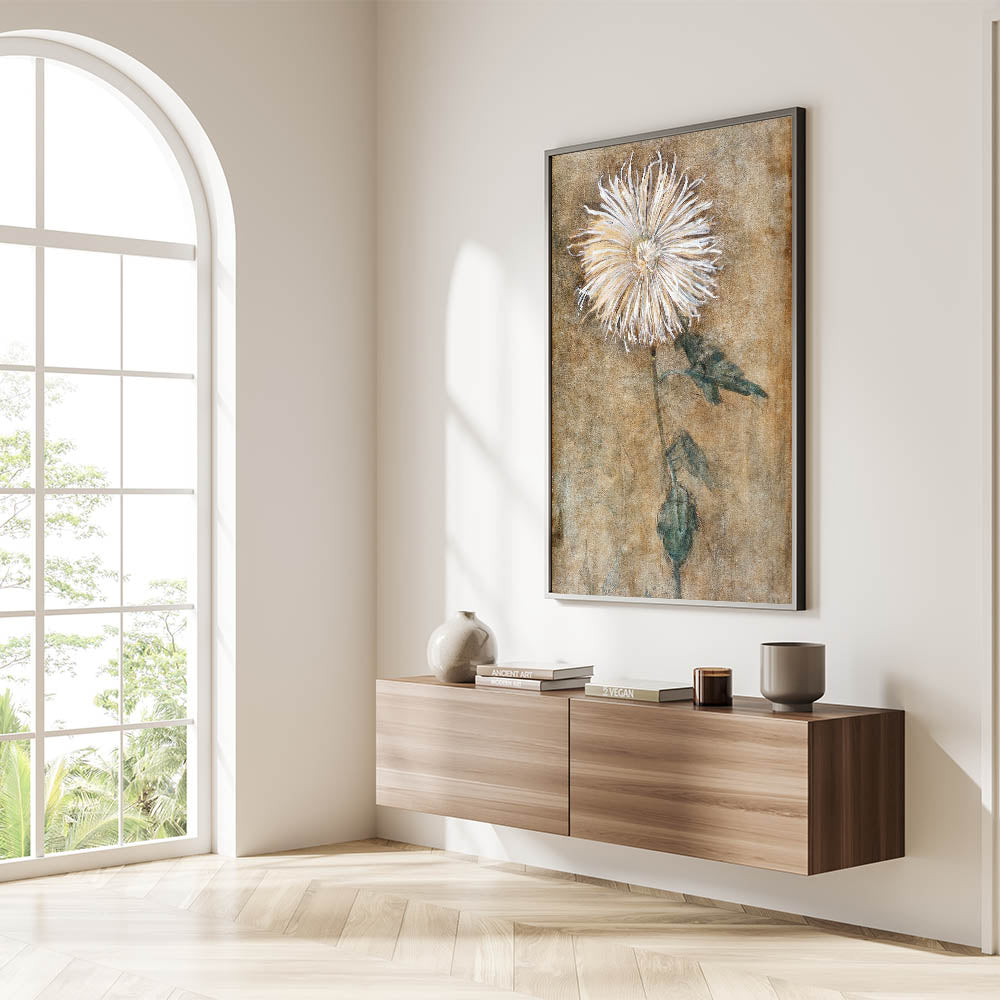 Bring a sense of elegance and simplicity into your space with this beautiful depiction of a chrysanthemum flower. This modern wall art piece, inspired by minimalist design, features soft, earthy tones and a delicate floral motif that adds a touch of tranquility to any room. Ideal for those who appreciate contemporary art, this piece embodies modern design elements, making it a perfect addition to trendy home decor collections.