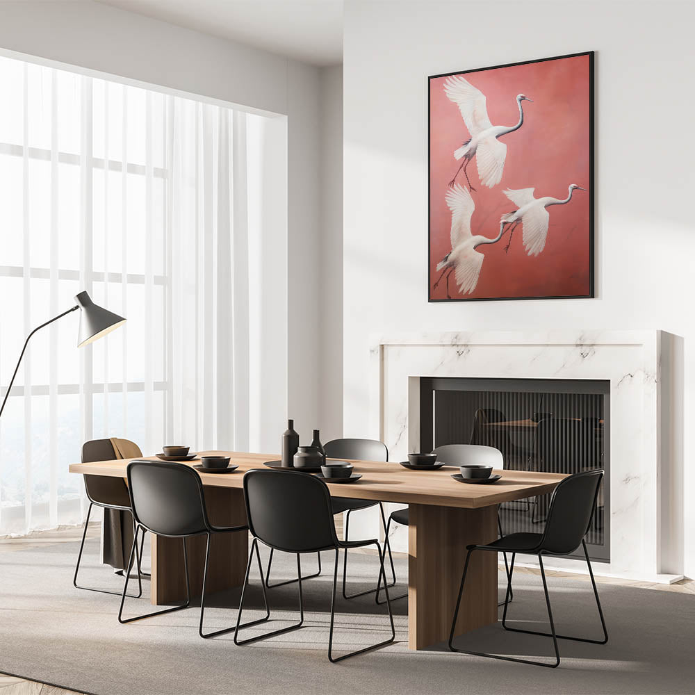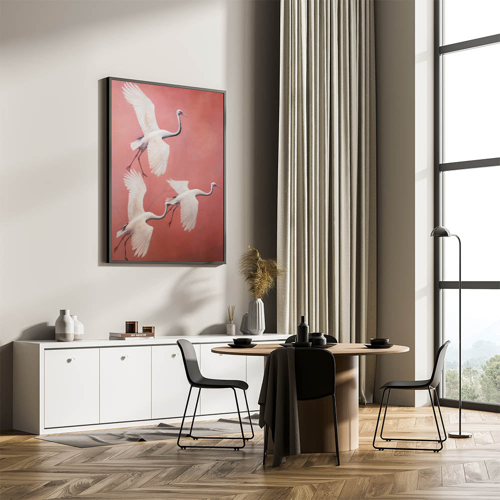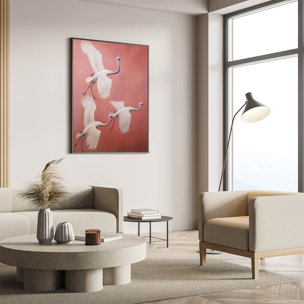 Add a touch of grace and elegance to your space with our Elegant Electric Cranes Art. This stunning piece features a trio of cranes gracefully soaring through a soft coral background, their wings elegantly outstretched. The minimalist style and delicate color palette combine to create a serene yet dynamic visual experience, perfect for those looking to enhance their space with modern electric decor that evokes nature's beauty.
