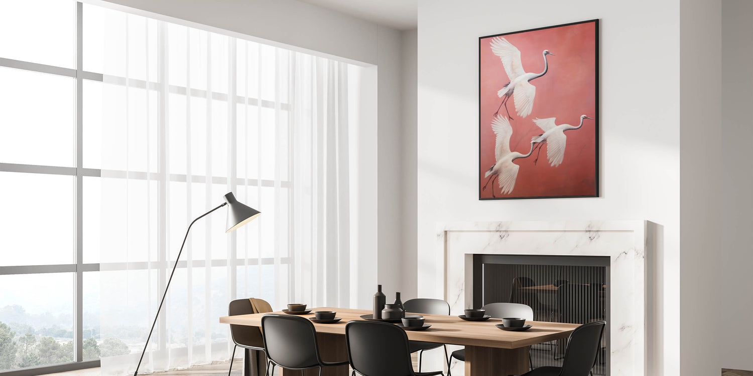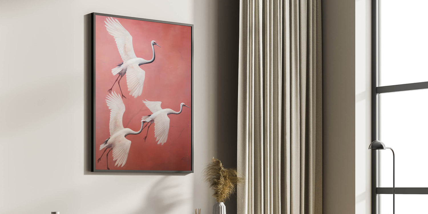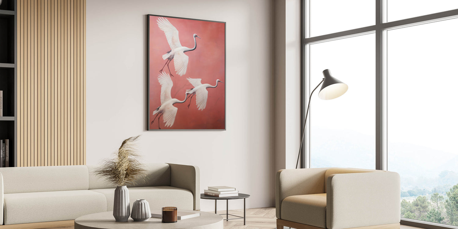 Add a touch of grace and elegance to your space with our Elegant Electric Cranes Art. This stunning piece features a trio of cranes gracefully soaring through a soft coral background, their wings elegantly outstretched. The minimalist style and delicate color palette combine to create a serene yet dynamic visual experience, perfect for those looking to enhance their space with modern electric decor that evokes nature's beauty.