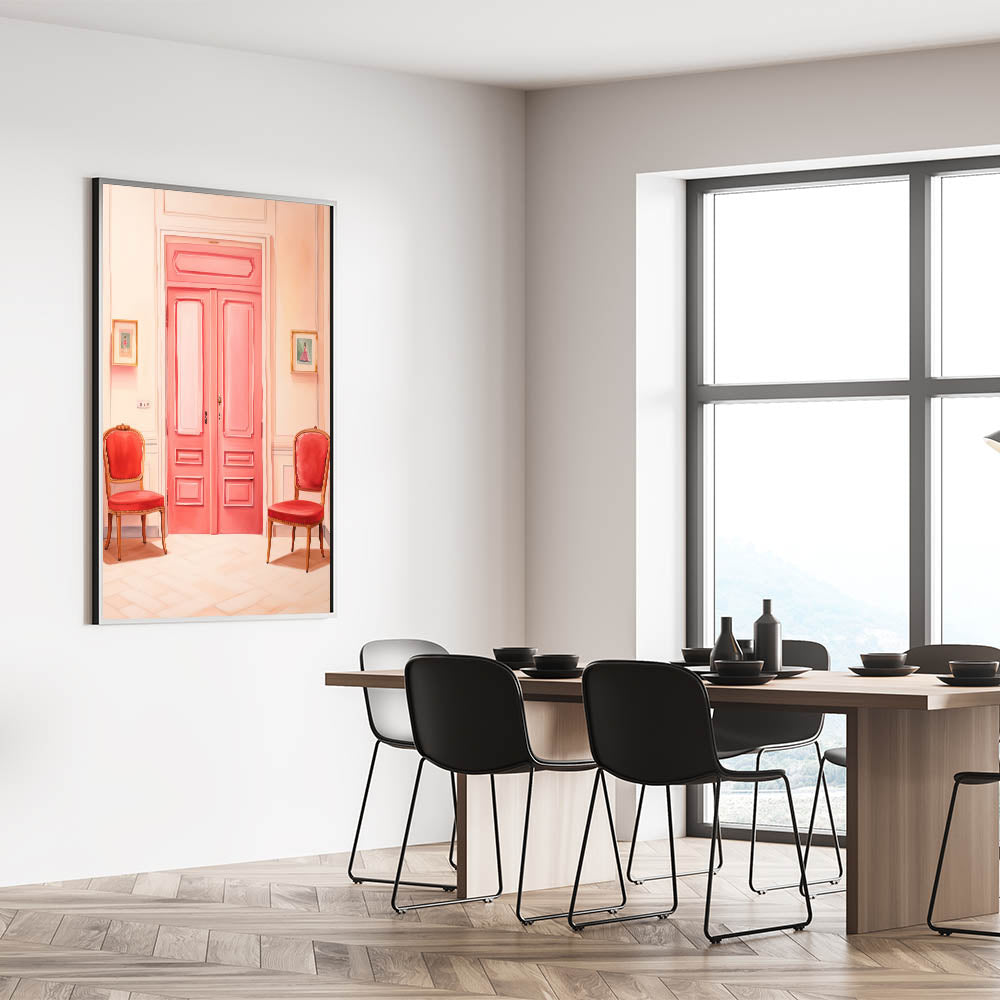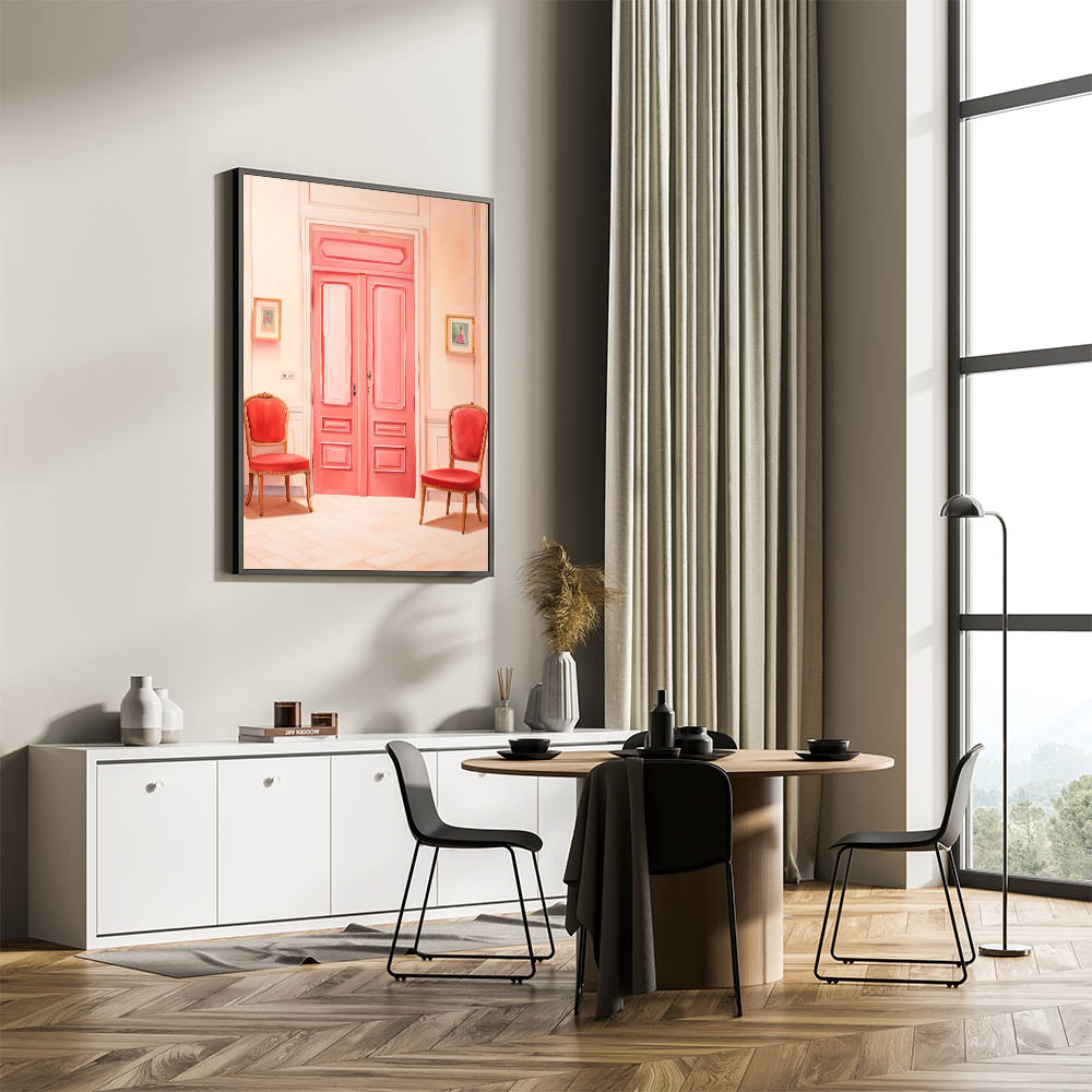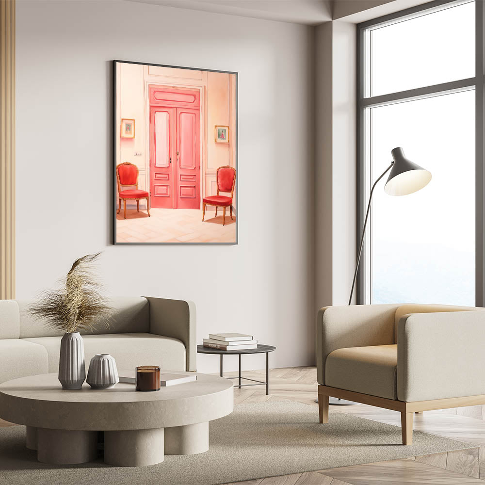 Add a touch of elegance and sophistication to your space with this electric-themed room artwork. Featuring a beautifully decorated interior with vibrant pink doors and plush chairs, this piece captures the charm of classic design with a modern twist. The bright pink hues and clean lines make this electric art canvas perfect for any living room, bedroom, or hallway seeking a unique and bold statement piece.