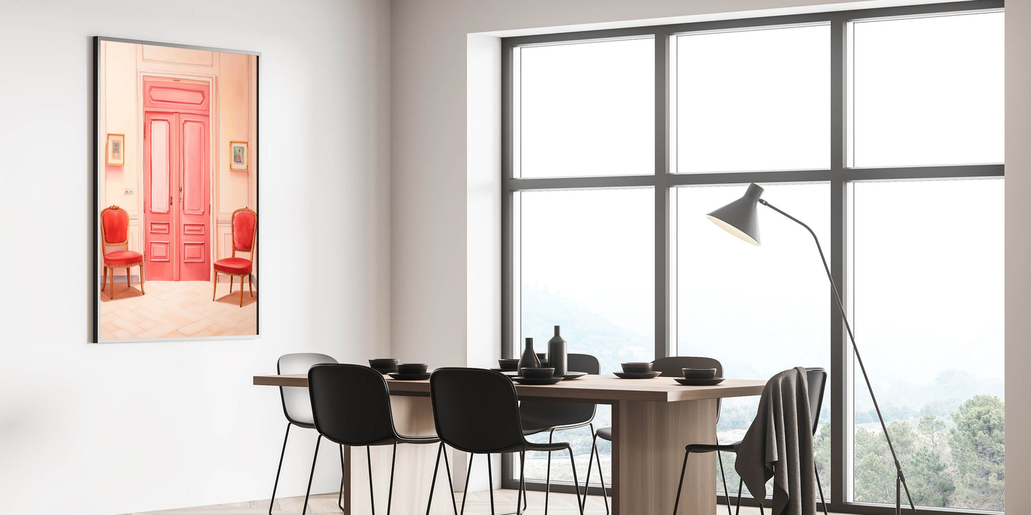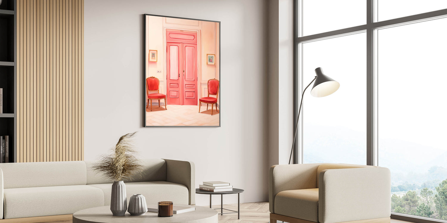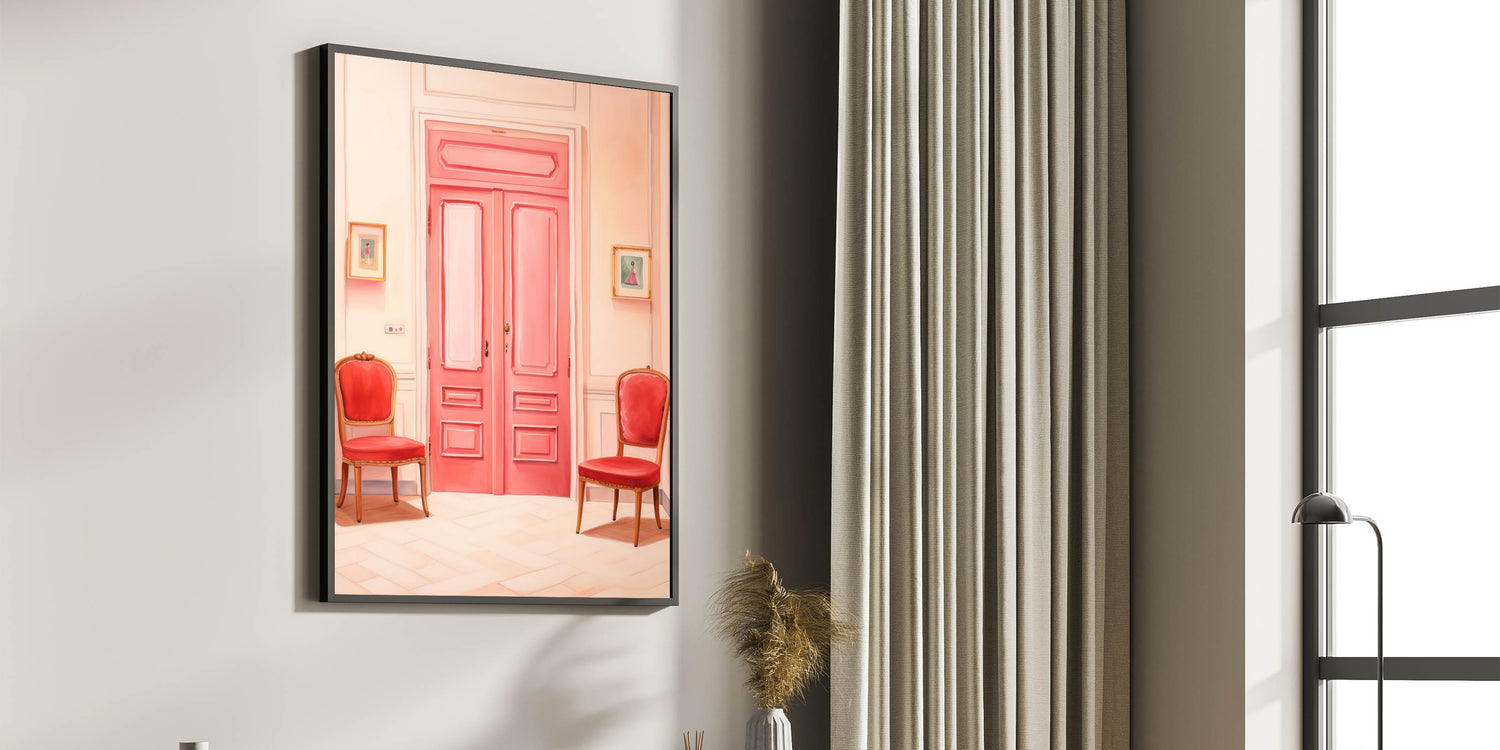 Add a touch of elegance and sophistication to your space with this electric-themed room artwork. Featuring a beautifully decorated interior with vibrant pink doors and plush chairs, this piece captures the charm of classic design with a modern twist. The bright pink hues and clean lines make this electric art canvas perfect for any living room, bedroom, or hallway seeking a unique and bold statement piece.