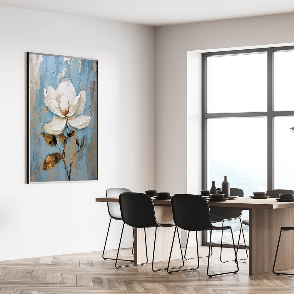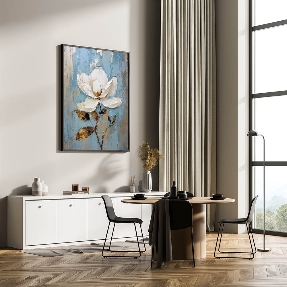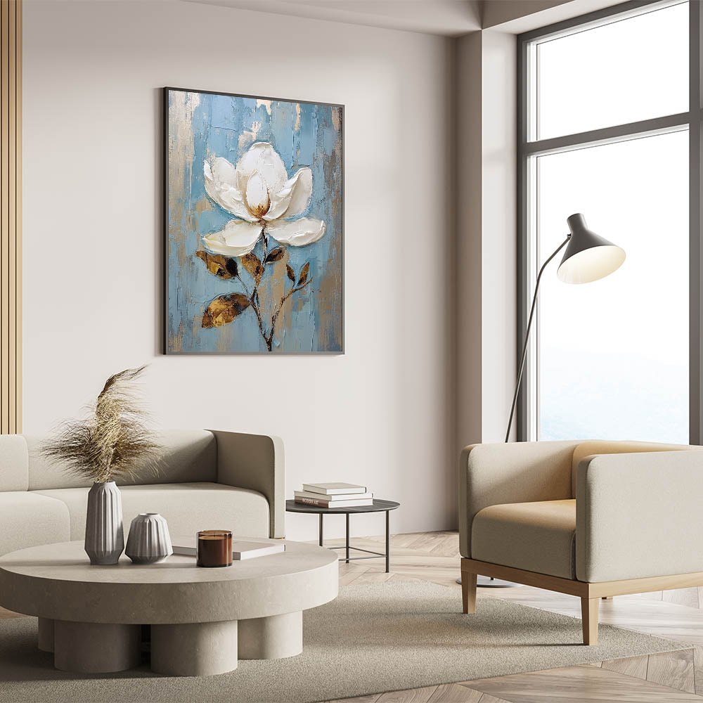 Elevate your home decor with this stunning floral glam wall art, featuring a beautifully textured white flower set against a soft blue and gold background. The delicate petals and rich, earthy tones of the leaves add a sense of elegance and tranquility to any space. This piece effortlessly blends modern sophistication with natural beauty, making it an ideal choice for chic and glam-inspired interiors.