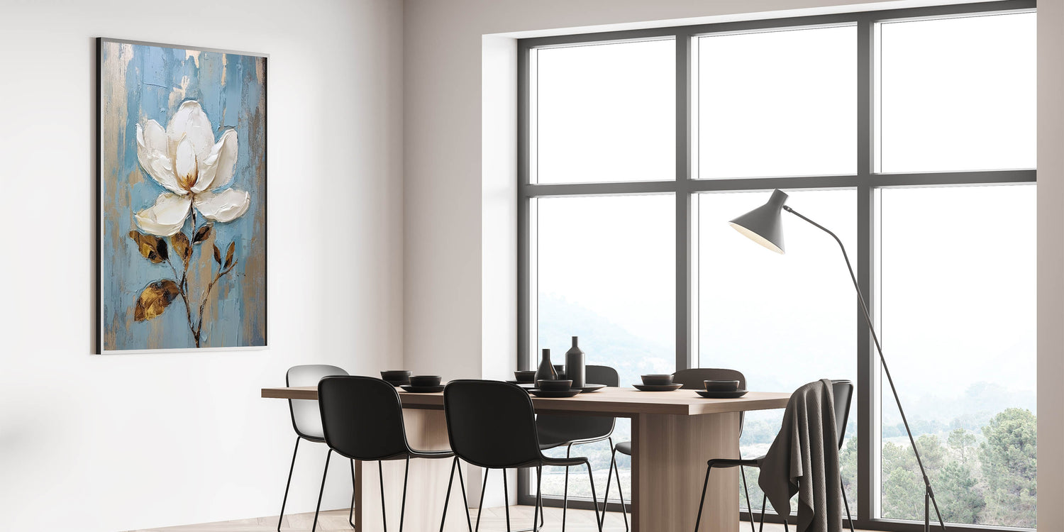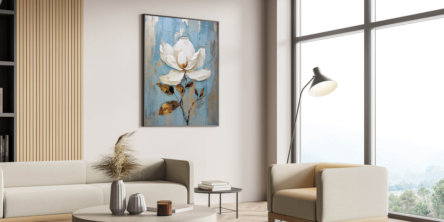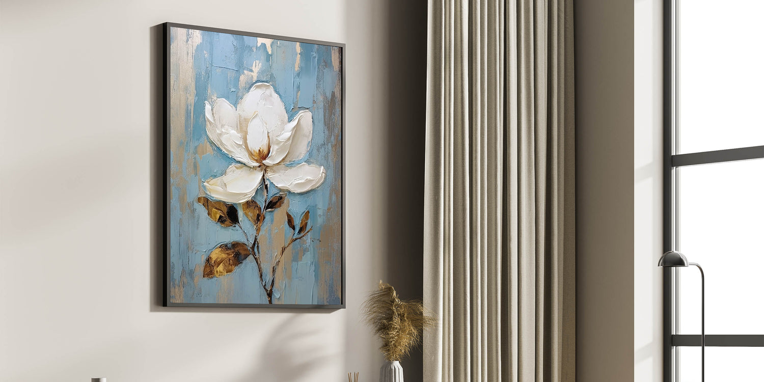 Elevate your home decor with this stunning floral glam wall art, featuring a beautifully textured white flower set against a soft blue and gold background. The delicate petals and rich, earthy tones of the leaves add a sense of elegance and tranquility to any space. This piece effortlessly blends modern sophistication with natural beauty, making it an ideal choice for chic and glam-inspired interiors.