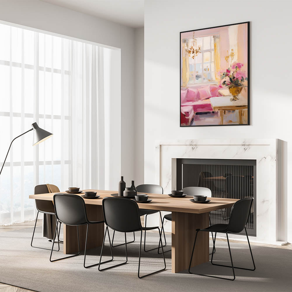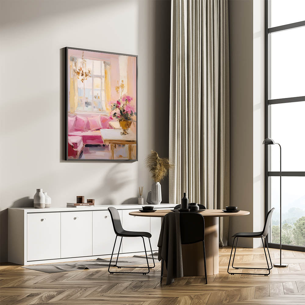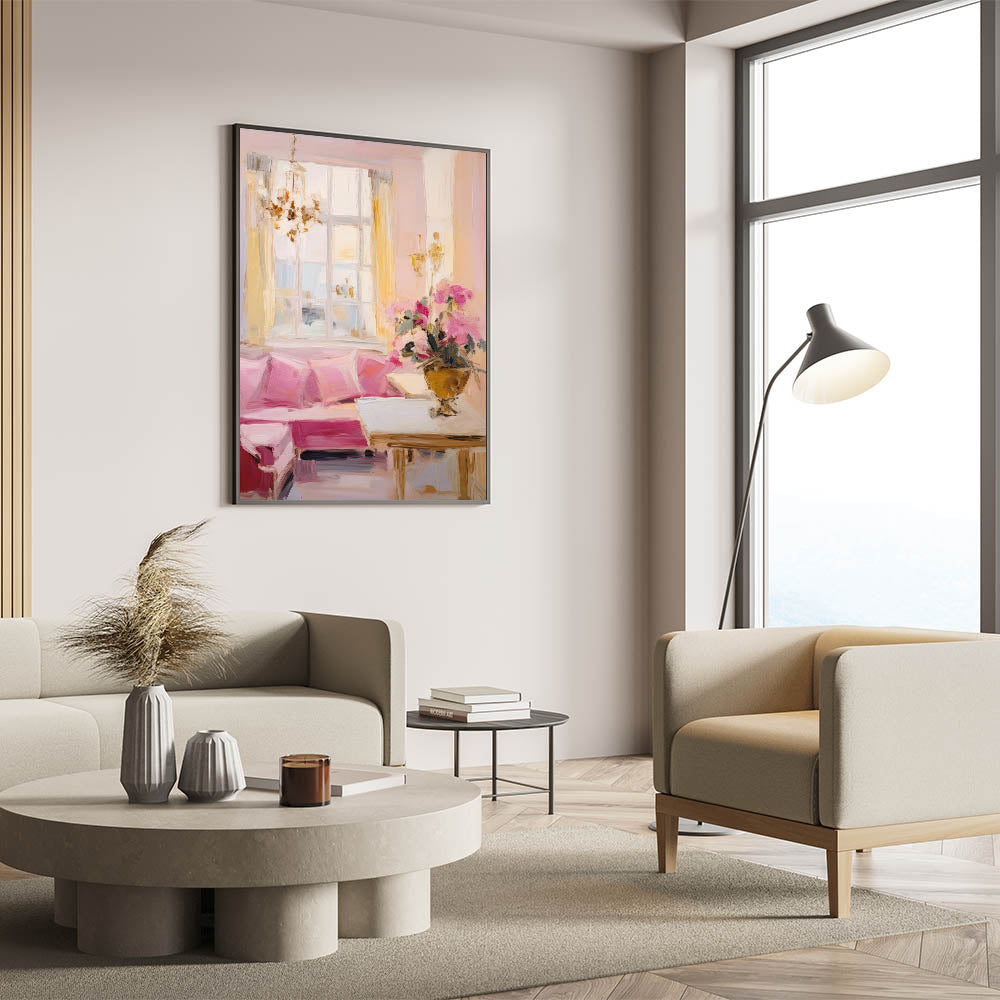 This elegant electric wall art piece captures the essence of a classic, beautifully lit room adorned with pastel hues and luxurious details. The soft pinks of the sofa, complemented by the light yellows of the curtains and the gentle white tones of the window, evoke a warm and inviting ambiance. A sophisticated floral arrangement adds a touch of refinement, making this artwork a perfect choice for spaces that seek to convey elegance and comfort. The artwork's soft brushstrokes and impressionistic style bring a sense of movement and life, making it ideal for living rooms, bedrooms, or lounges where a serene and classy atmosphere is desired.