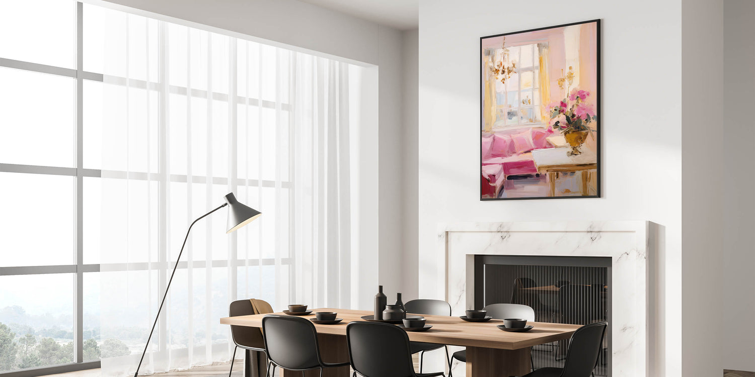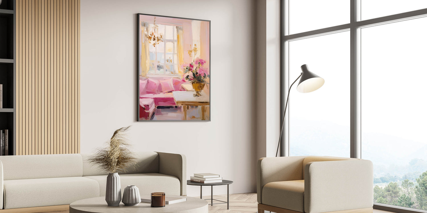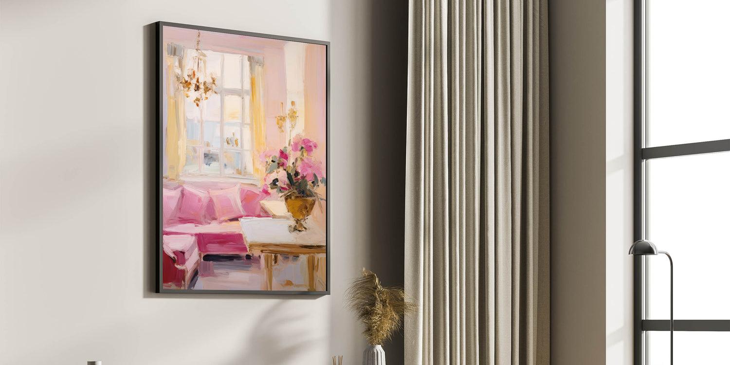 This elegant electric wall art piece captures the essence of a classic, beautifully lit room adorned with pastel hues and luxurious details. The soft pinks of the sofa, complemented by the light yellows of the curtains and the gentle white tones of the window, evoke a warm and inviting ambiance. A sophisticated floral arrangement adds a touch of refinement, making this artwork a perfect choice for spaces that seek to convey elegance and comfort. The artwork's soft brushstrokes and impressionistic style bring a sense of movement and life, making it ideal for living rooms, bedrooms, or lounges where a serene and classy atmosphere is desired.