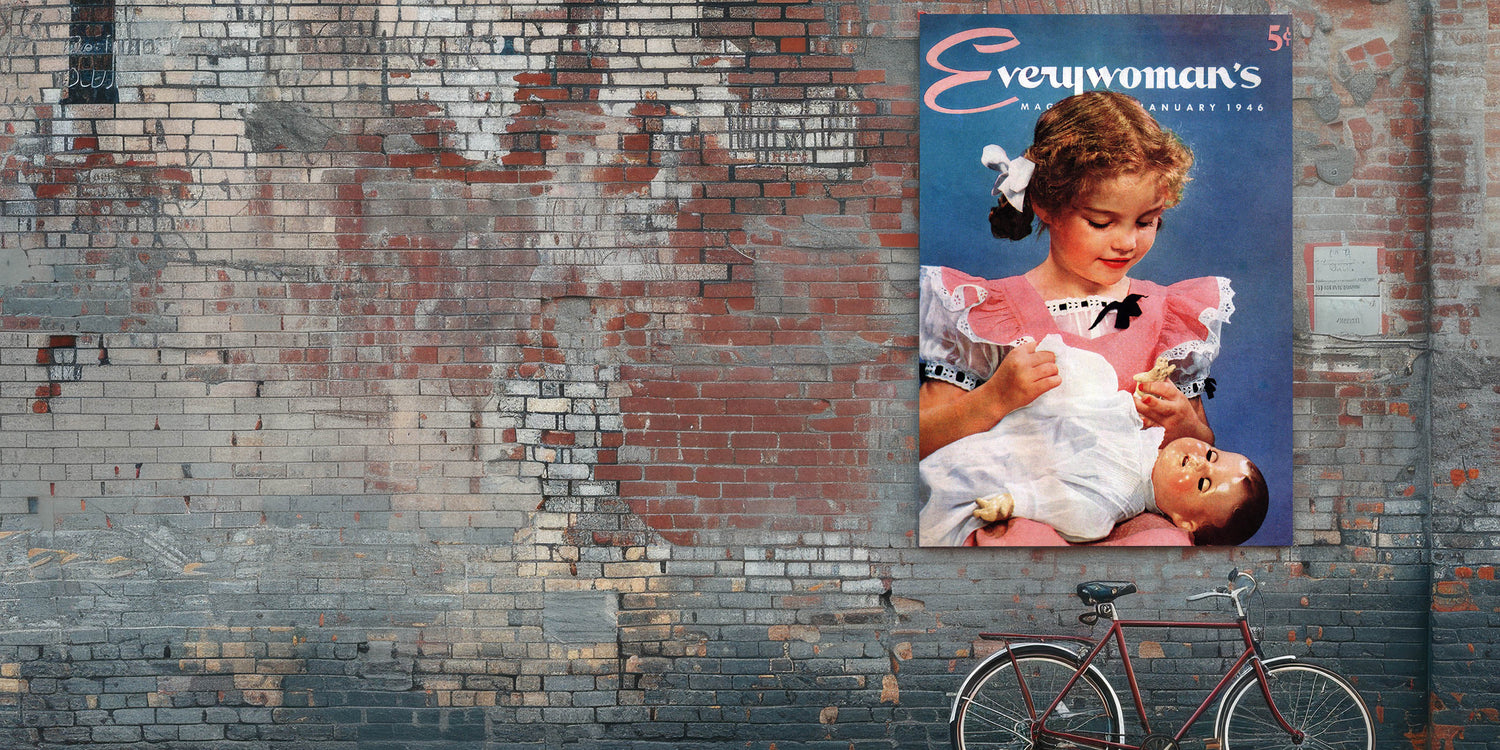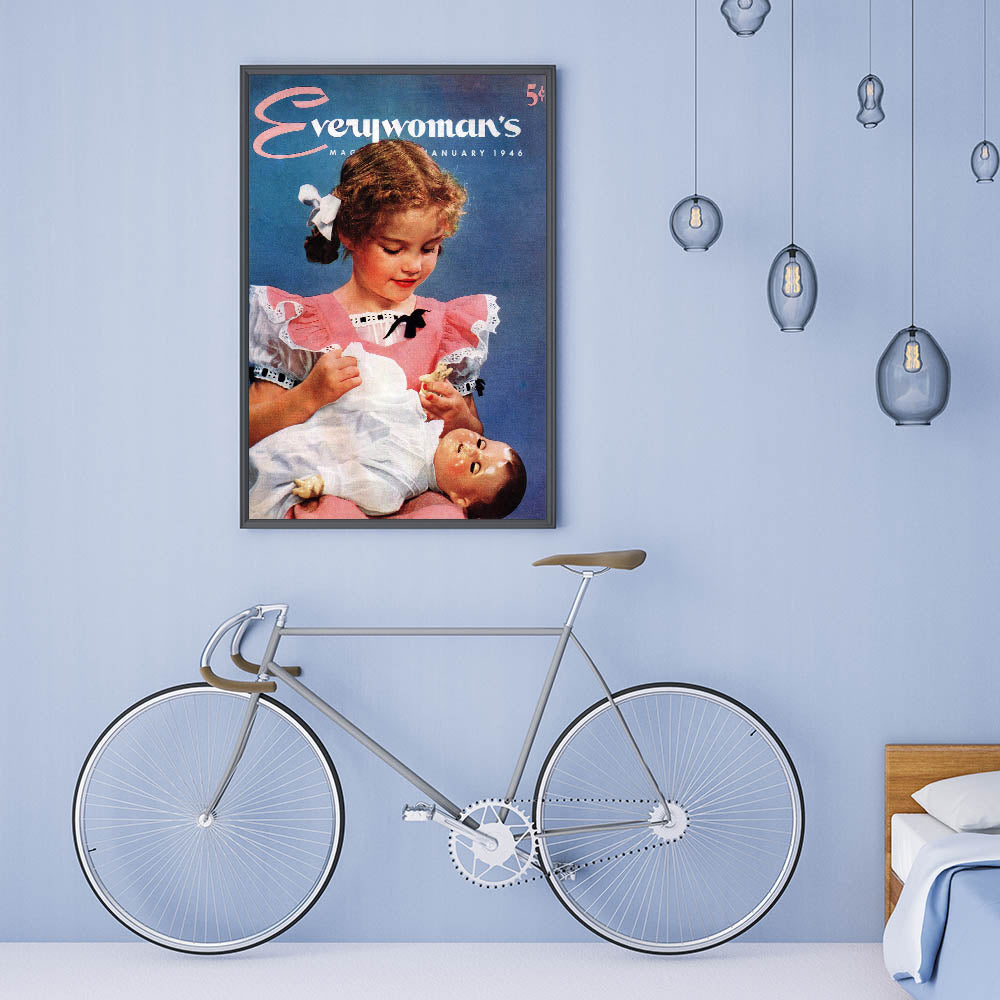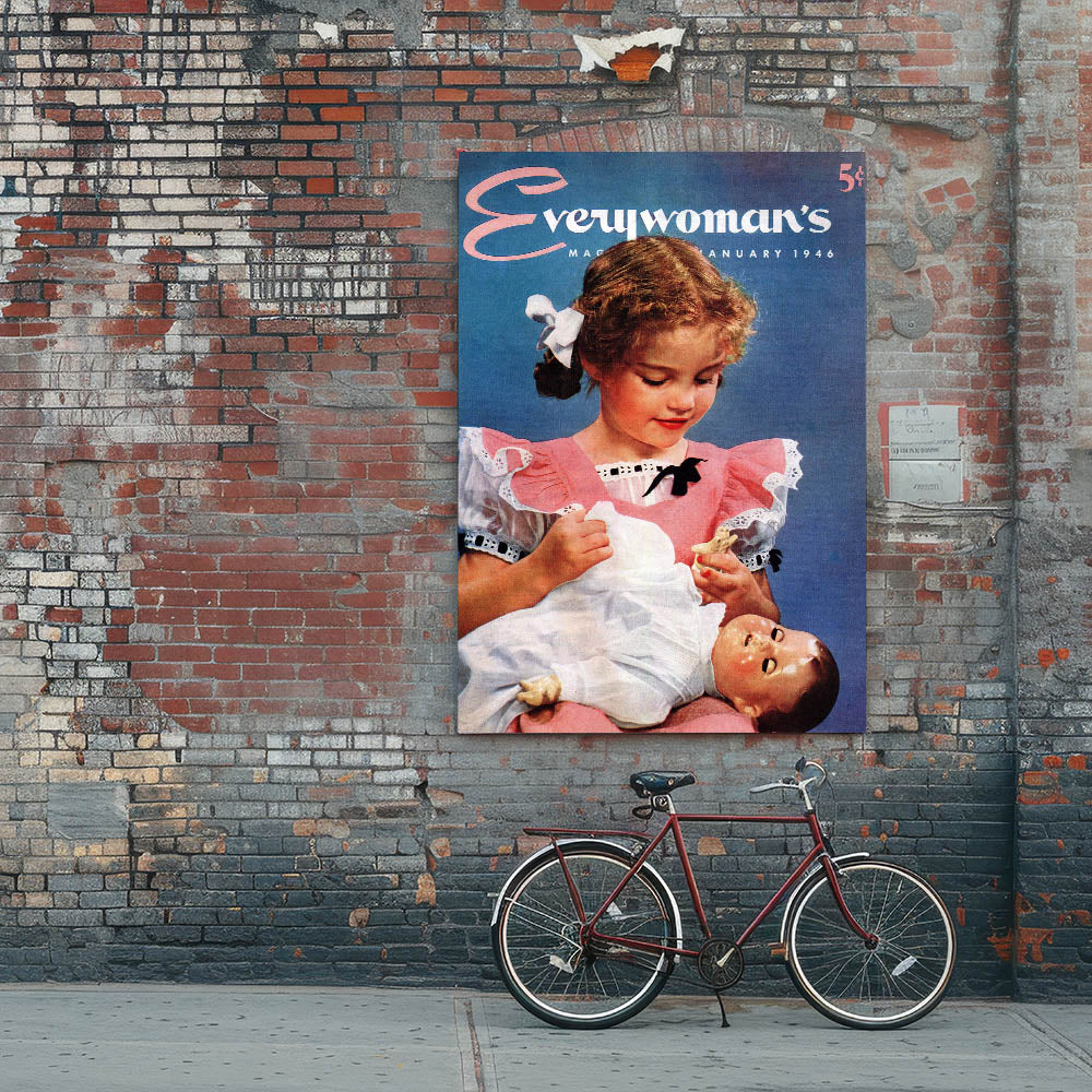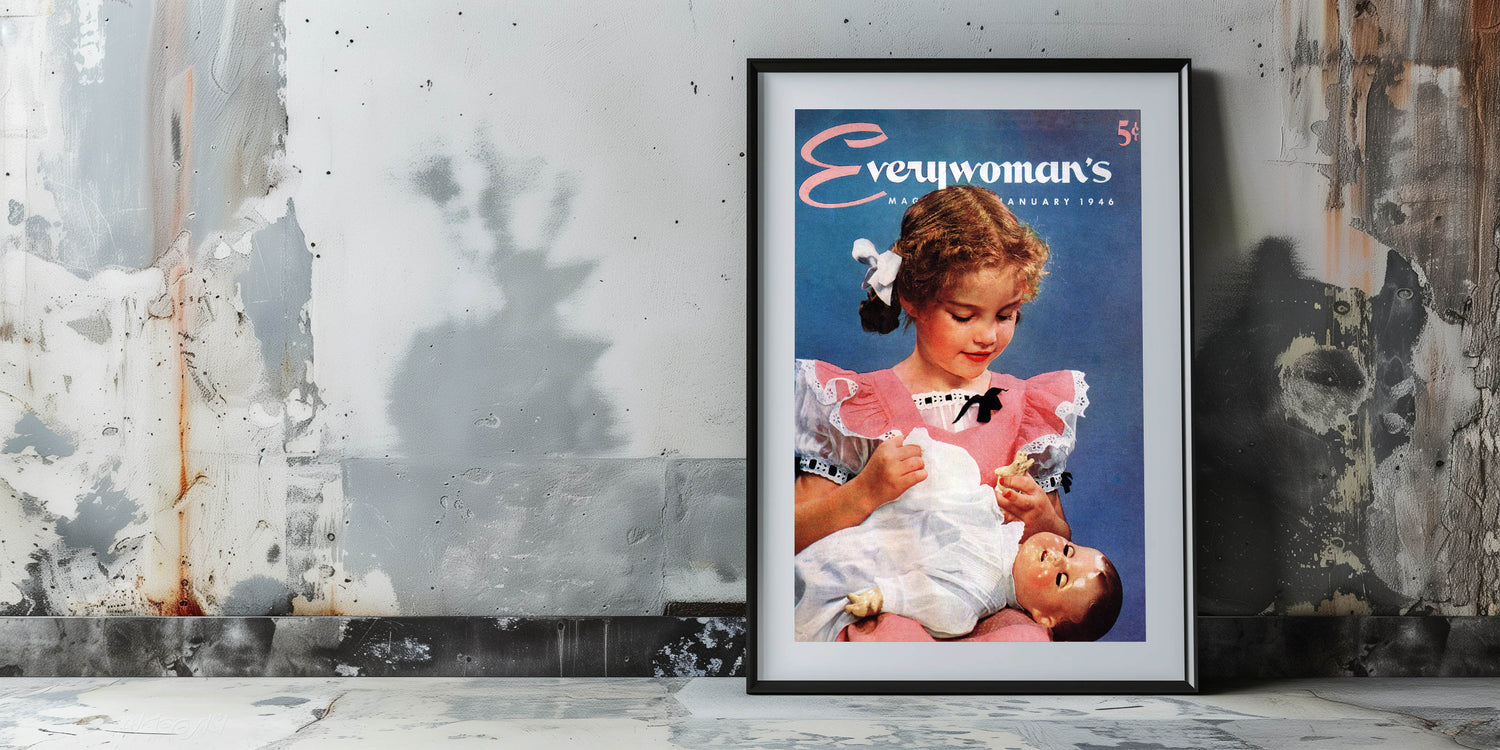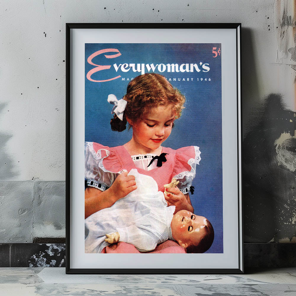 Step back in time with this charming vintage magazine cover wall art from Everywoman’s Magazine, January 1946 edition. This classic magazine cover artwork beautifully captures nostalgia with a heartwarming scene of a young girl cradling her beloved doll. The soft pastel tones, delicate lace details, and vintage fashion make it an iconic piece of retro prints for home decor.