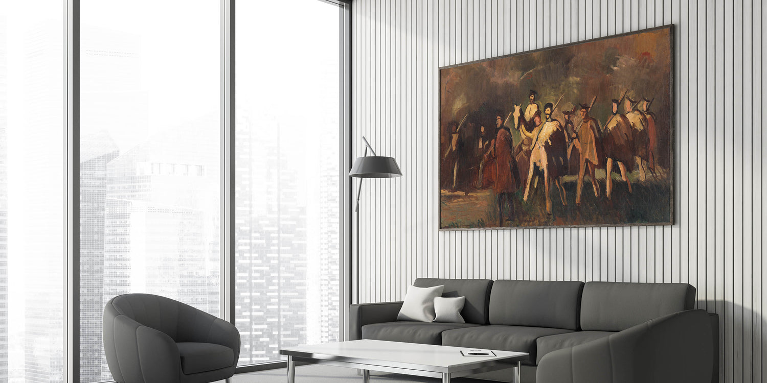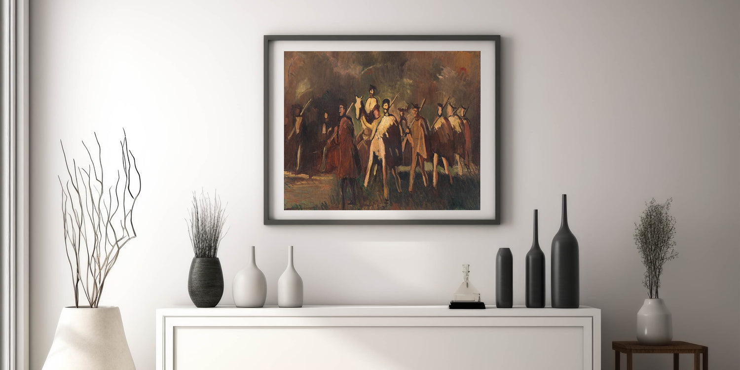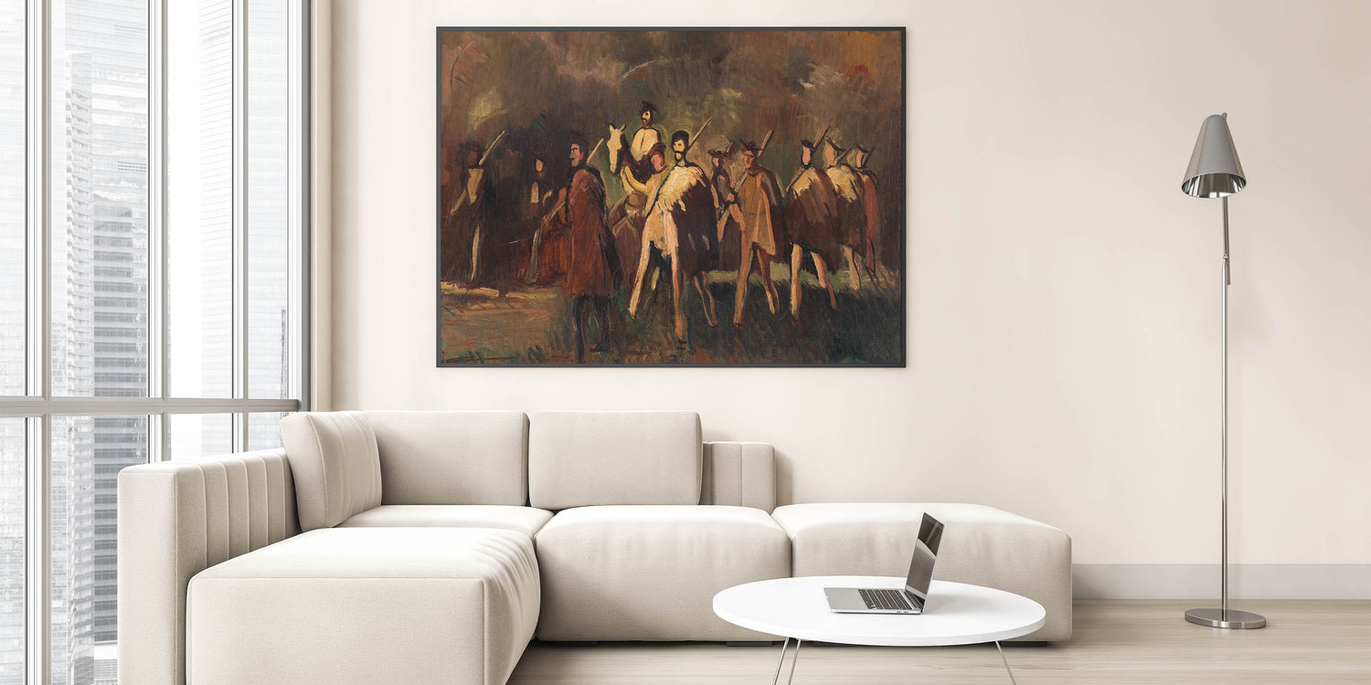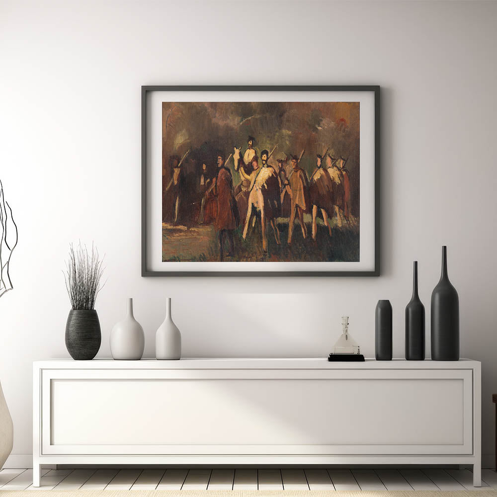 Introduce a sense of drama and movement to your walls with "Expedition," a compelling piece of abstract modern art. This contemporary artwork by Cyprián Majerník portrays a group of figures marching through a moody and atmospheric setting, using earthy tones and expressive strokes to convey strength and unity. Perfect for trendy home decor enthusiasts looking to make a bold statement.