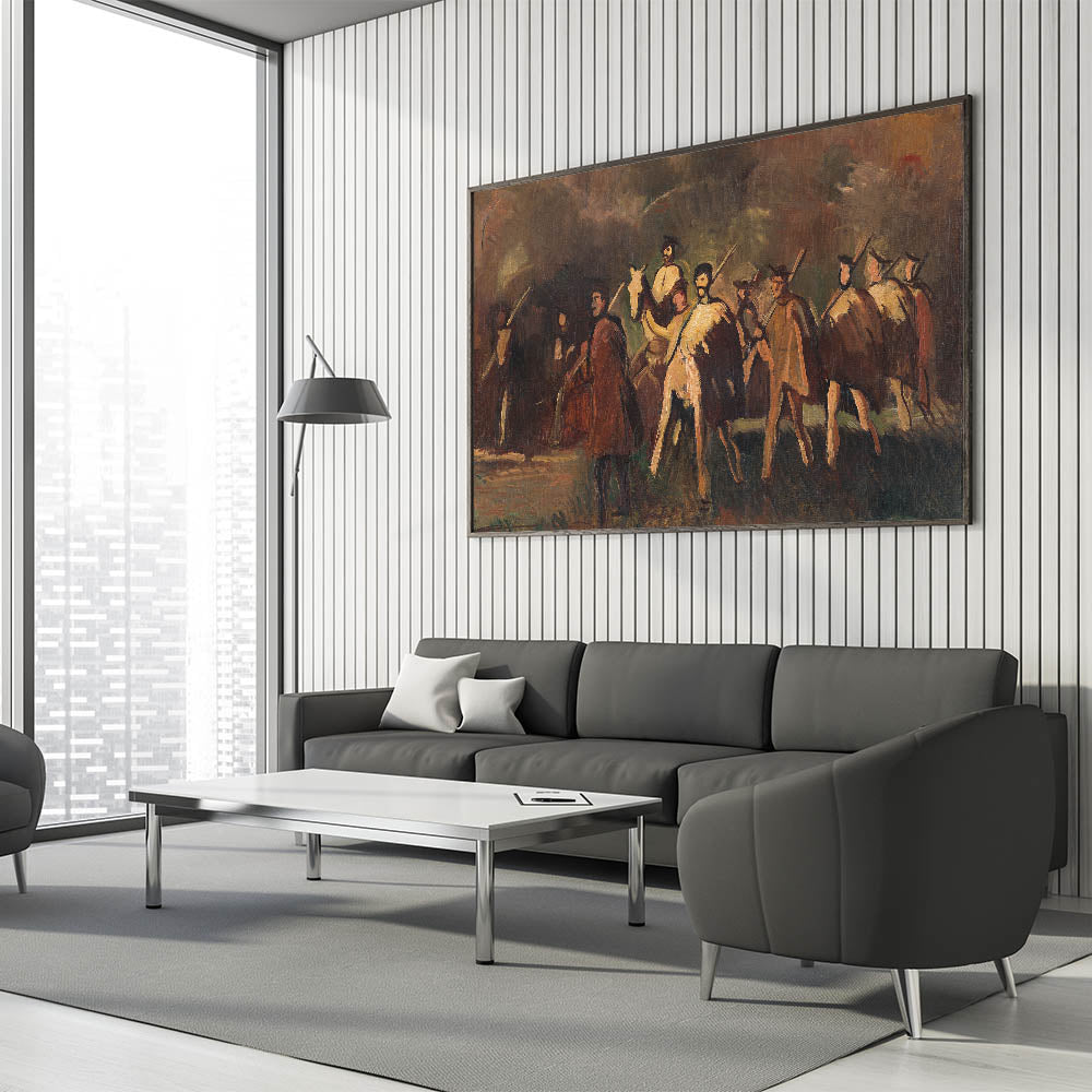 Celebrate the fusion of timeless themes with contemporary aesthetics in "Expedition." This unique modern art piece invites a sense of strength and solidarity, making it a conversation starter and a focal point for any space.