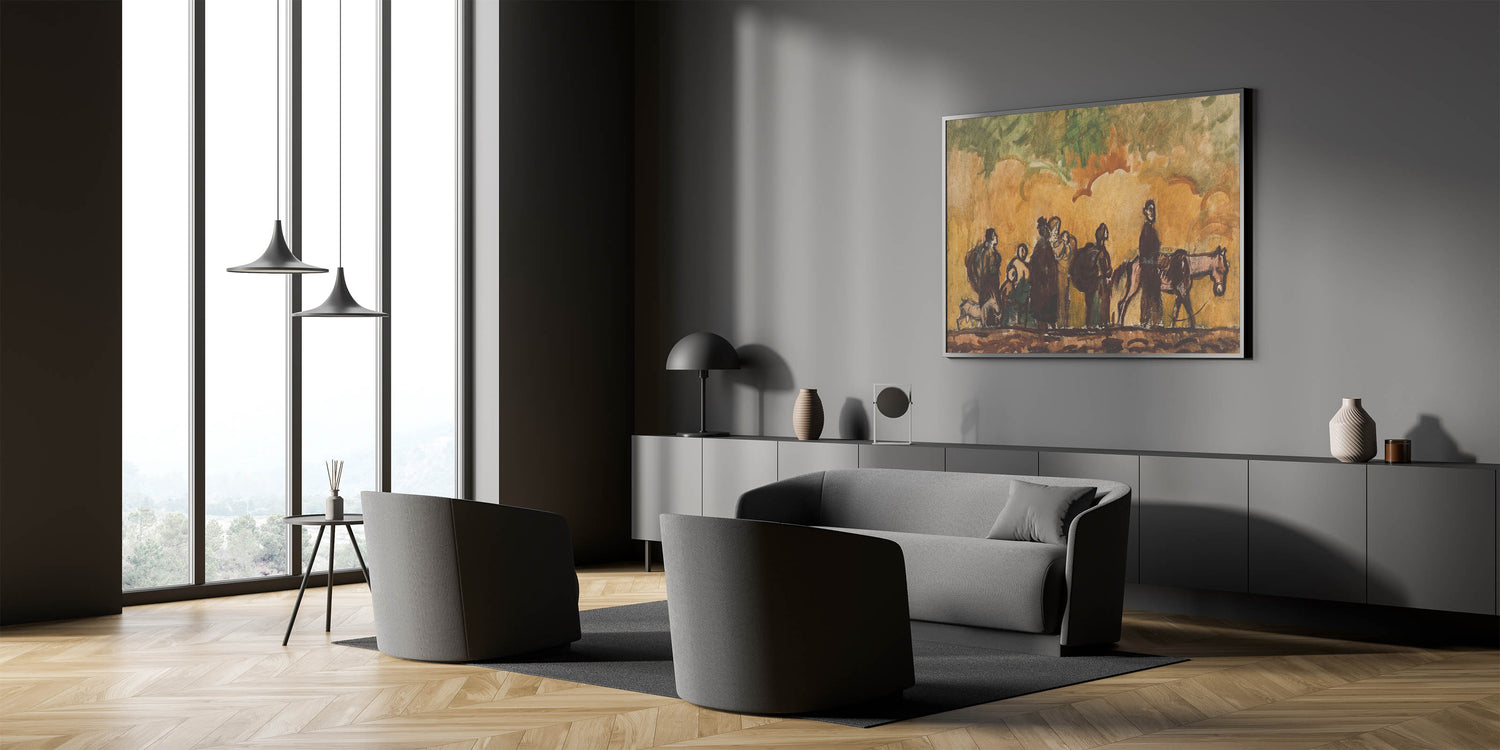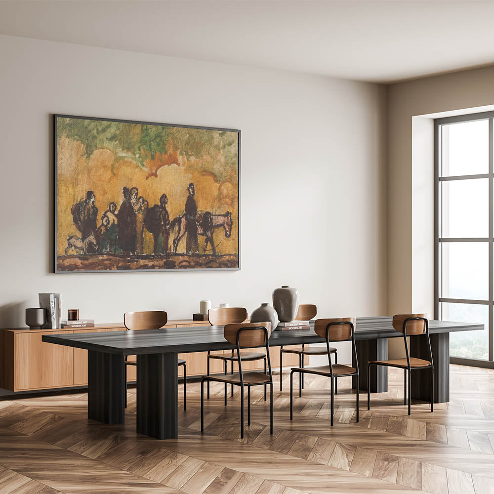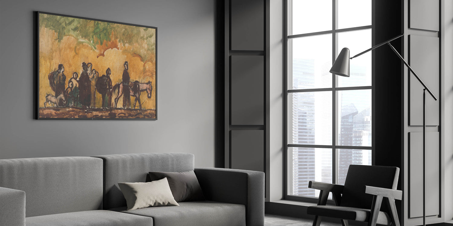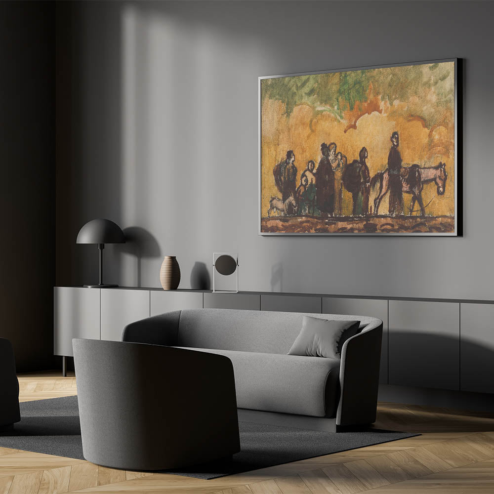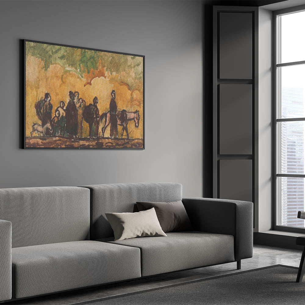 Add a profound narrative to your art collection with Refugees with Horses by Cyprián Majerník. This evocative Expressionist piece captures a group of travelers on a journey, accompanied by their horses, under a swirling sky of warm tones. The earthy color palette and dynamic brushstrokes highlight themes of resilience and survival, making it a deeply moving representation of human perseverance. Ideal for collectors of emotive and impactful art, this piece is a testament to the power of storytelling through Expressionism.