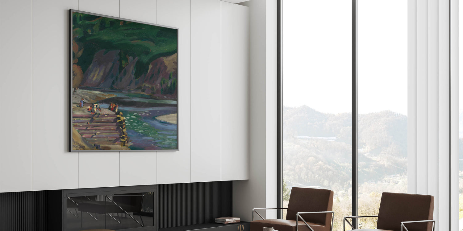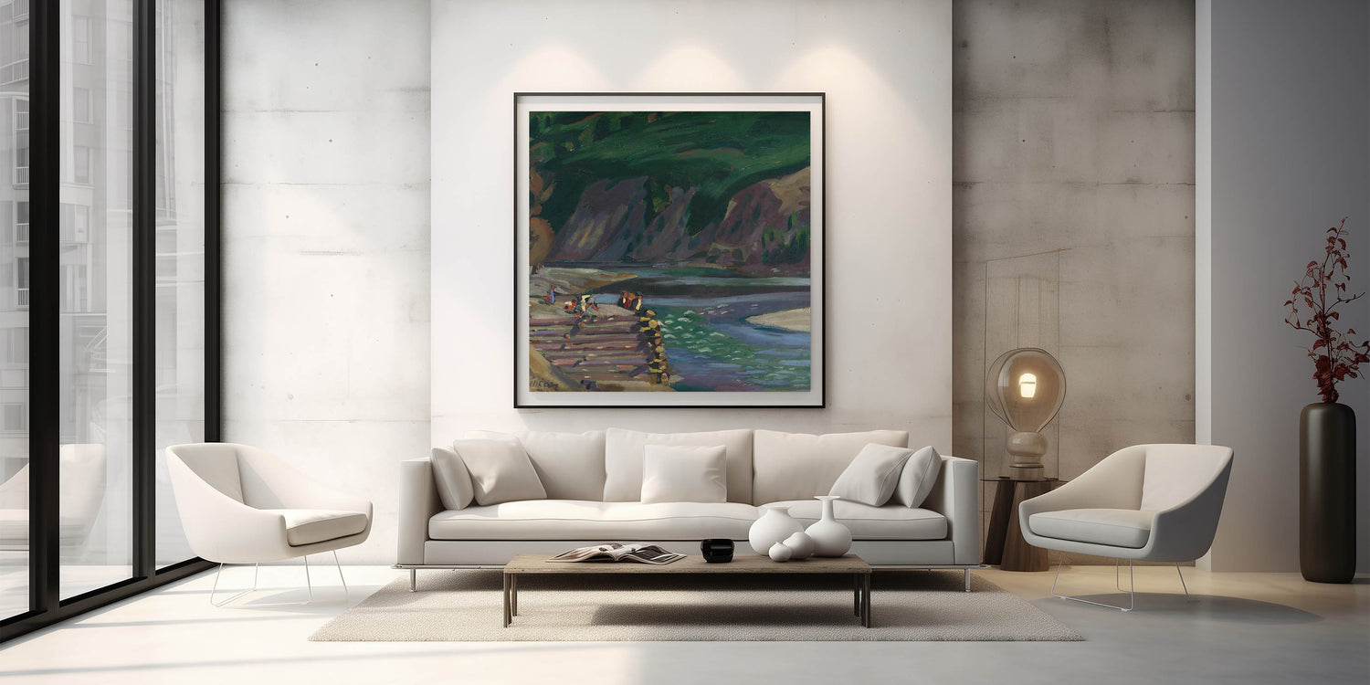 Experience the serene beauty of Expressionism Wall Art with this captivating depiction of a river scene in the Dolný Kubín landscape. This artwork, rendered in the bold and emotive style of Modern Expressionism, features a tranquil riverside setting with rolling hills, lush greenery, and villagers going about their day. The dynamic brushstrokes and rich color palette evoke a sense of movement and connection to nature, making it a timeless addition to any art collection.