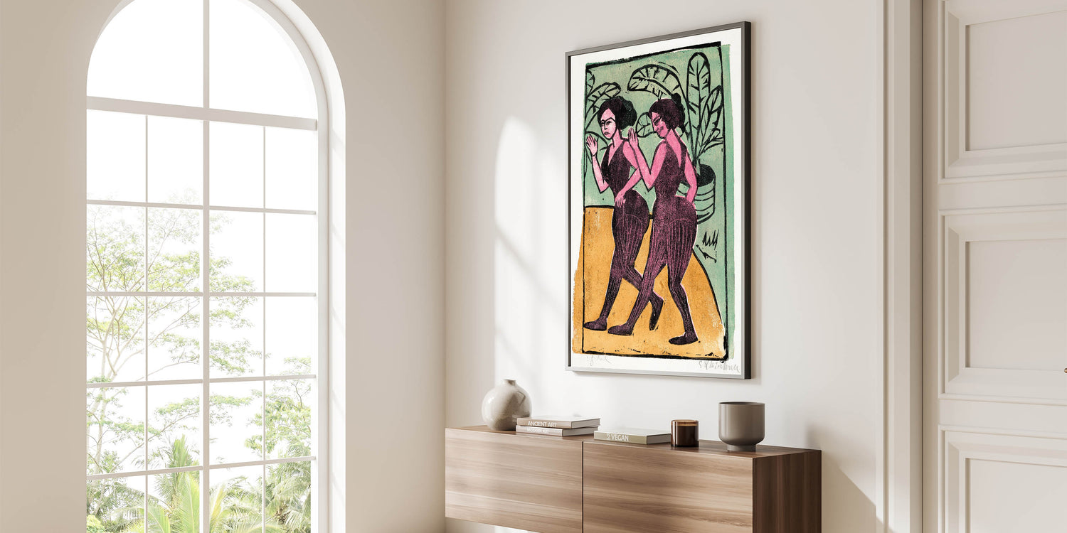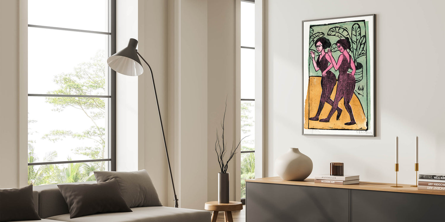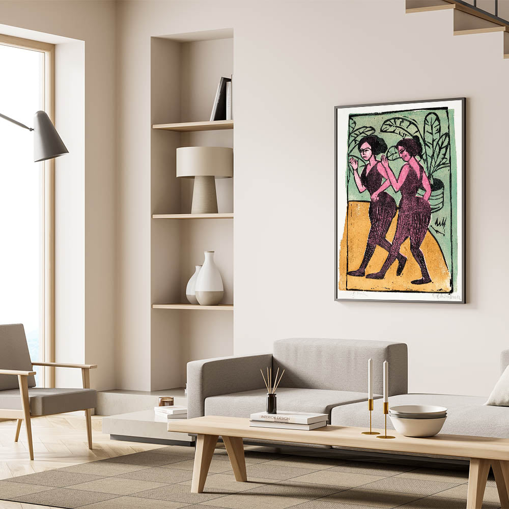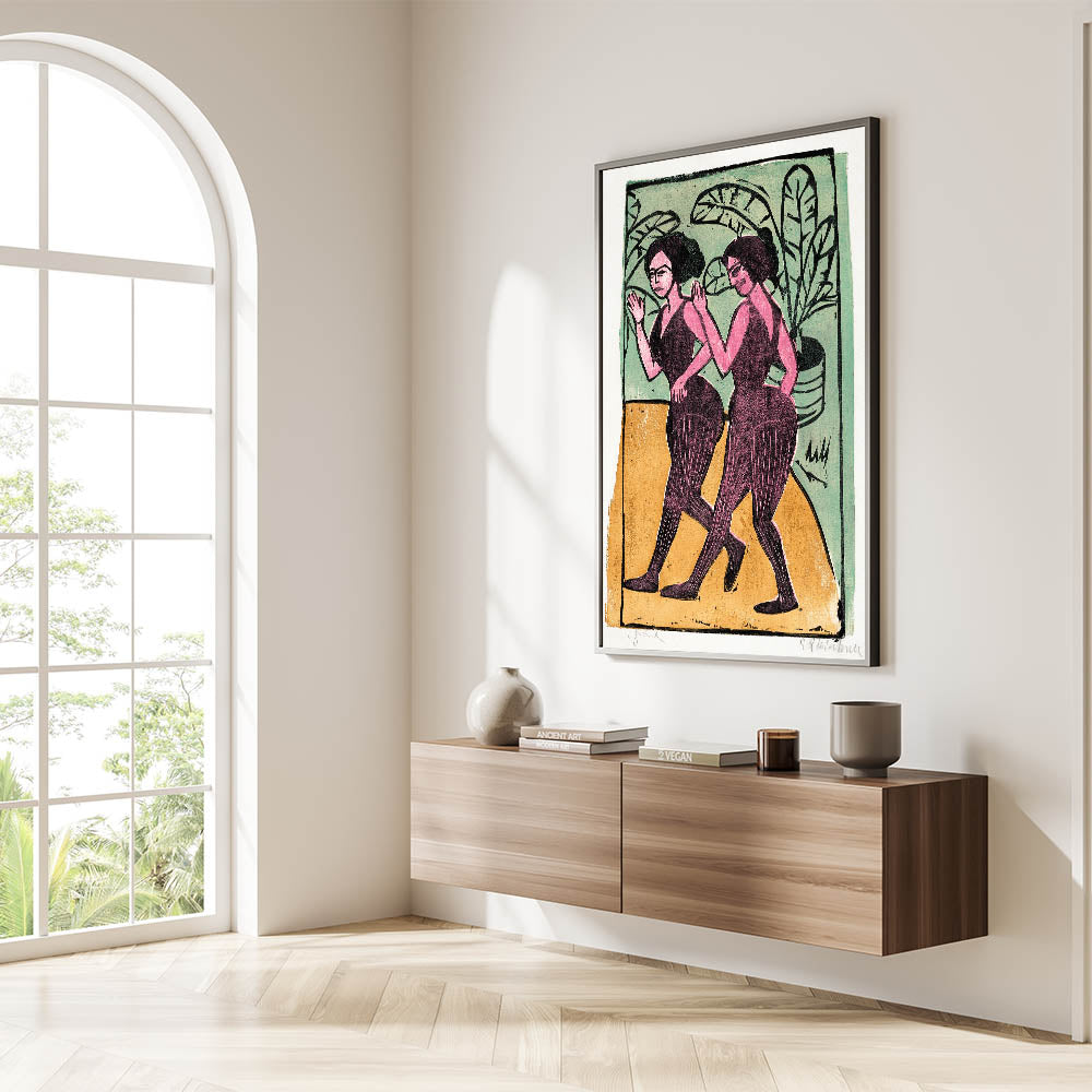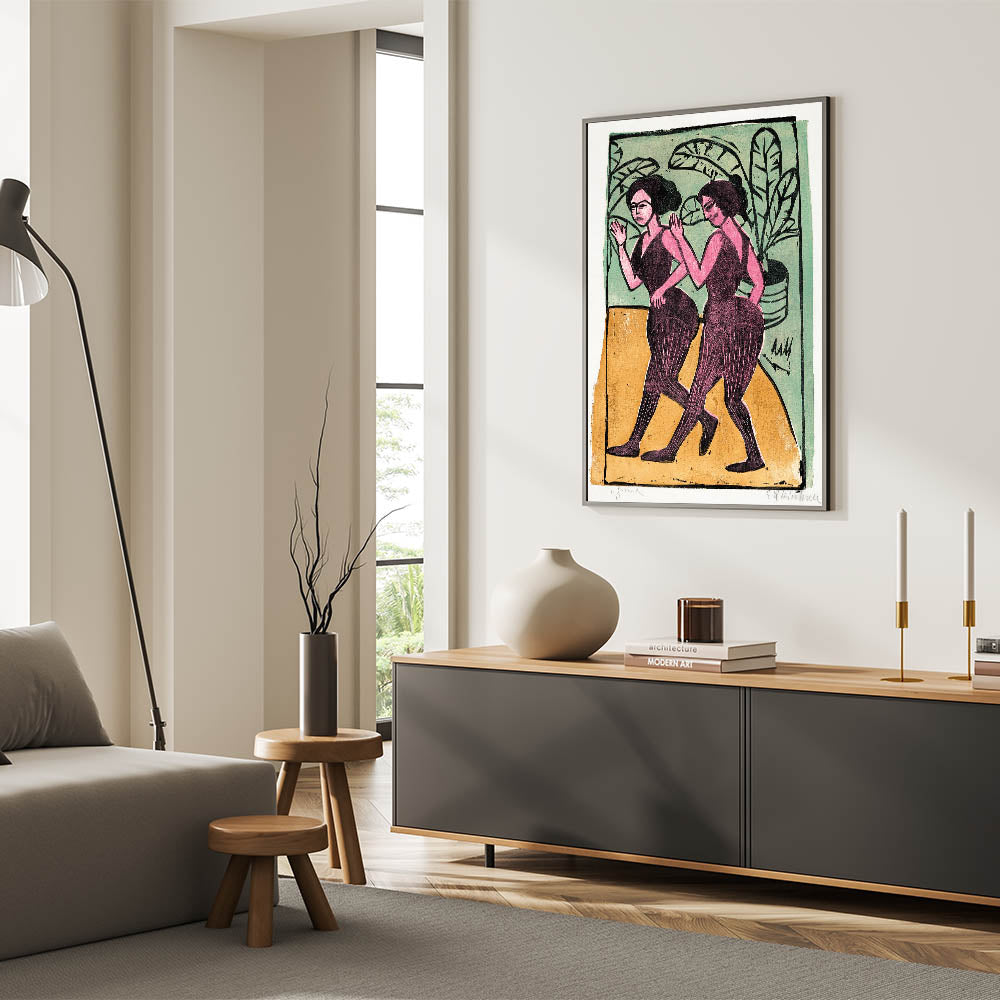 Celebrate the dynamic energy of Expressionism with Ernst Ludwig Kirchner's English Step Dancers. This vibrant artwork captures two dancers in bold, angular forms with expressive brushstrokes that highlight movement and emotion. The lively color palette of pinks, greens, and yellows adds a sense of rhythm and vitality, making this piece a standout addition to any modern or eclectic interior.