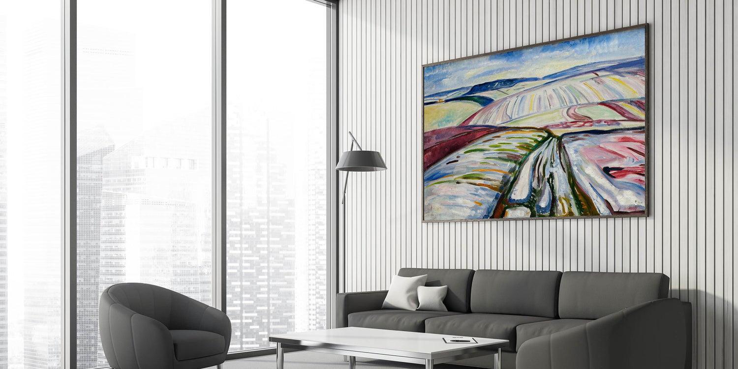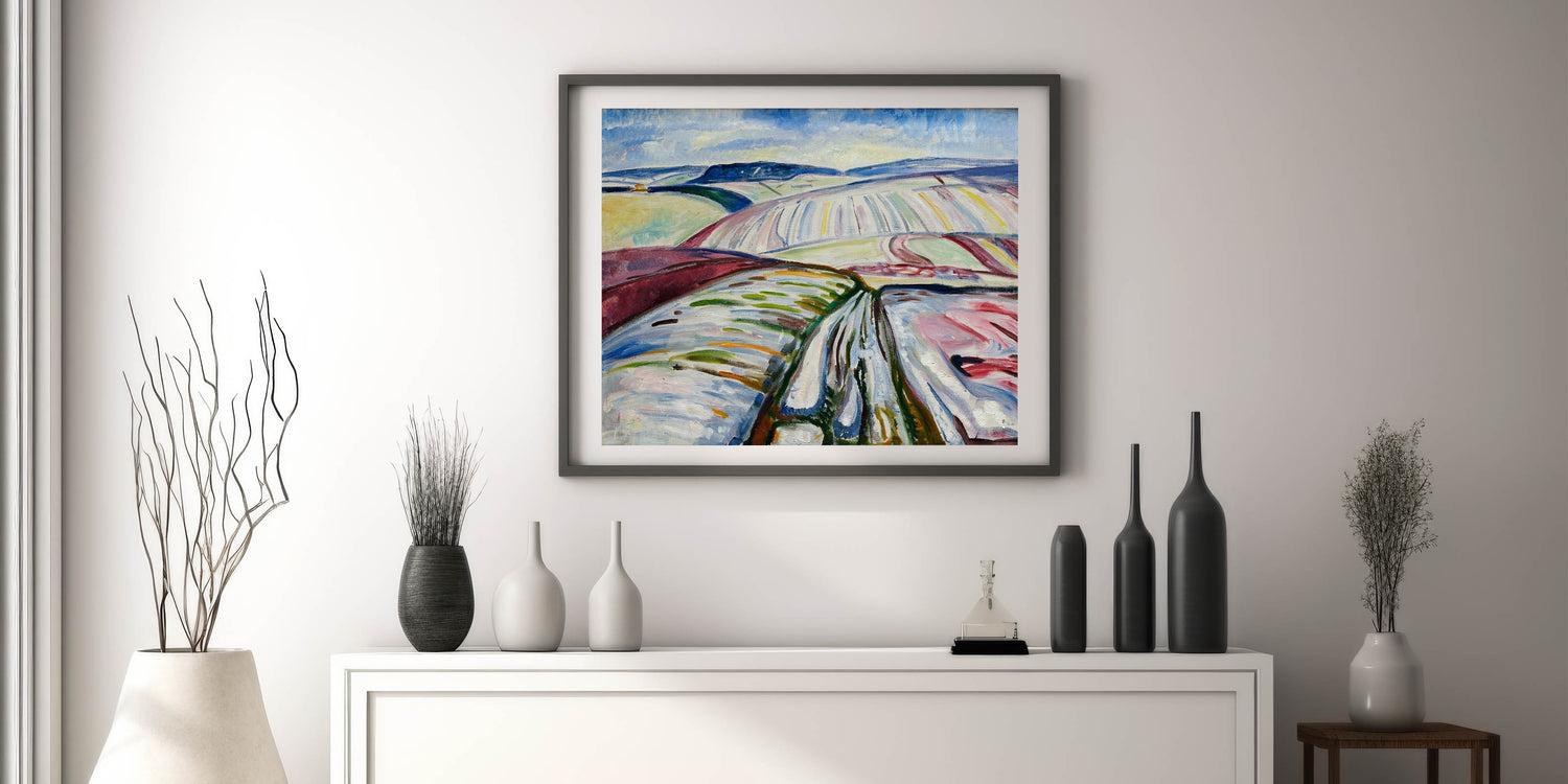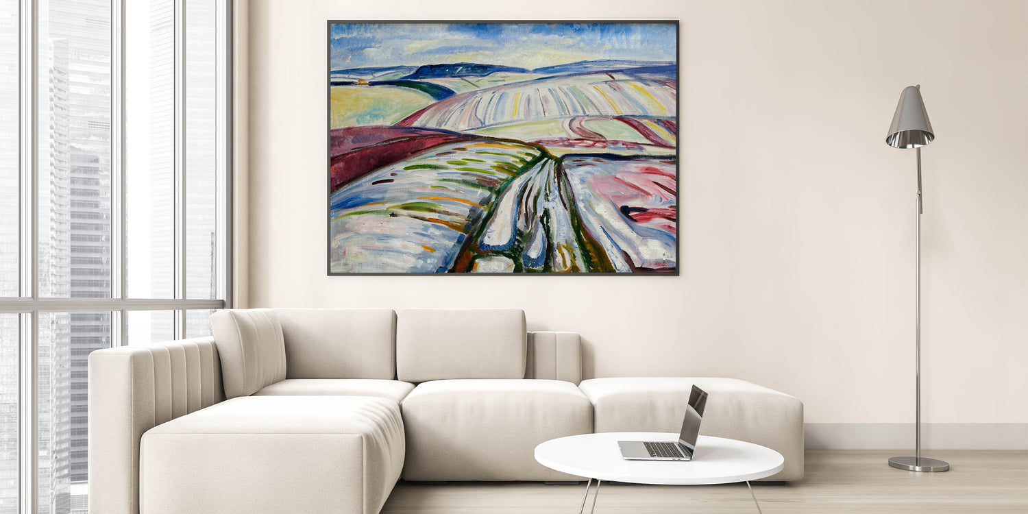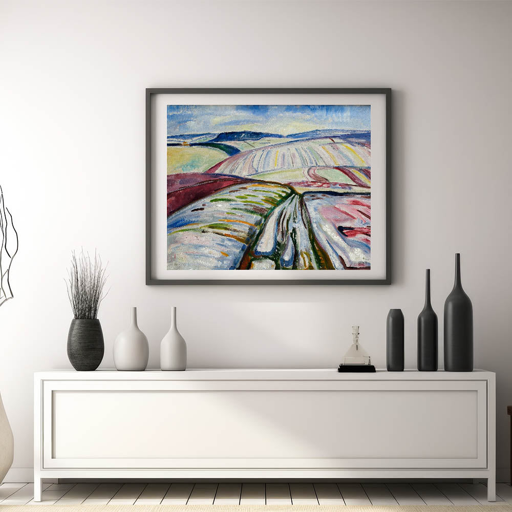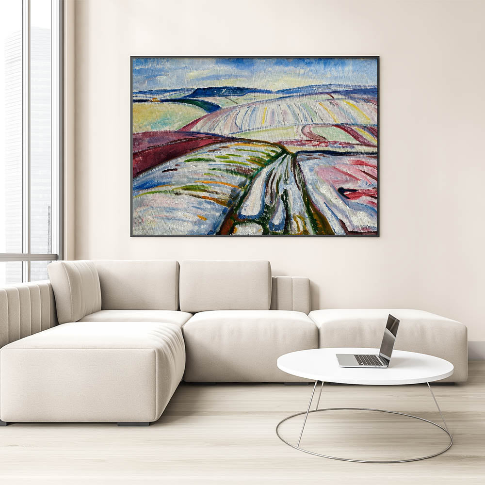 Transform your space with the tranquil beauty of Edvard Munch's "Field in Snow." This vibrant Expressionism painting captures the serenity of a snow-covered landscape, rendered in bold strokes and a harmonious palette of whites, greens, and warm earthy tones. As a prime example of Modern Expressionism, this piece evokes the quiet majesty of nature, offering a calming yet dramatic addition to any interior.