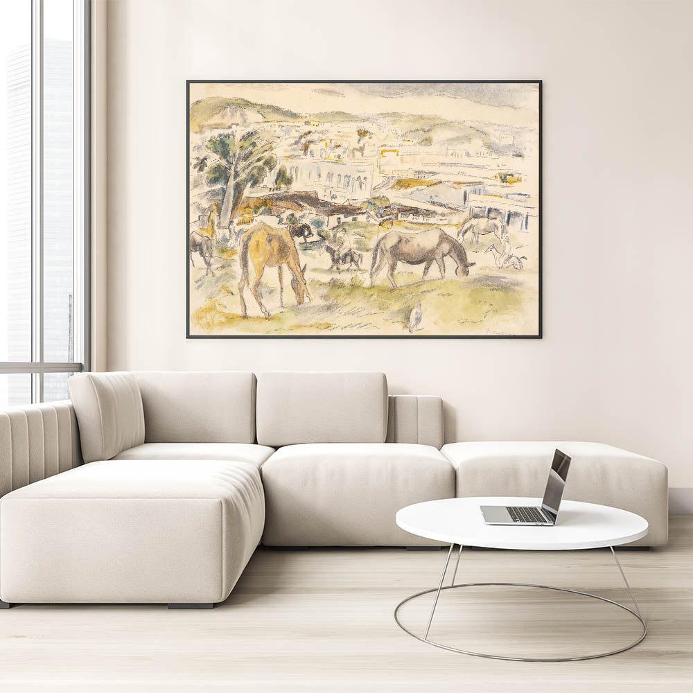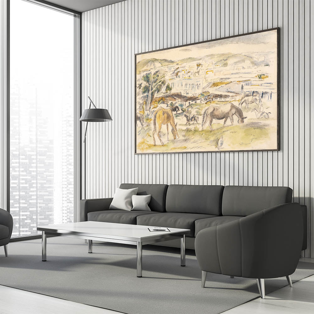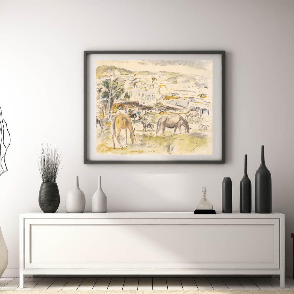 Experience the serene beauty of Expressionism with "Horses in Landscape" by Jules Pascin. This delicate yet evocative piece portrays grazing horses in a tranquil rural setting, bathed in soft earthy and pastel tones. Pascin's masterful use of expressive strokes and muted colors captures the essence of nature's harmony and simplicity.