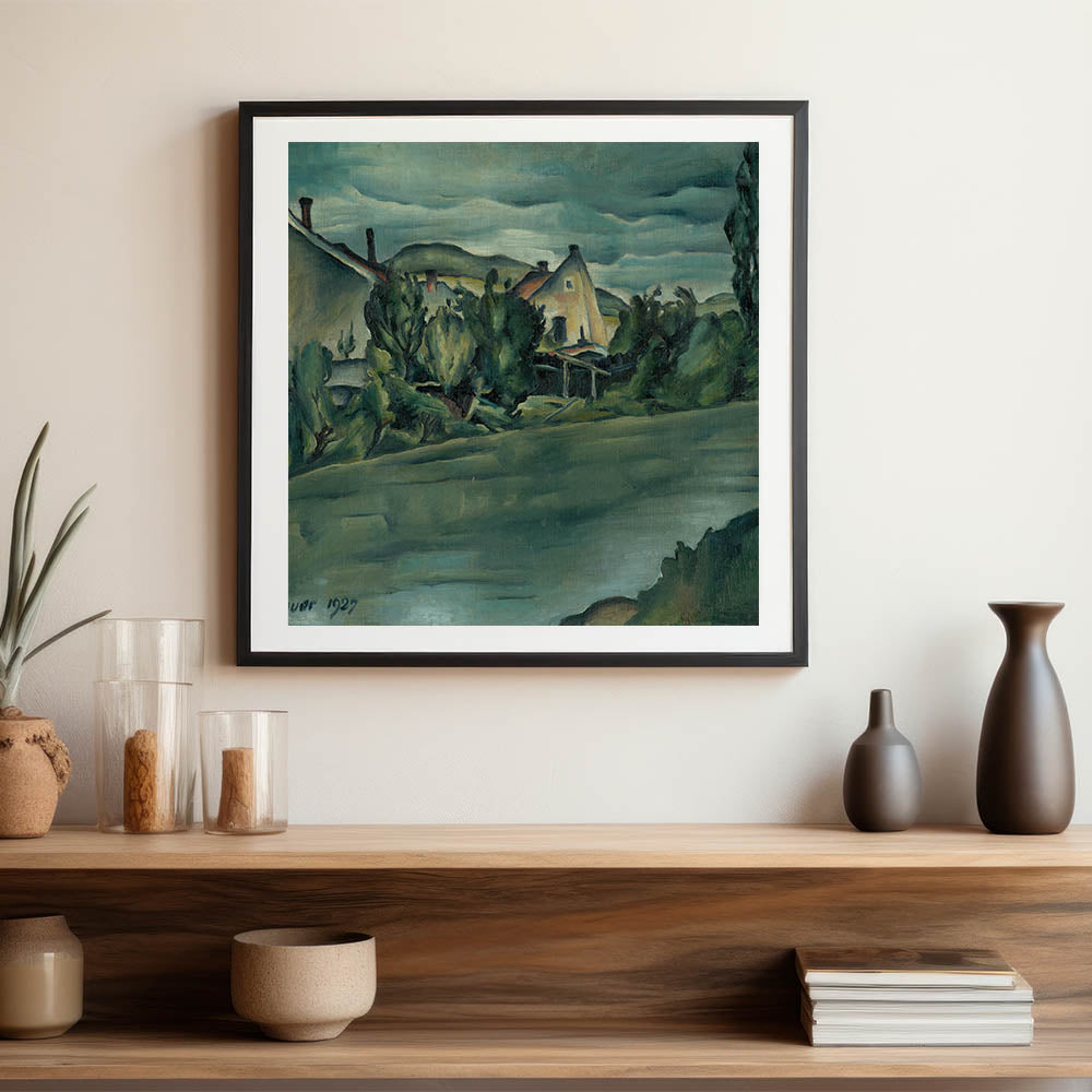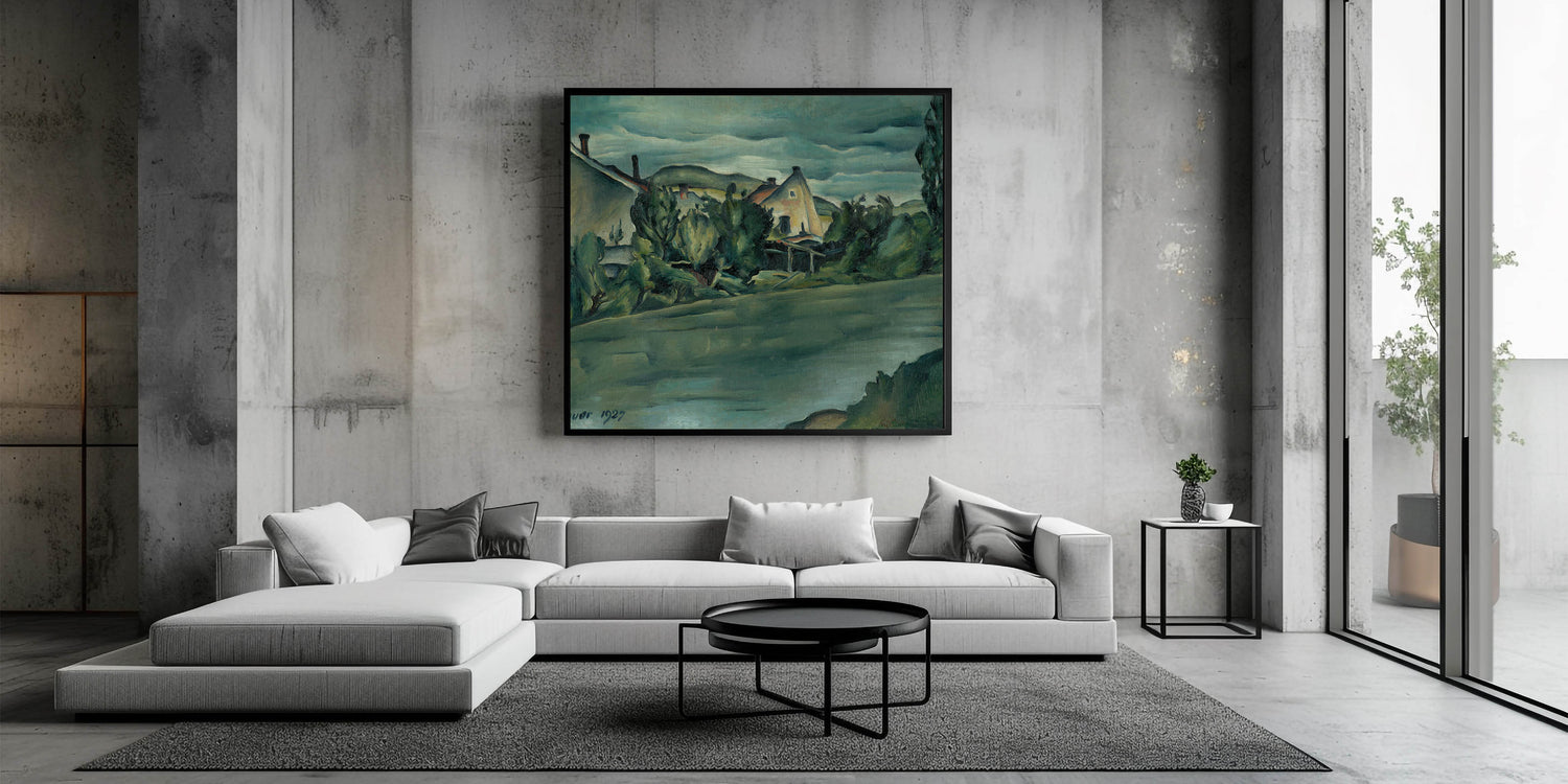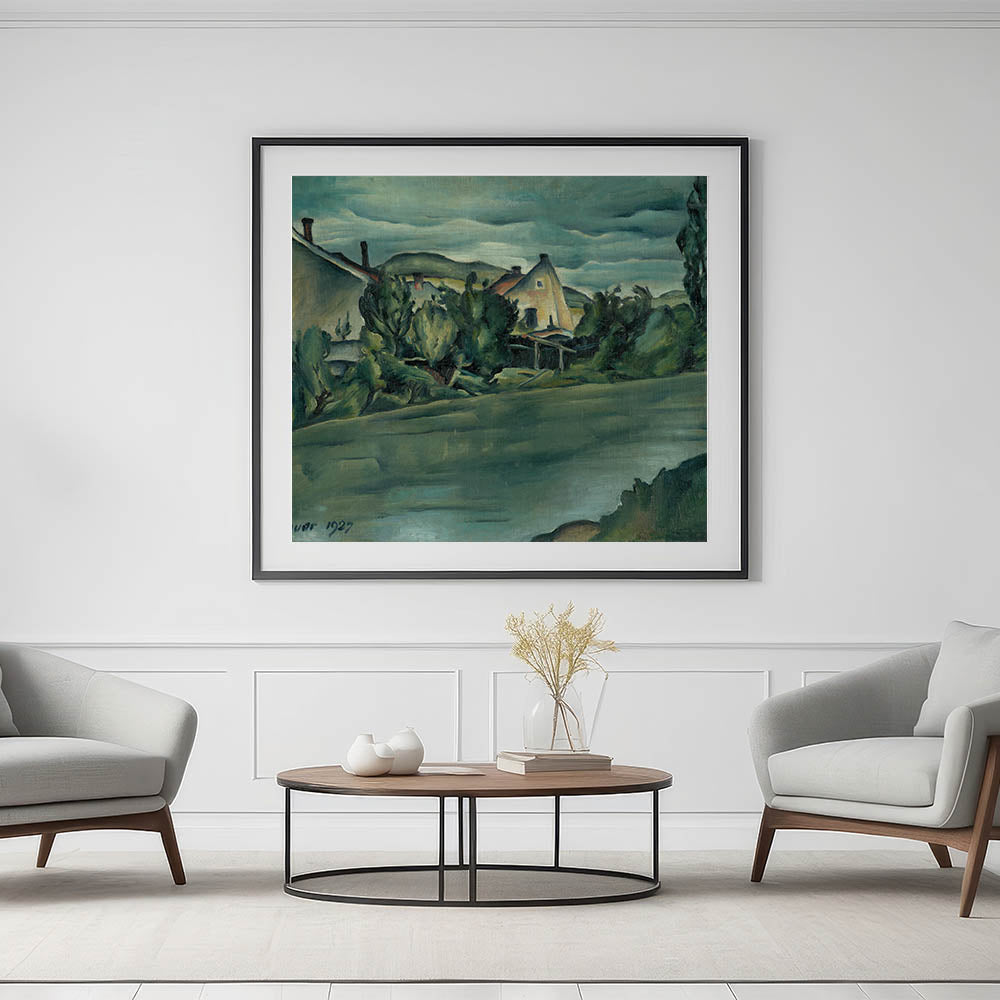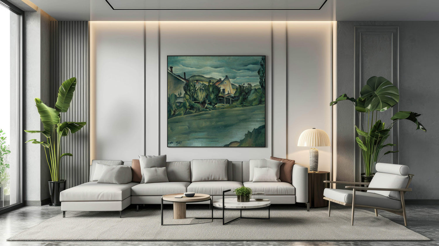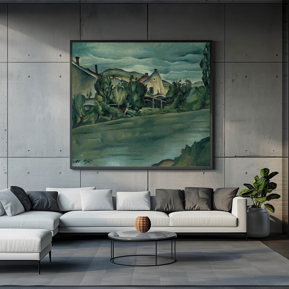 Experience the serene beauty of Řahanov Lines by Konštantín Bauer, a masterful Expressionist depiction of a quiet rural landscape. This piece captures the charm of a countryside scene, with rolling hills, quaint houses, and lush greenery painted in soft, muted tones of green and gray. The gentle brushstrokes and subtle gradation of colors evoke a sense of tranquility and timelessness, making it a perfect addition to any art collection.