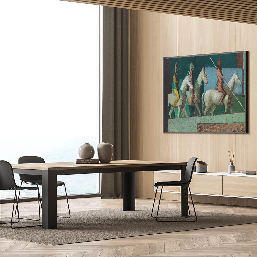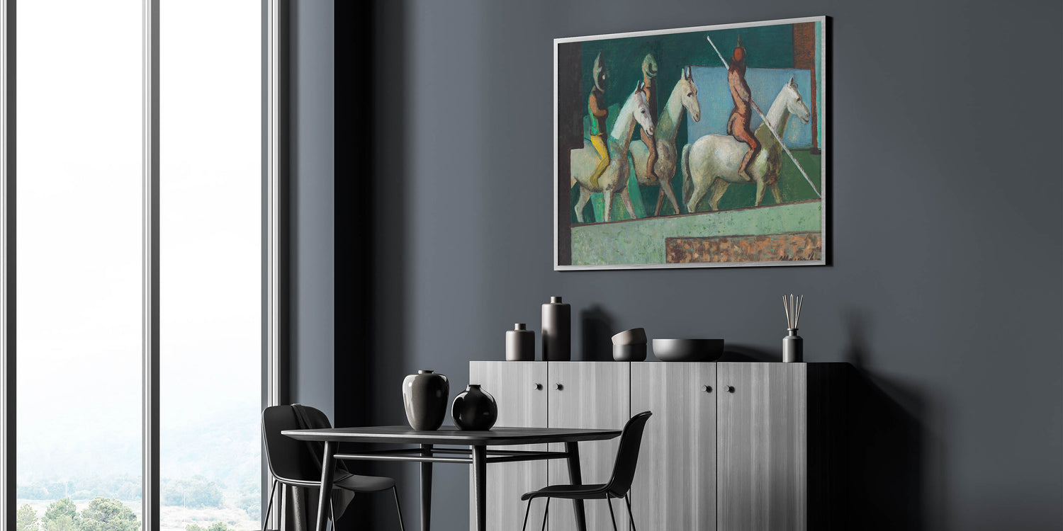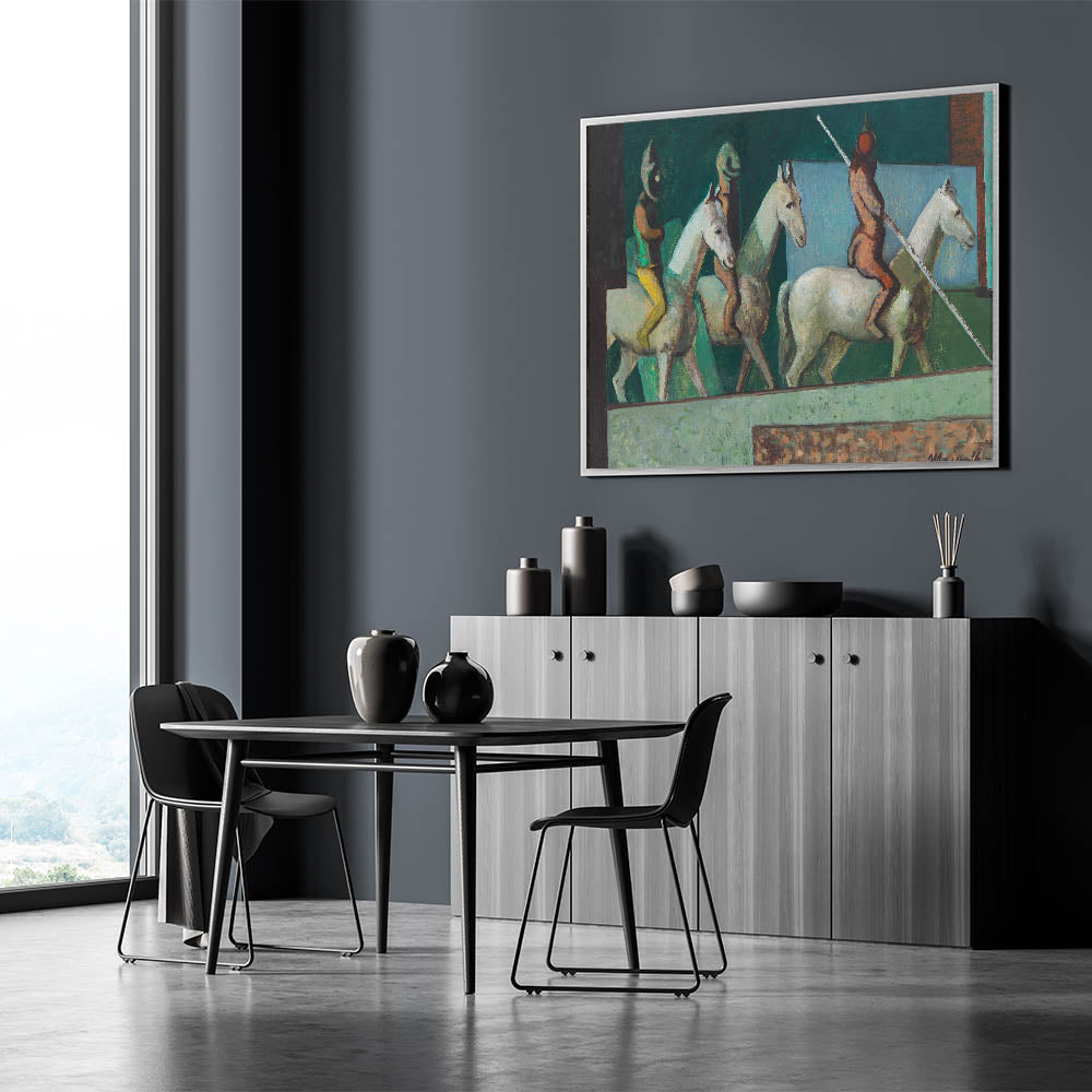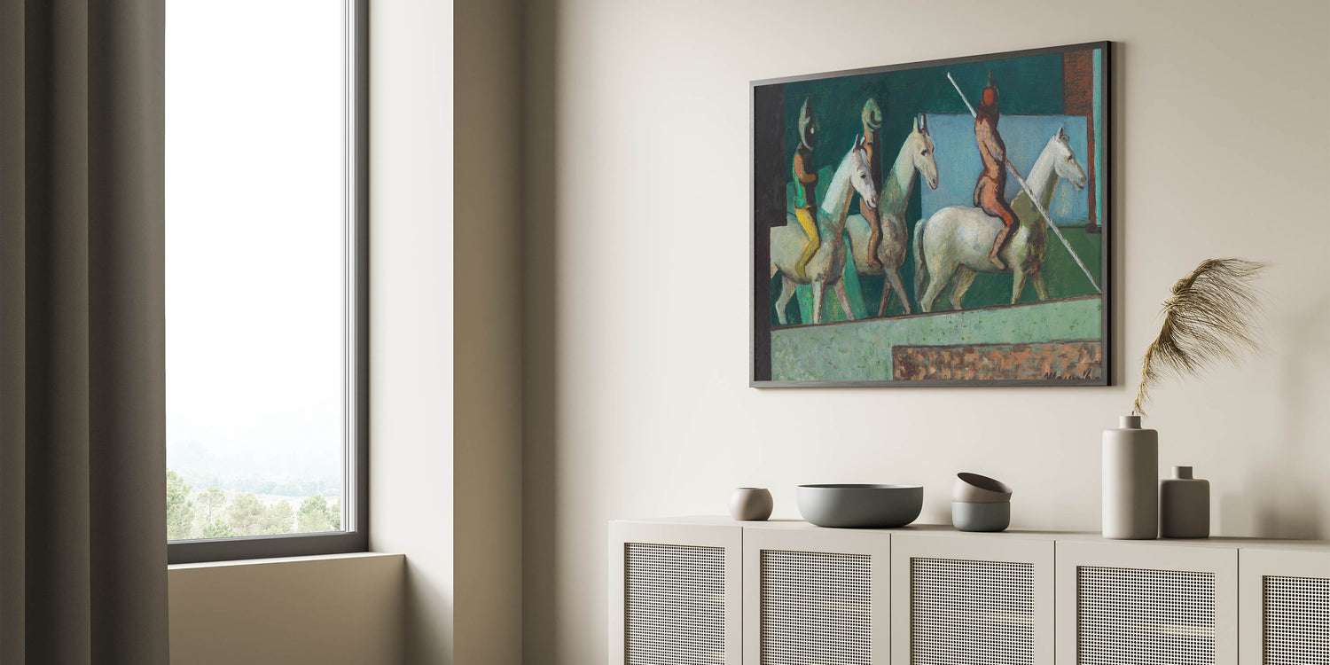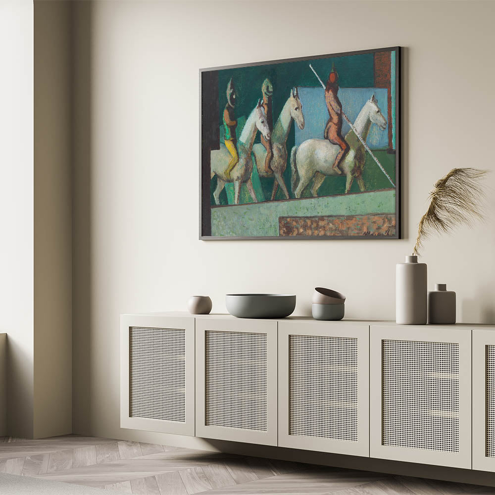 Immerse yourself in the structured elegance of Riders in Formation by Cyprián Majerník, an Expressionist artwork that merges abstraction with disciplined composition. The painting features a line of riders on white horses set against a striking green and blue backdrop, punctuated with vibrant reds and yellows. The bold geometry and expressive strokes convey movement and unity, making this piece a striking addition to any art collection.