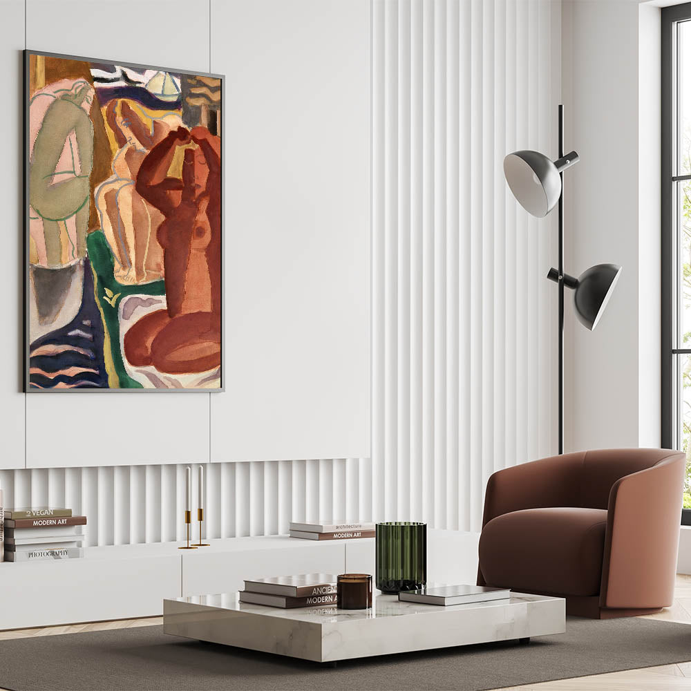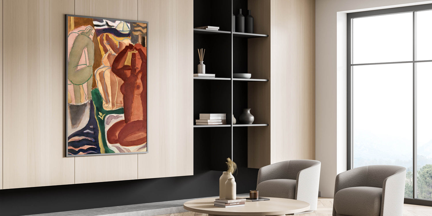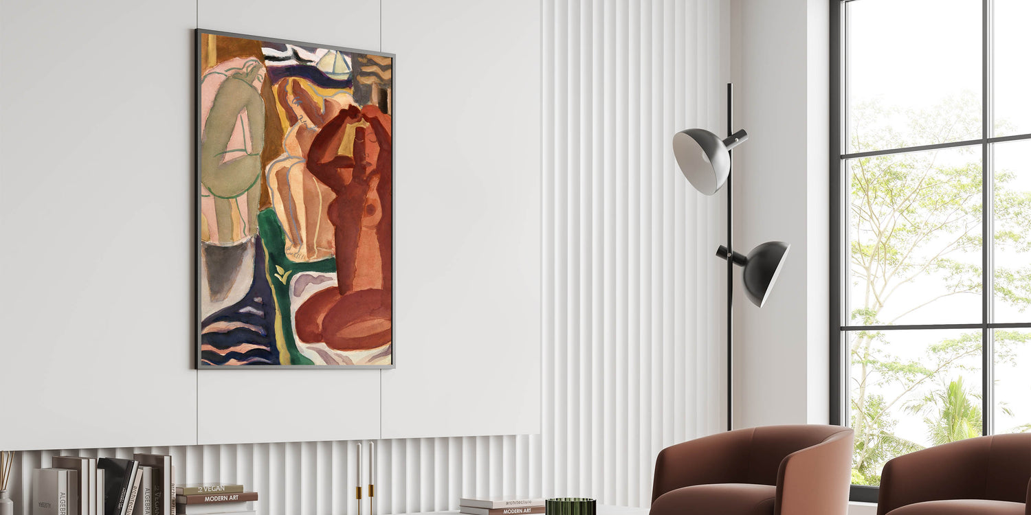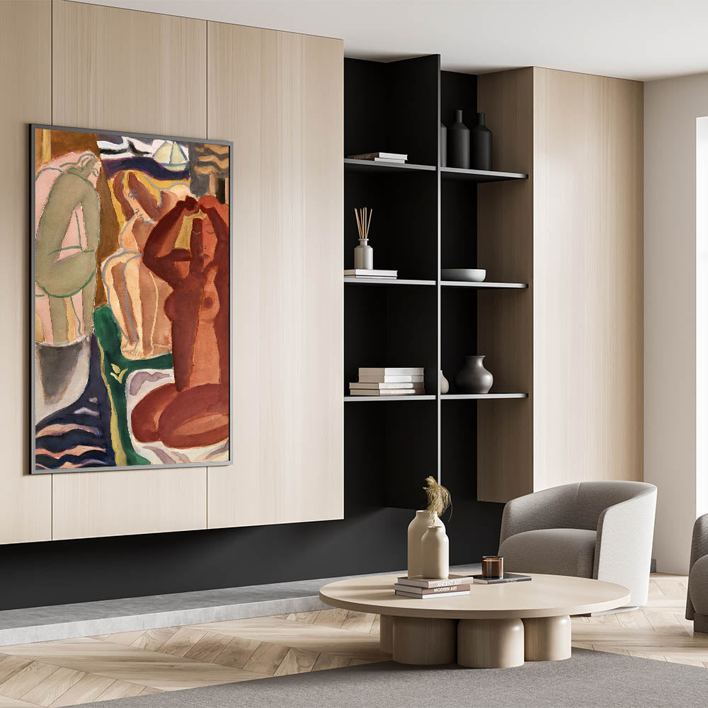 Bring the captivating world of modern Expressionism into your home with this stunning artwork, "Two Bathing Women and a Bridge Figure." This vibrant Expressionism painting exemplifies the emotive intensity and dynamic forms characteristic of this iconic art movement. With its rich earthy tones and abstract yet evocative composition, it’s an excellent choice for those seeking colorful Expressionist artwork that resonates with emotion and creativity.