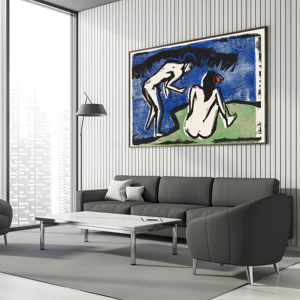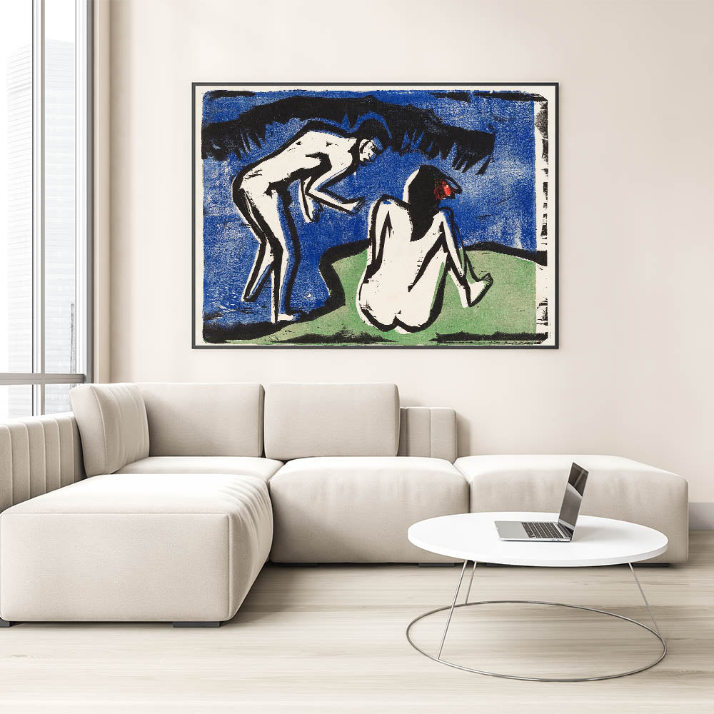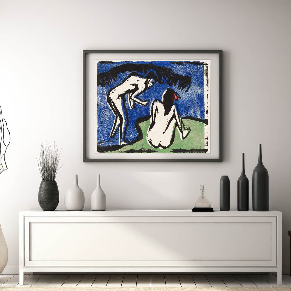 Experience the raw emotion of "Bathing Couple" by Ernst Ludwig Kirchner, a timeless Expressionist masterpiece. Featuring two nude figures in a natural setting, this artwork uses a bold palette of deep blue, earthy green, and black to convey intimacy and energy. The minimalist composition and striking contrasts highlight the expressive movement and emotional depth of the scene, making it a stunning addition to any space.