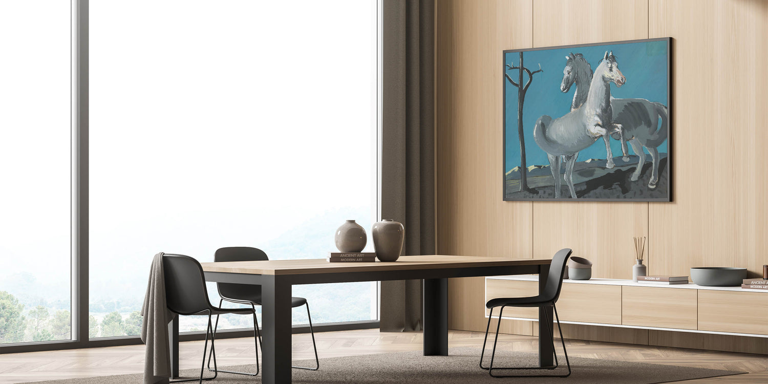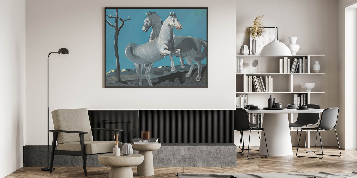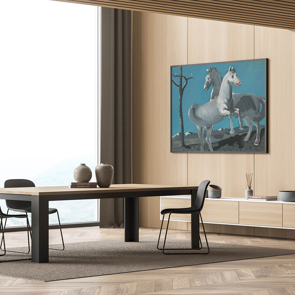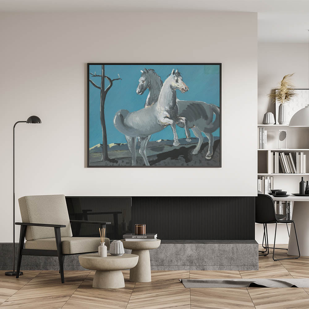This artwork is an excellent choice for anyone seeking to add a touch of emotion and abstraction to their home decor. The contrast of light and dark tones with the dynamic horse imagery will enhance any modern space with bold expression.