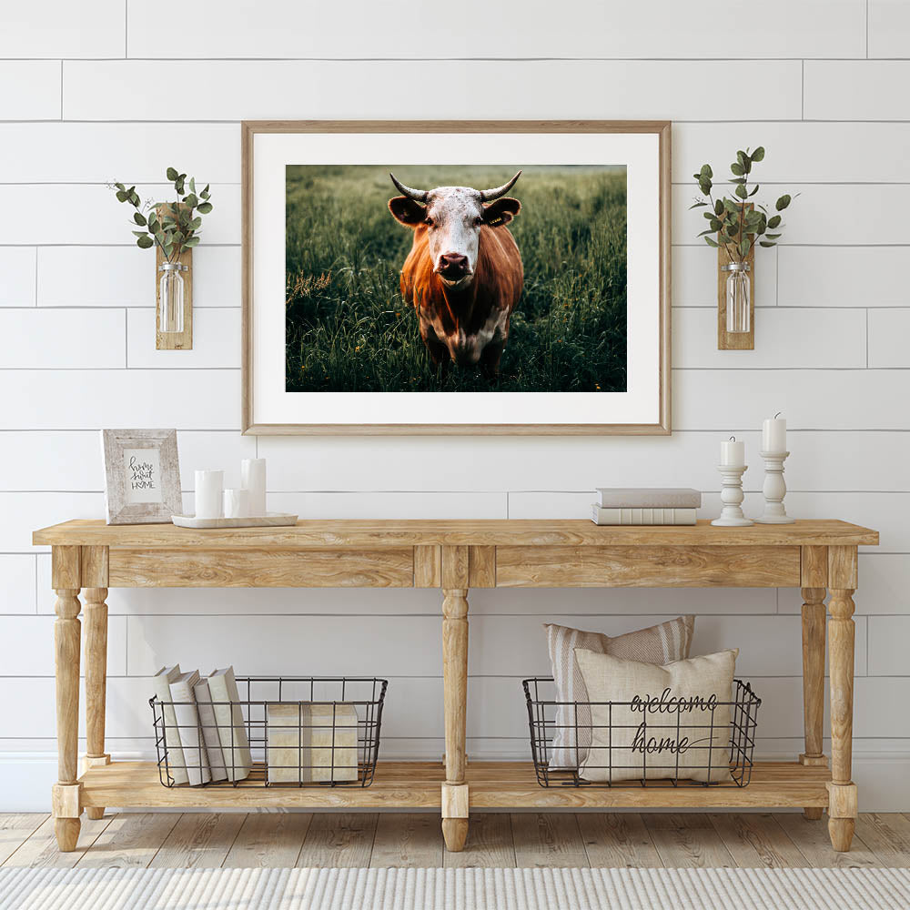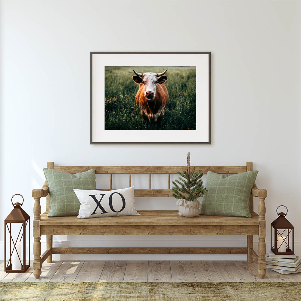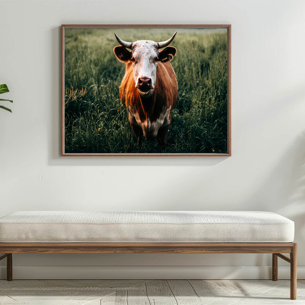 Bring the essence of rural life into your home with this captivating farmhouse wall art featuring a cow grazing in a lush green field. The striking close-up of the cow with its distinctive horns and natural coloring adds a touch of personality and warmth to your decor. Perfect for farmhouse-inspired interiors, this artwork beautifully captures the tranquility of the countryside, making it ideal for those who appreciate the charm of rustic living.