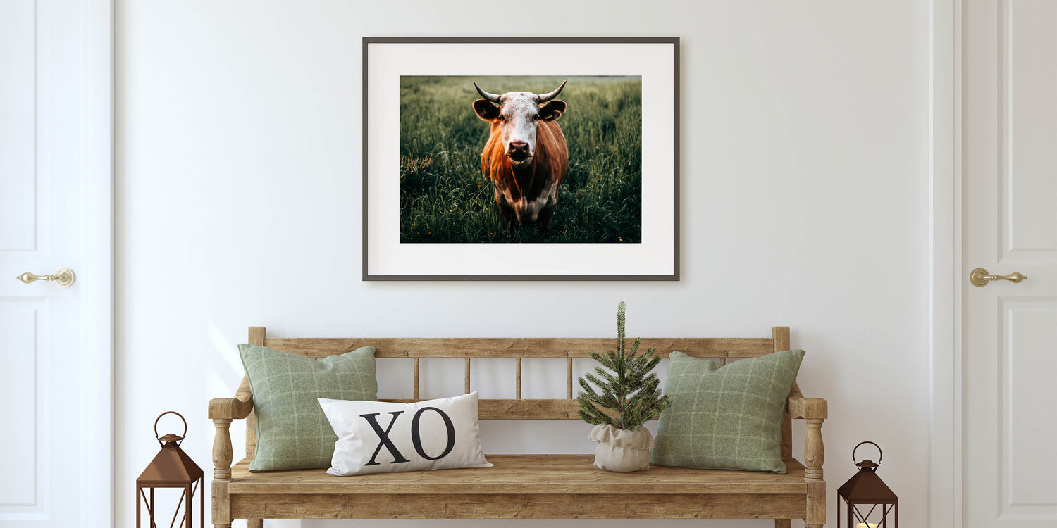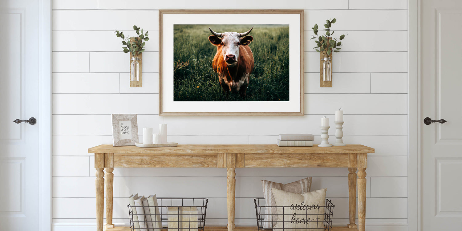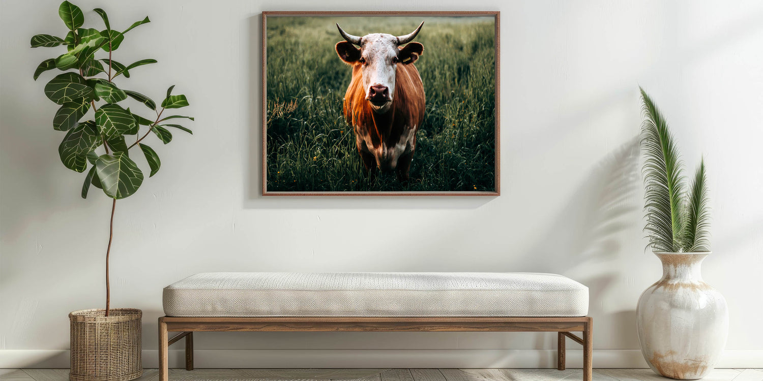 Bring the essence of rural life into your home with this captivating farmhouse wall art featuring a cow grazing in a lush green field. The striking close-up of the cow with its distinctive horns and natural coloring adds a touch of personality and warmth to your decor. Perfect for farmhouse-inspired interiors, this artwork beautifully captures the tranquility of the countryside, making it ideal for those who appreciate the charm of rustic living.
