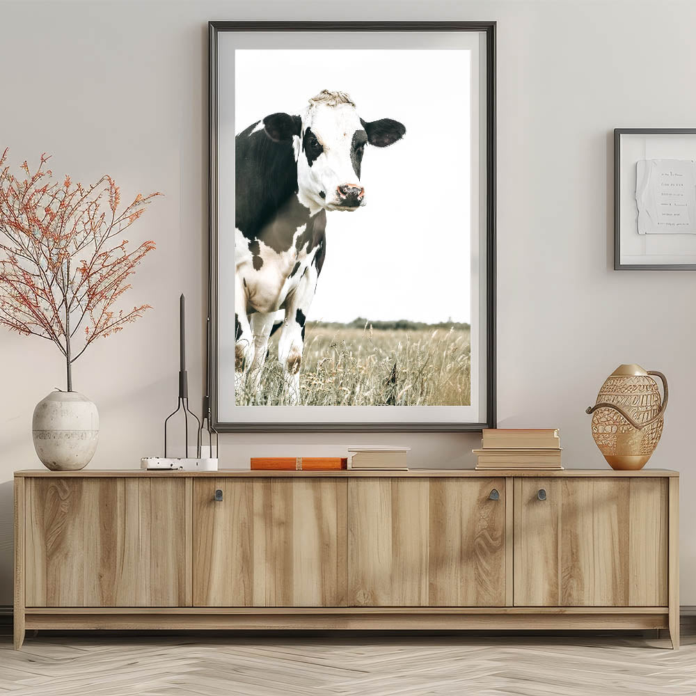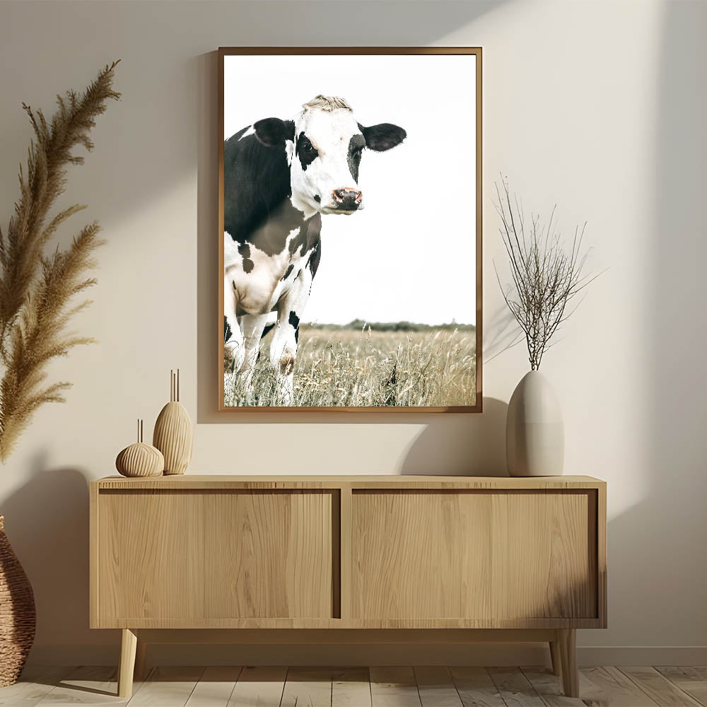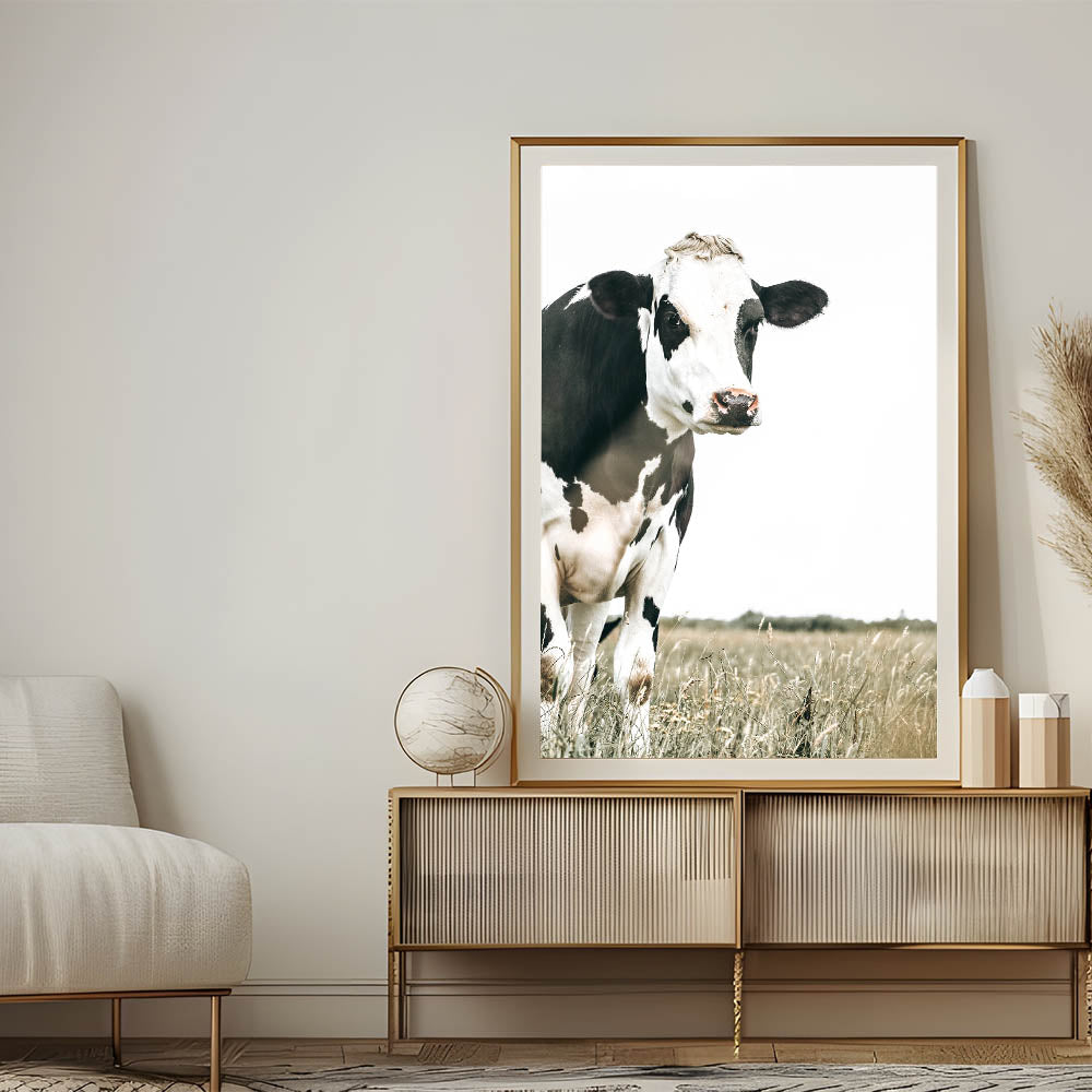 Add a touch of rural charm to your home with this farmhouse cow wall art. Featuring a striking black and white cow standing in a serene field, this artwork beautifully captures the simplicity and elegance of country life. The minimalist backdrop draws attention to the natural beauty of the animal, while the muted tones blend seamlessly with rustic or vintage farmhouse decor.