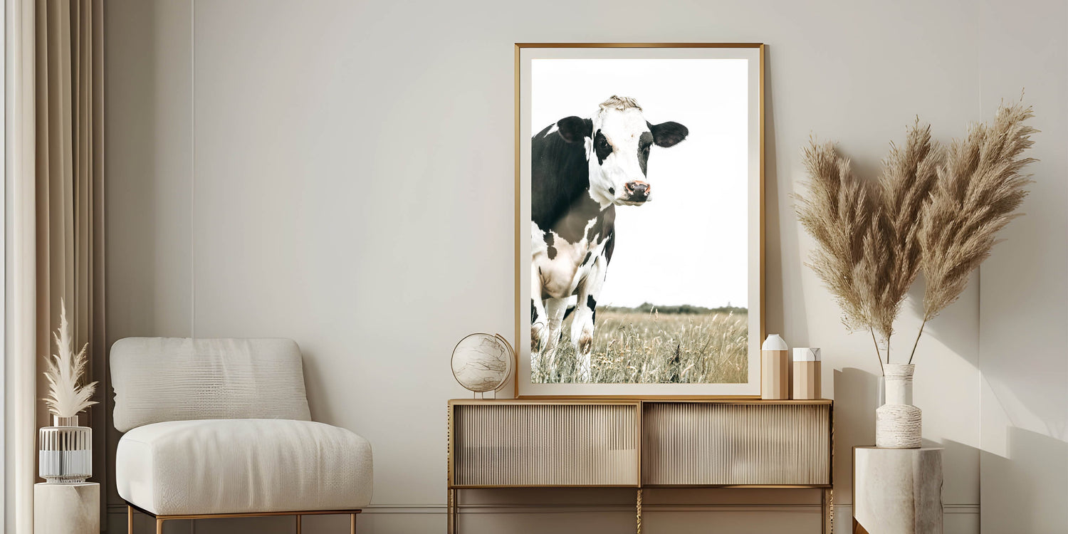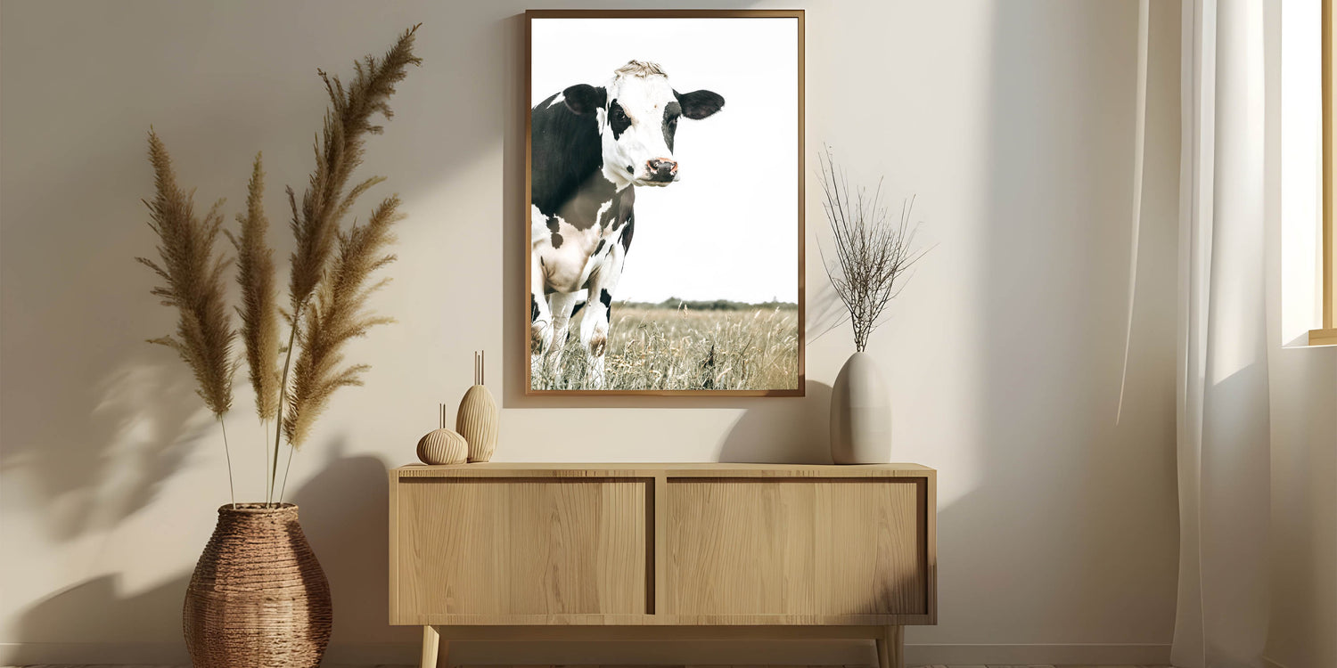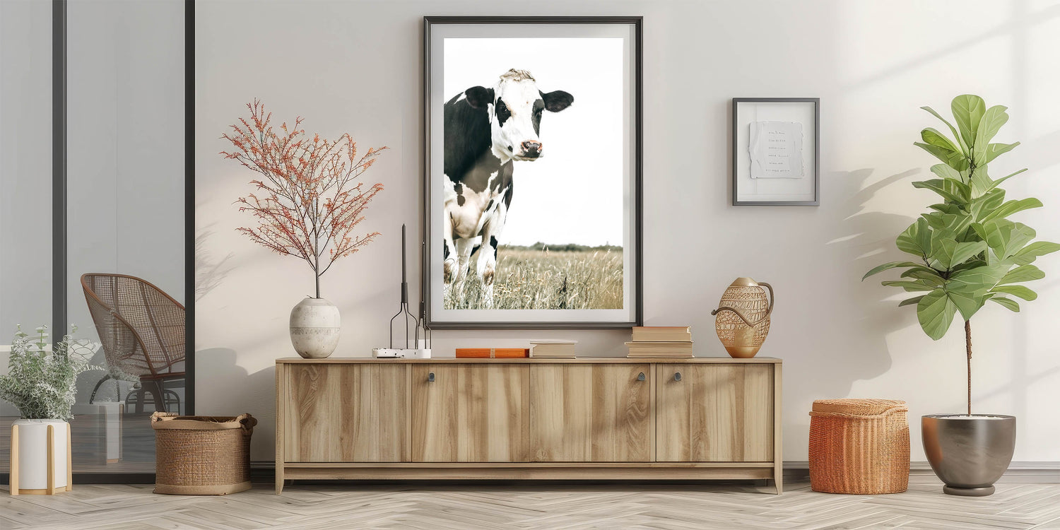 Add a touch of rural charm to your home with this farmhouse cow wall art. Featuring a striking black and white cow standing in a serene field, this artwork beautifully captures the simplicity and elegance of country life. The minimalist backdrop draws attention to the natural beauty of the animal, while the muted tones blend seamlessly with rustic or vintage farmhouse decor.