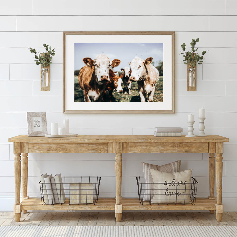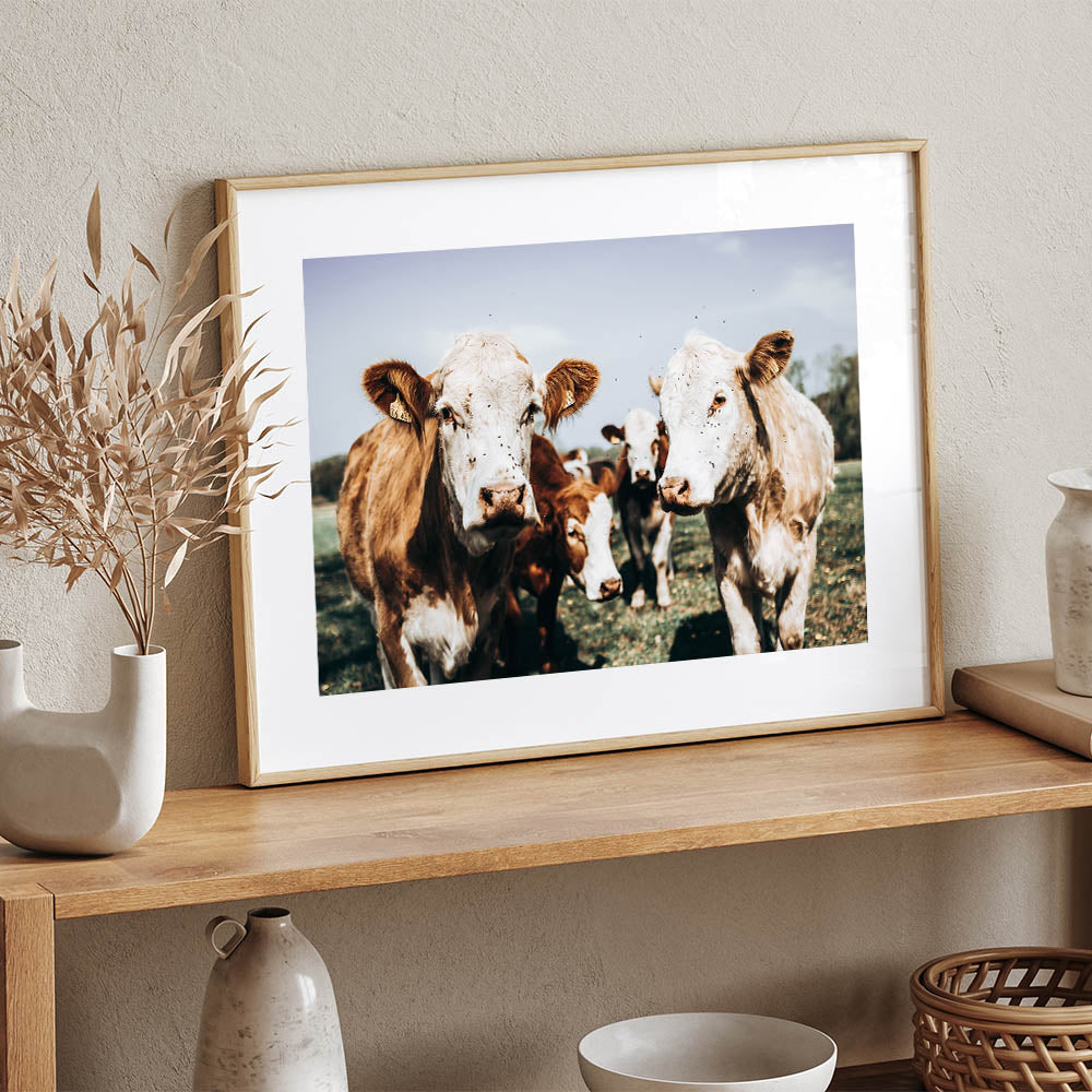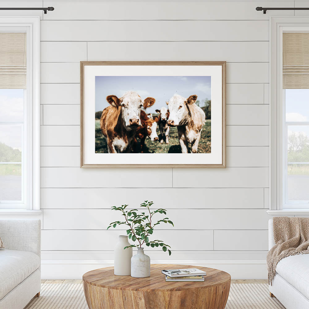 Add a touch of rustic charm to your home with this beautiful farmhouse wall art featuring a herd of cows in a peaceful countryside setting. The close-up of the cows with their curious expressions brings a sense of life and character to this artwork, making it a perfect addition to any country-style or farmhouse-inspired space. The natural colors and detailed textures of the cows create a warm and inviting atmosphere, making this piece ideal for those who love the simple beauty of rural life.