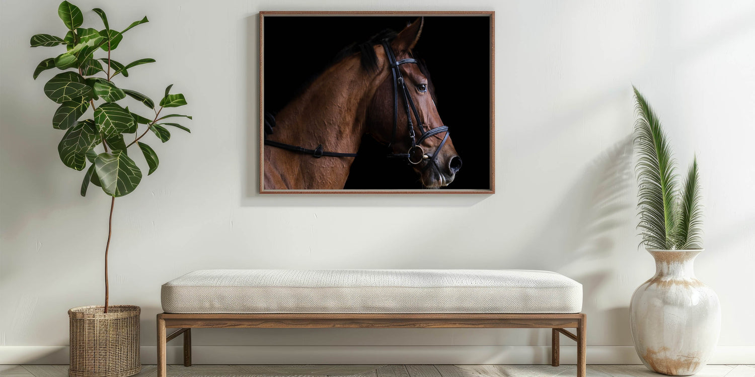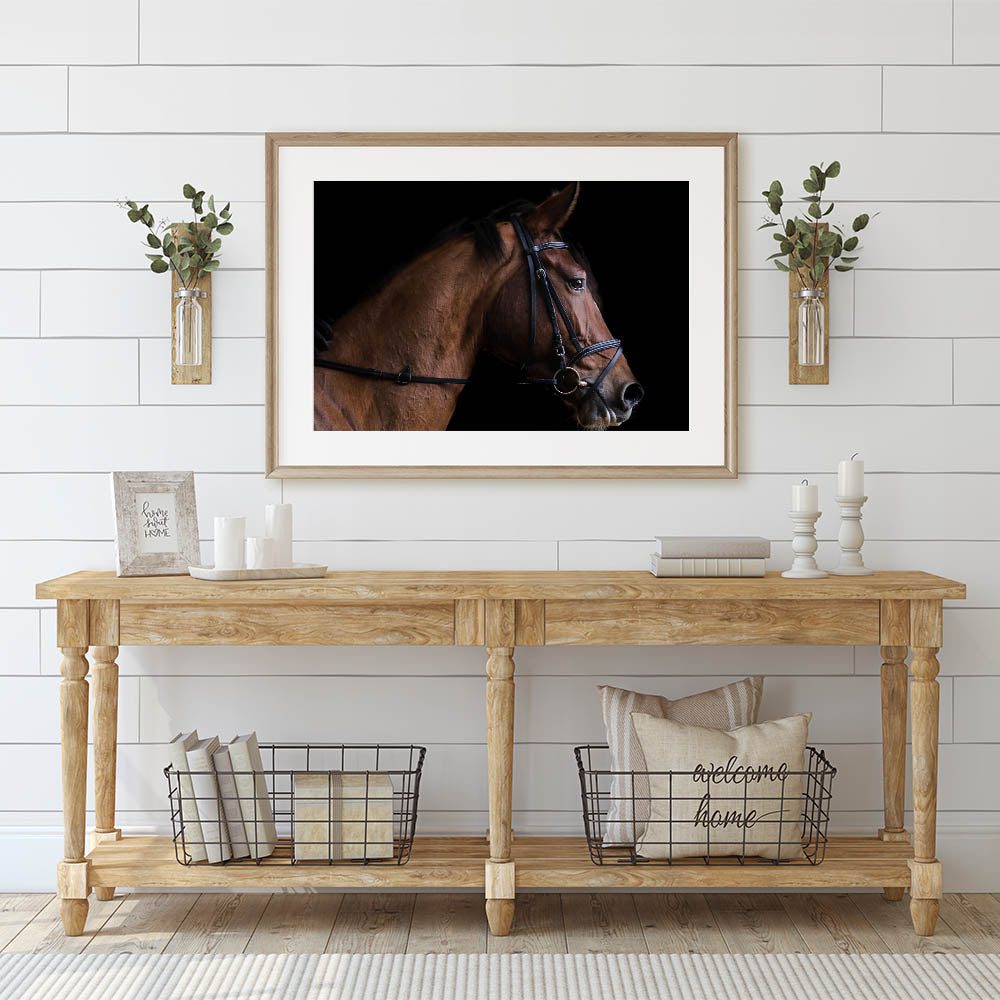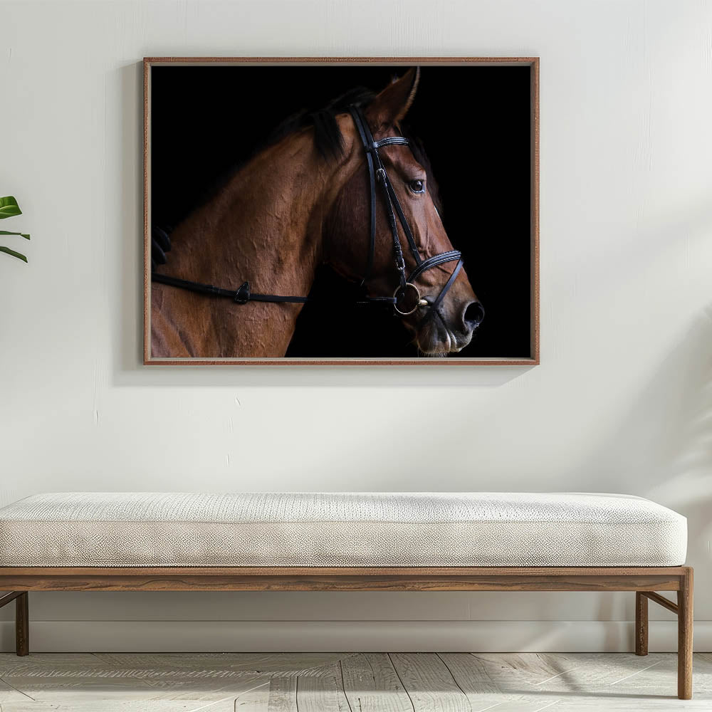 Bring the grace and beauty of a horse into your home with this elegant farmhouse wall art. The close-up profile of the horse, with its sleek lines and detailed features, exudes both strength and sophistication. Set against a bold black background, the rich brown tones of the horse stand out, creating a striking focal point that adds rustic charm to any space. This artwork is perfect for equestrian lovers or those who appreciate the serene beauty of farm life.