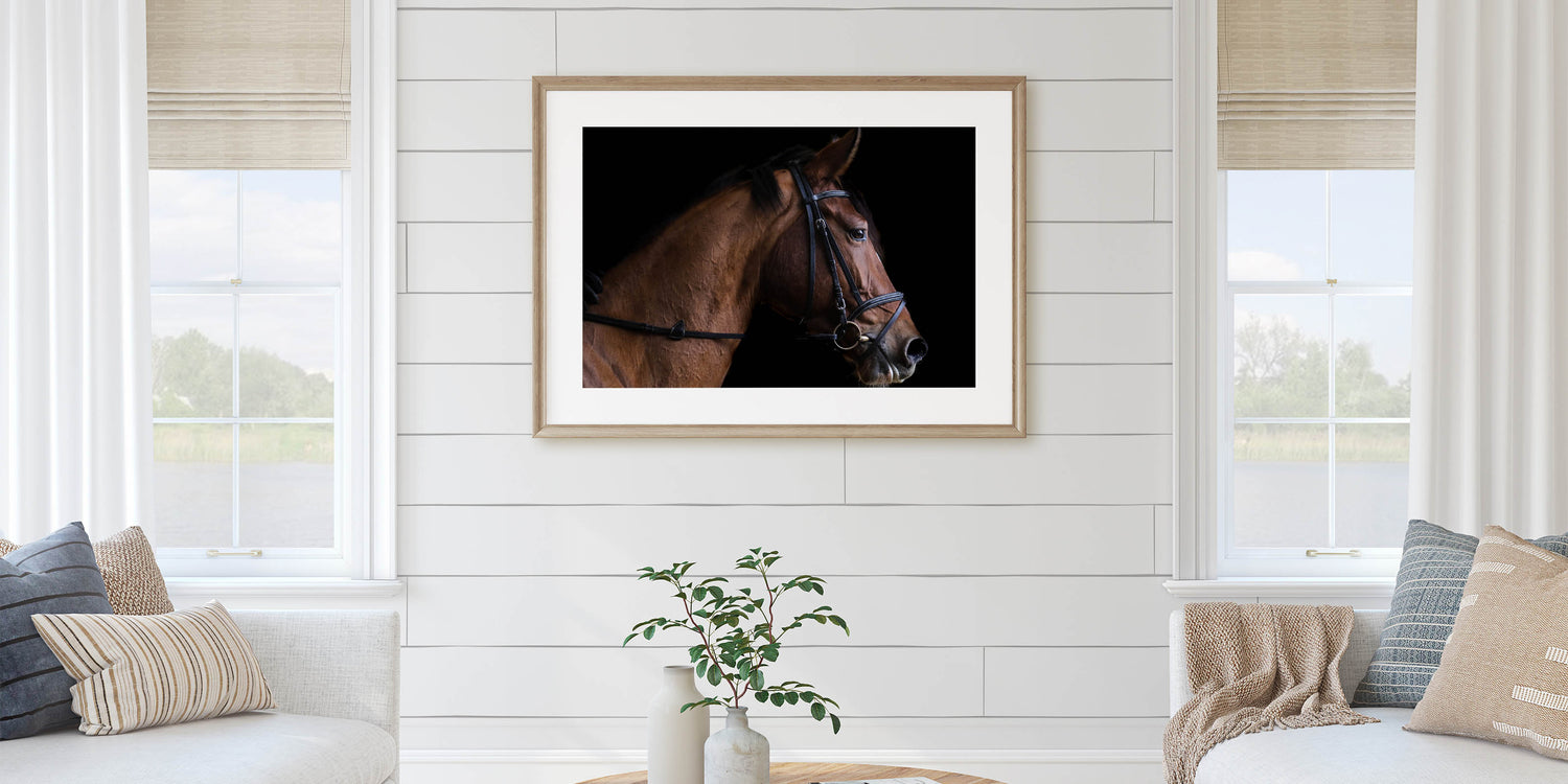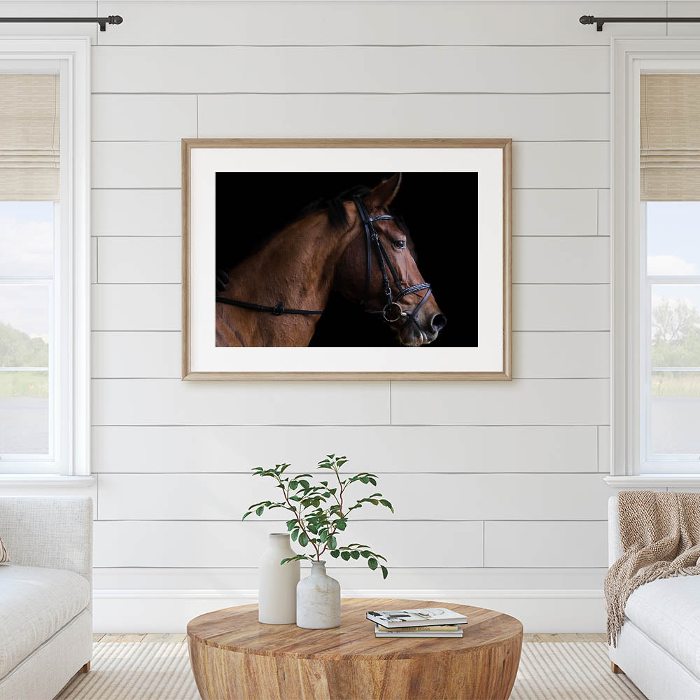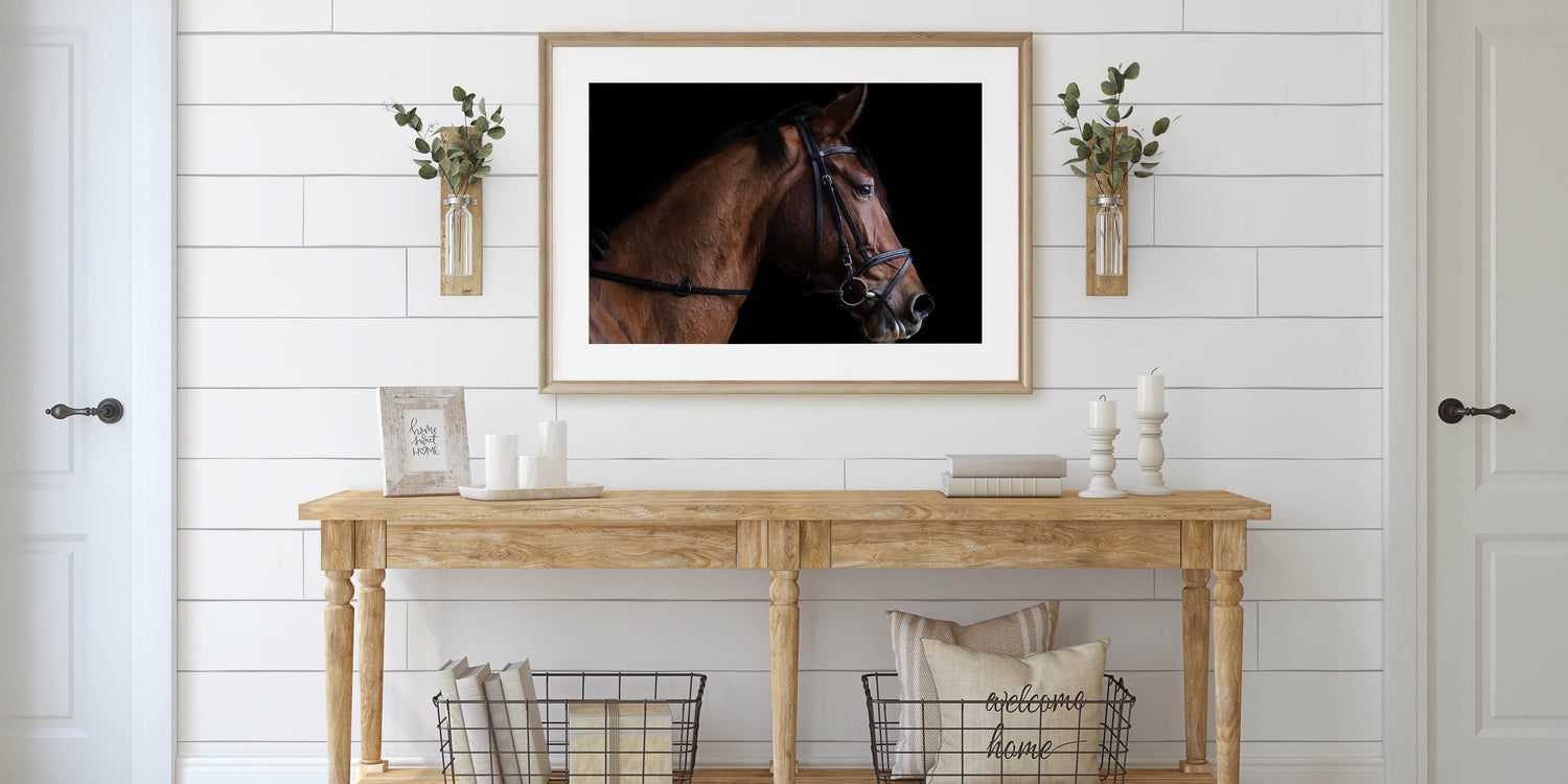 Bring the grace and beauty of a horse into your home with this elegant farmhouse wall art. The close-up profile of the horse, with its sleek lines and detailed features, exudes both strength and sophistication. Set against a bold black background, the rich brown tones of the horse stand out, creating a striking focal point that adds rustic charm to any space. This artwork is perfect for equestrian lovers or those who appreciate the serene beauty of farm life.