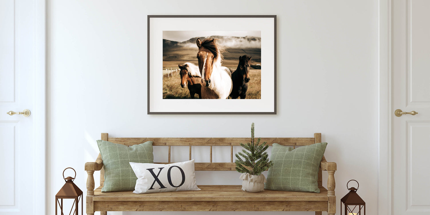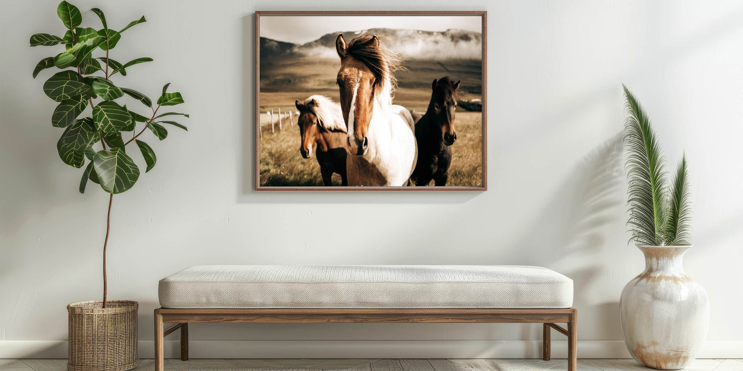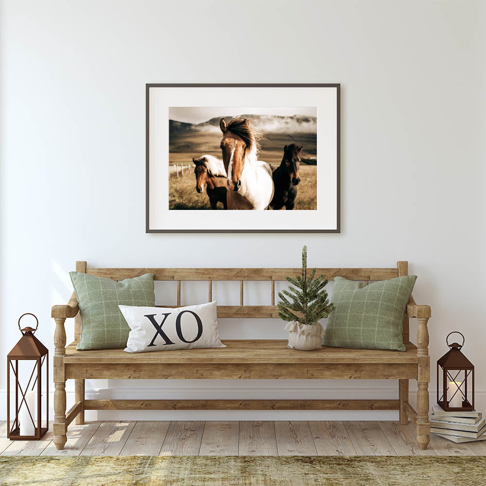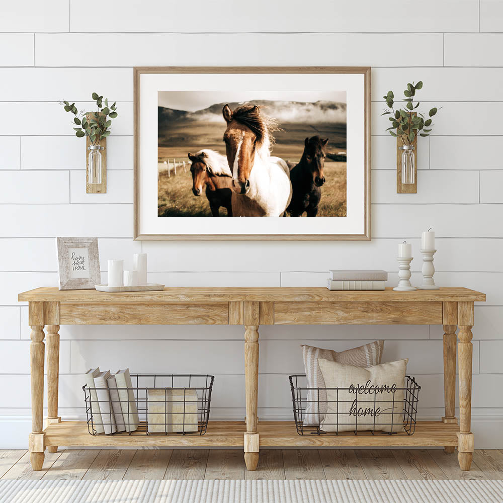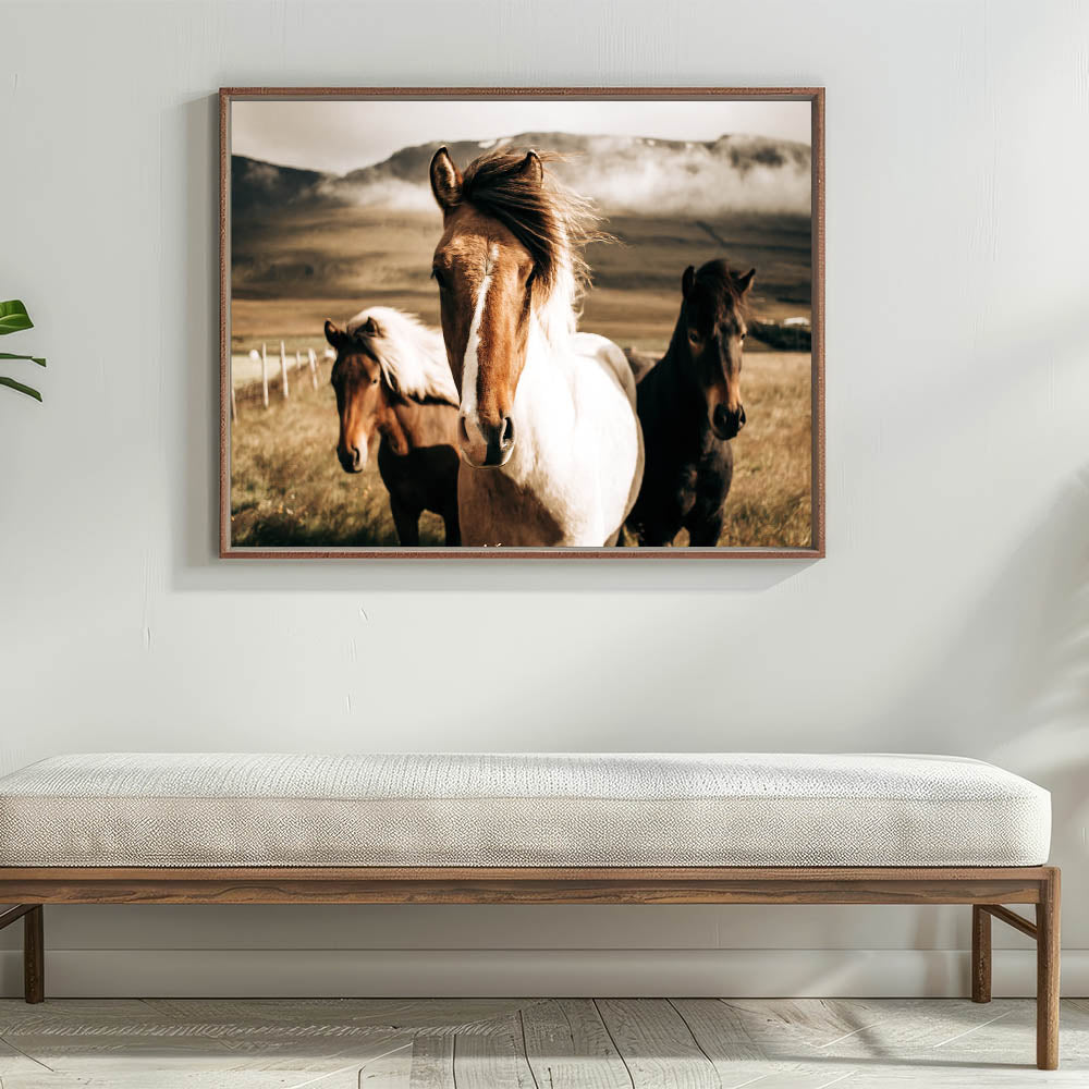 Capture the untamed beauty of the countryside with this striking farmhouse wall art featuring three majestic horses. The image showcases the power and grace of these stunning creatures against a backdrop of rolling hills and misty skies, making it a perfect addition to any rustic or country-style home. With its natural colors and breathtaking composition, this artwork brings the spirit of the countryside into your space, creating a warm and welcoming atmosphere.