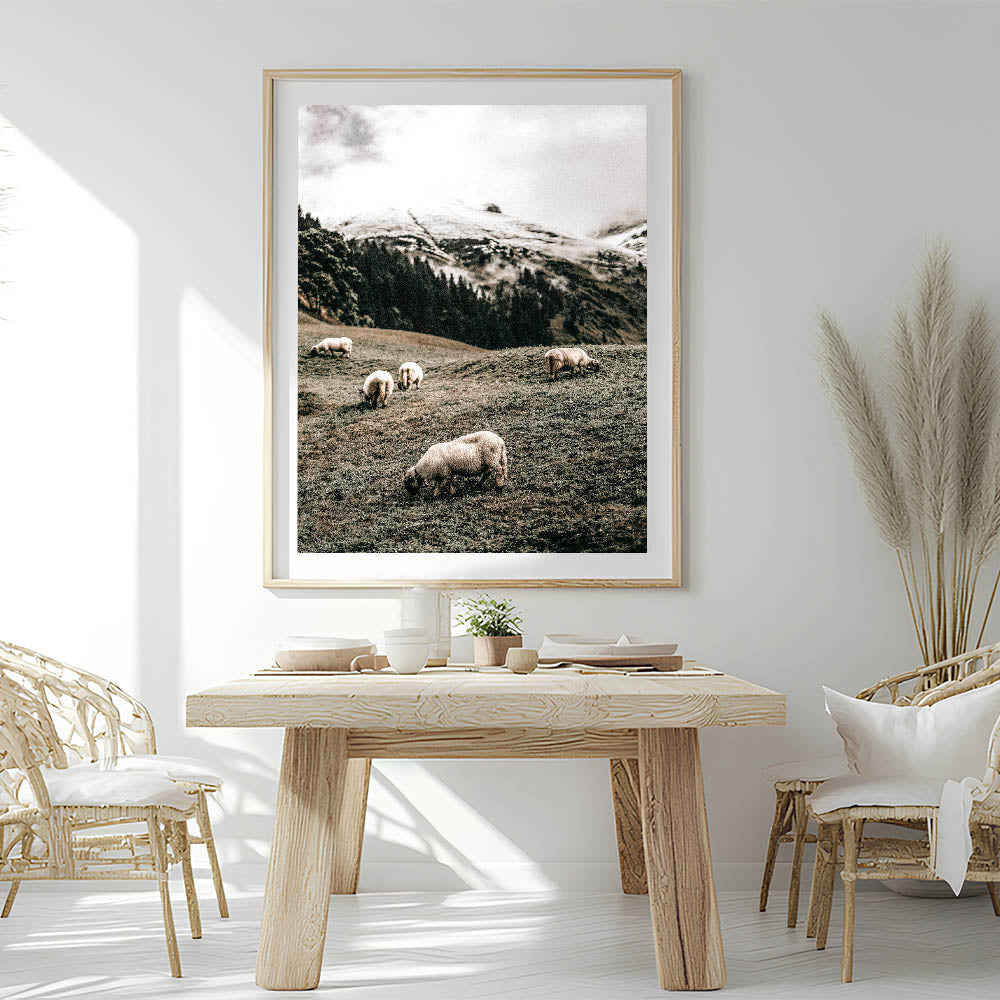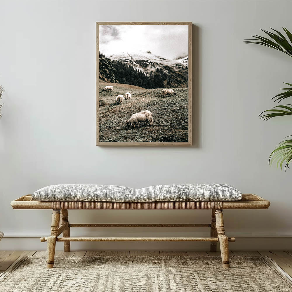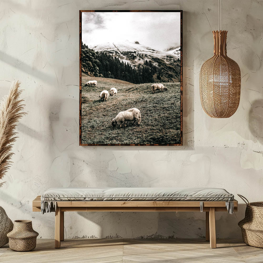 Embrace the peaceful beauty of country life with this farmhouse sheep mountain wall art. The picturesque scene of sheep grazing on a mountain hillside, with the misty peaks in the background, captures the serenity of rural living. This vintage-inspired artwork blends rustic charm with an antique farmhouse aesthetic, making it the perfect addition to any home looking to bring the tranquility of nature indoors.