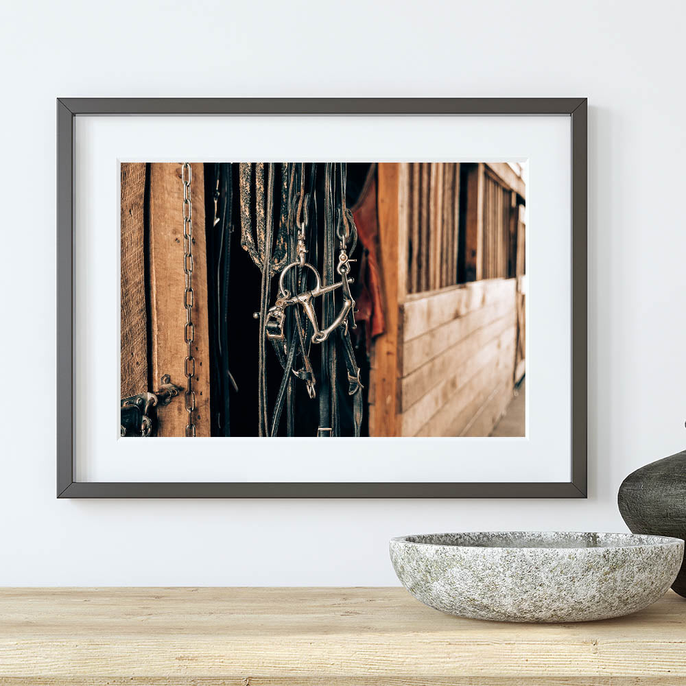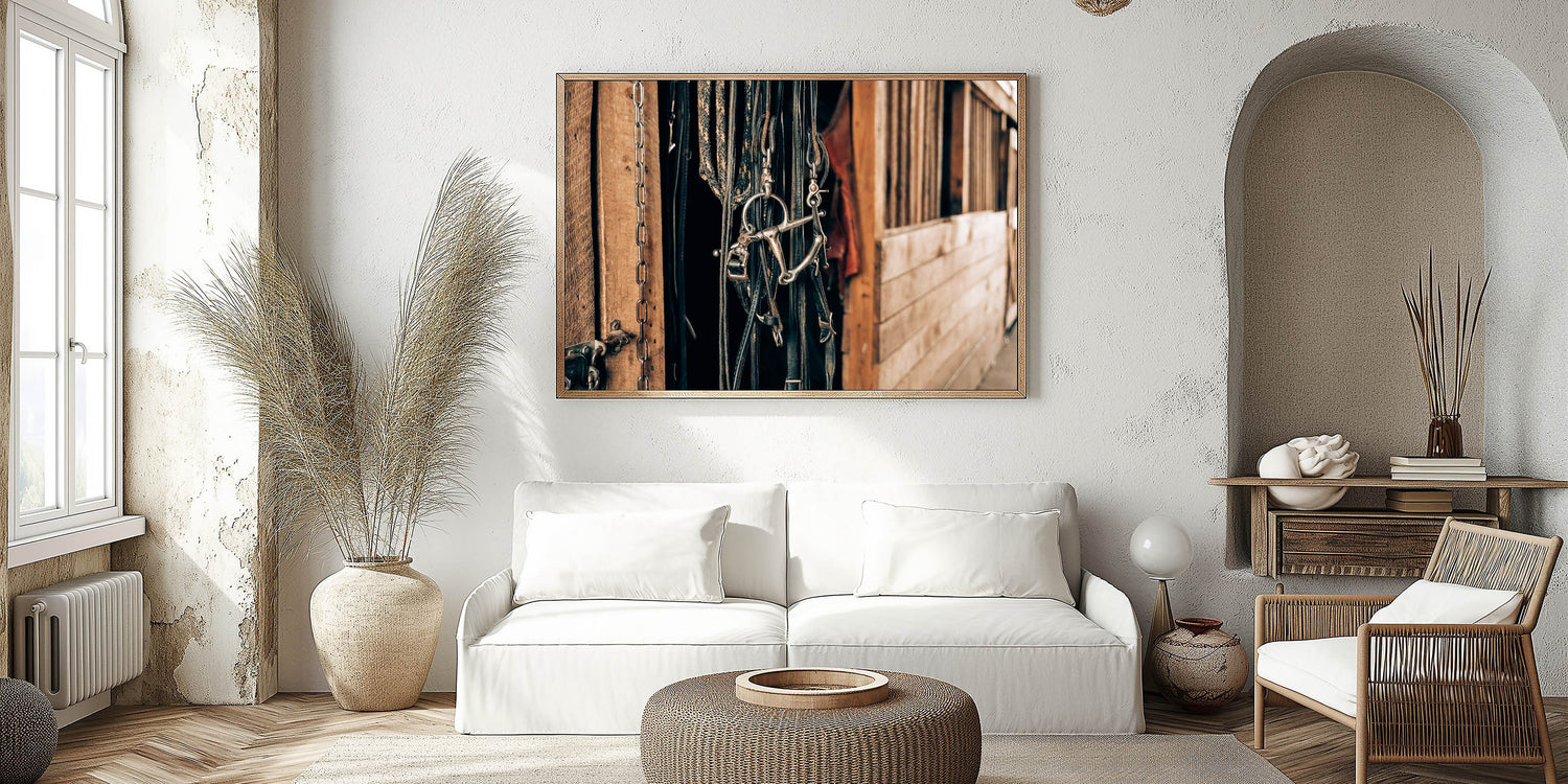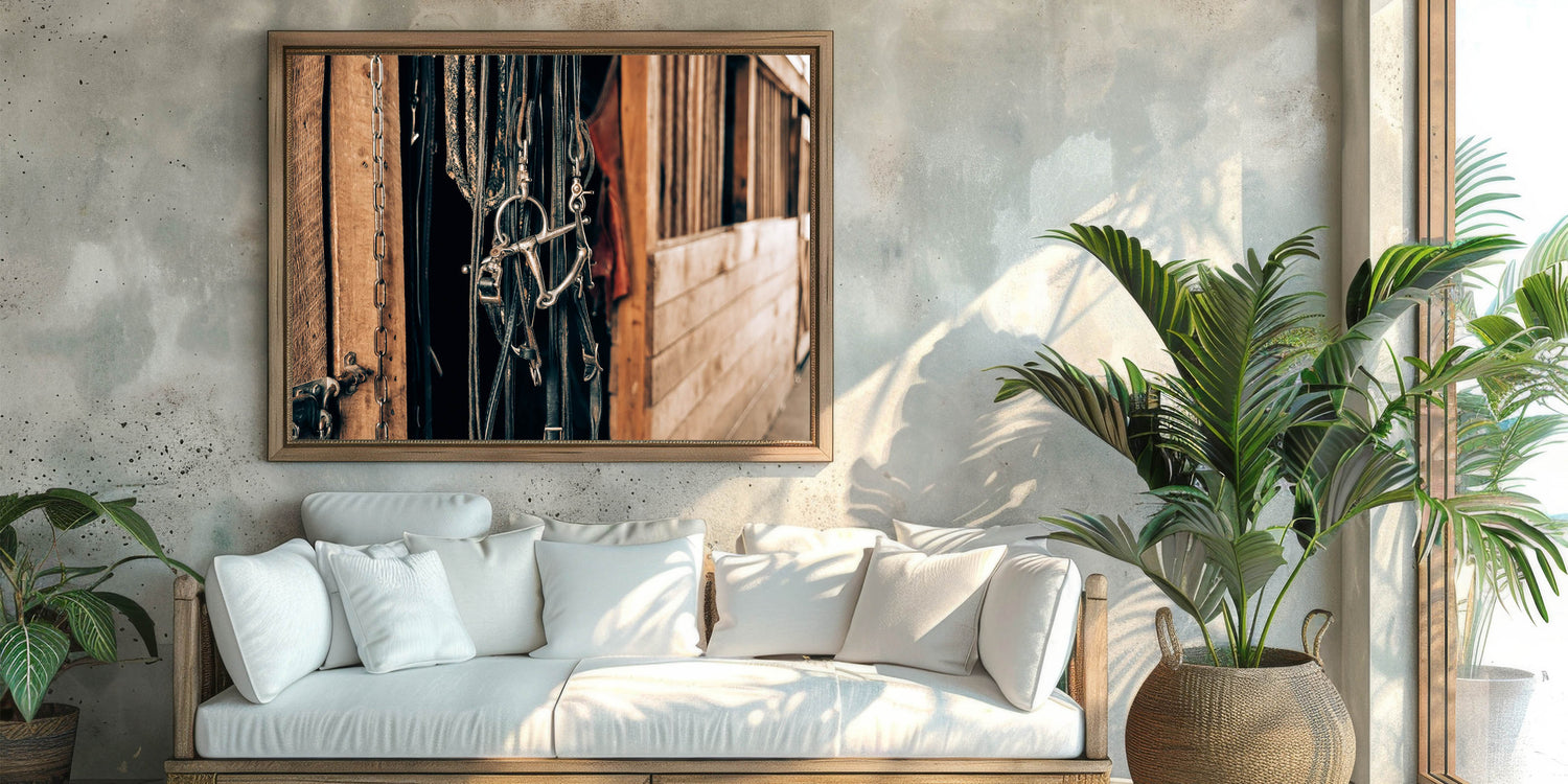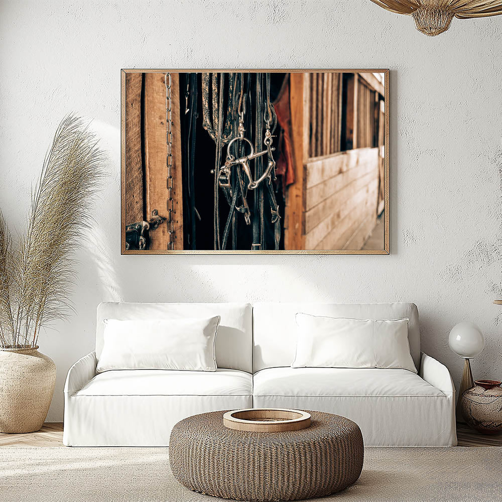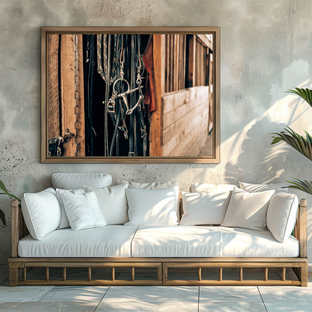 Add a touch of authentic rustic charm to your space with this farmhouse-style wall art, featuring a detailed close-up of horse bridles hanging in a barn. This vintage-inspired artwork perfectly captures the essence of country living, with its weathered wooden background and aged metal accents. Ideal for enhancing any farmhouse or country-style decor, this piece will evoke the charm of rural life and the simplicity of a well-loved stable.