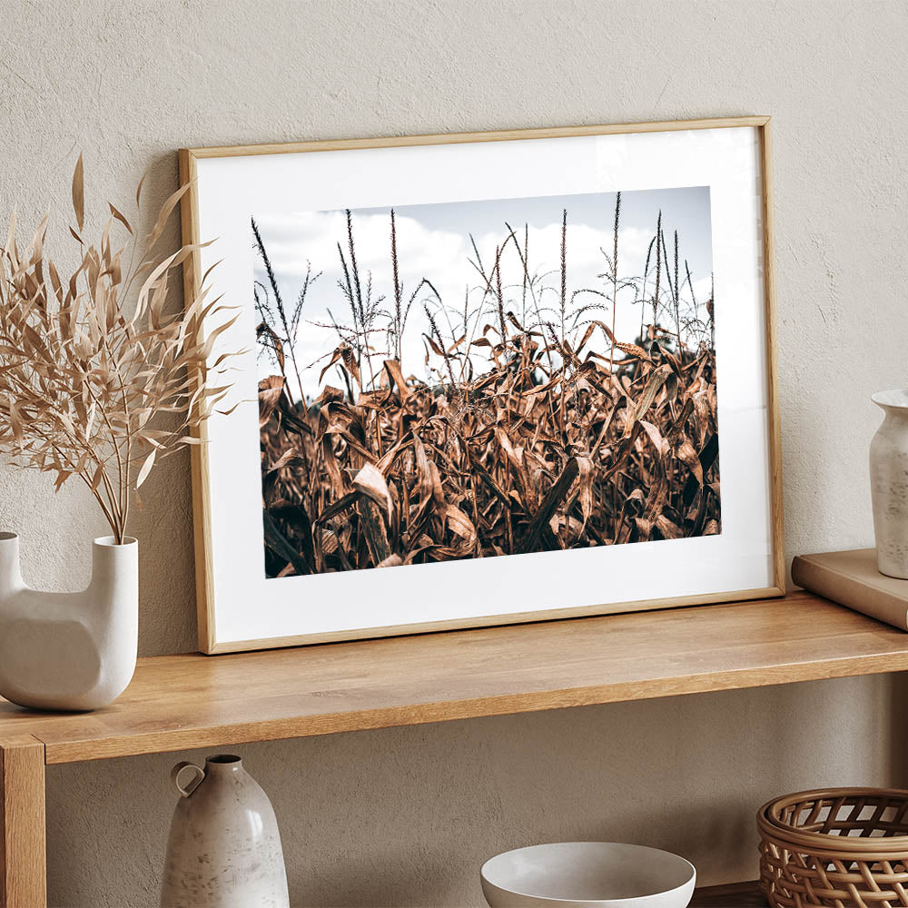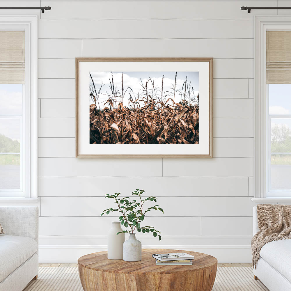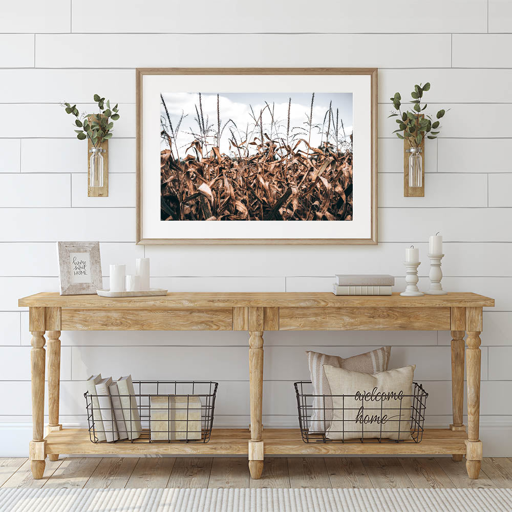This farmhouse wall art offers a striking representation of the fall harvest, ideal for those who appreciate the changing seasons and the beauty of rural landscapes. Available in multiple formats, this corn stalk print will bring a warm and rustic touch to any room.