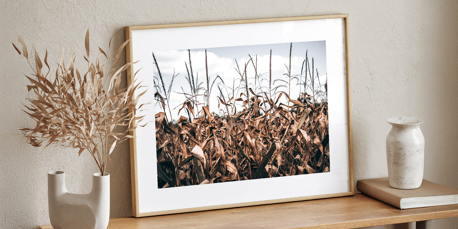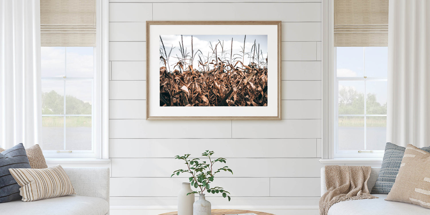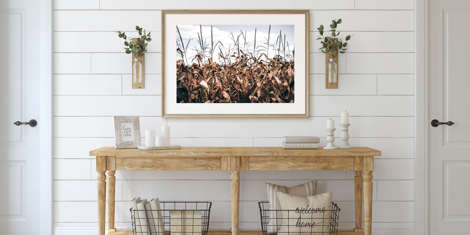 This farmhouse wall art offers a striking representation of the fall harvest, ideal for those who appreciate the changing seasons and the beauty of rural landscapes. Available in multiple formats, this corn stalk print will bring a warm and rustic touch to any room.