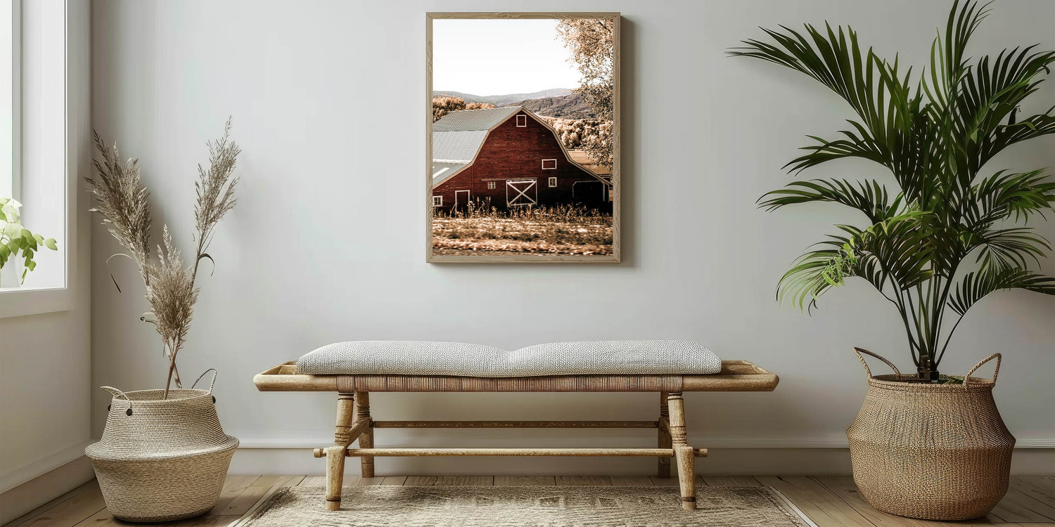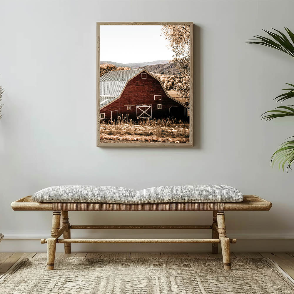 This farmhouse wall art showcases the timeless beauty of a classic red barn nestled in a scenic valley. The vivid red of the barn contrasts beautifully with the serene natural surroundings, creating a peaceful yet striking image of rural life. With the distant hills and golden foliage framing the barn, this artwork captures the charm and simplicity of country living, making it an ideal addition to any farmhouse or rustic decor.