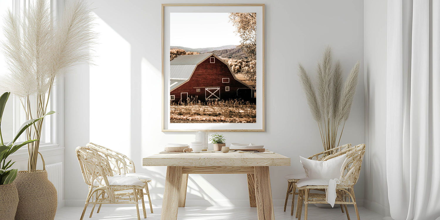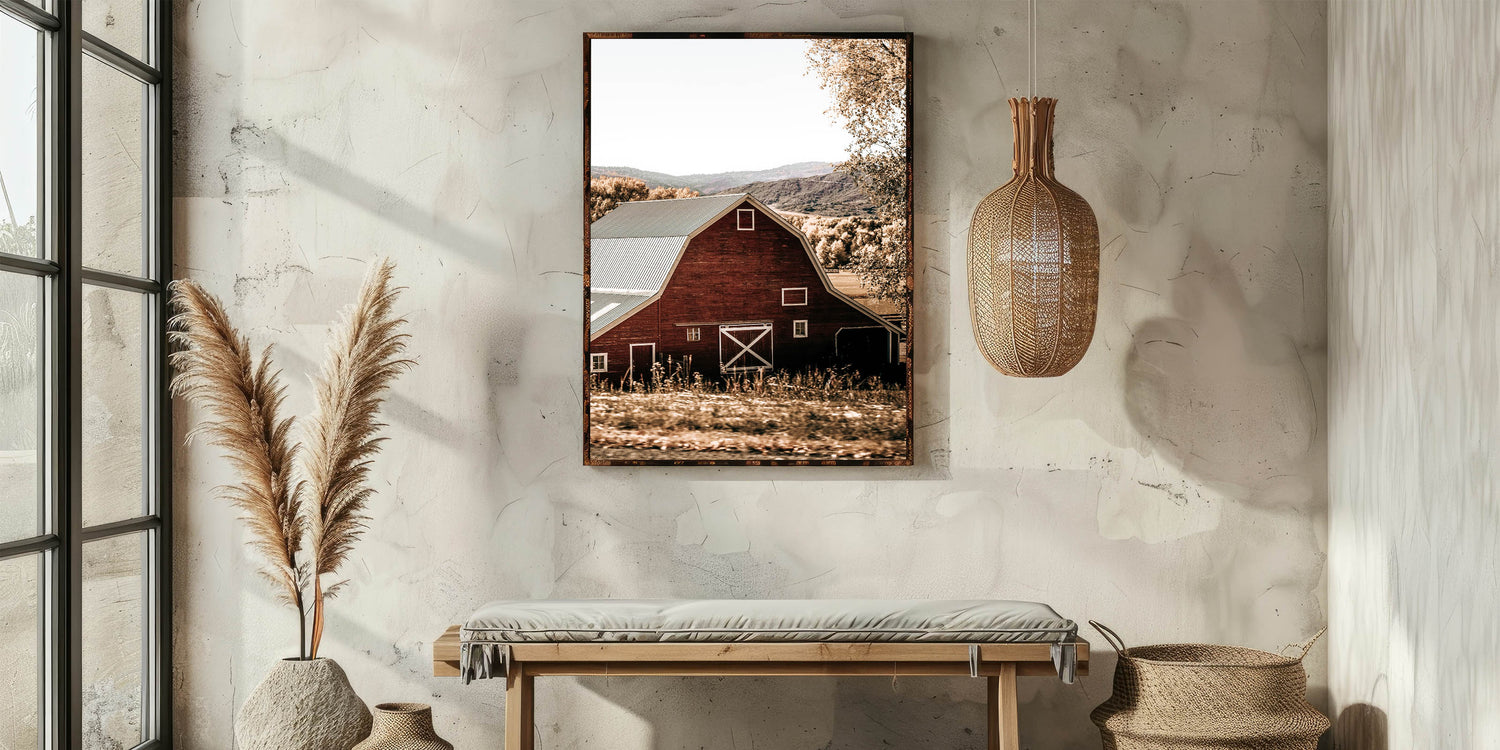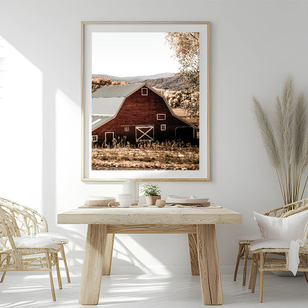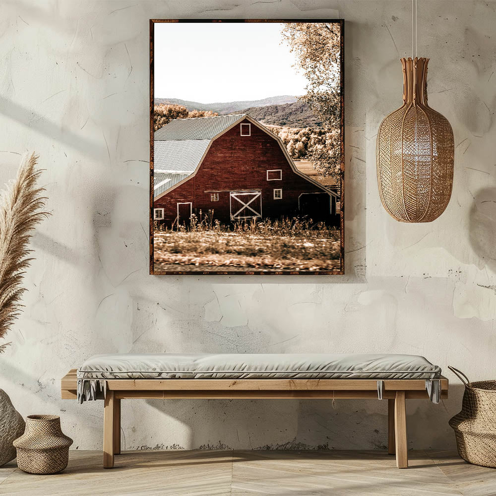 Farmhouse Wall Art: Classic Red Barn in Scenic Valley, Rustic Country Decor