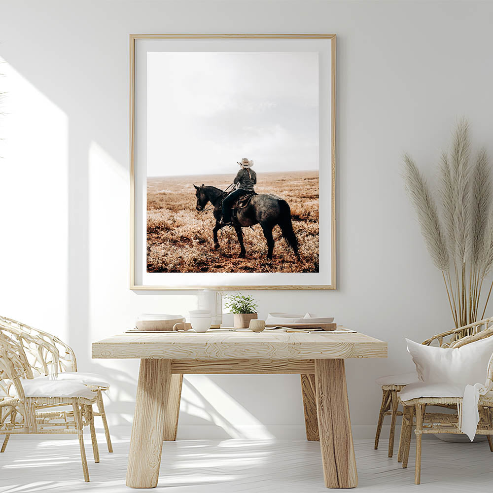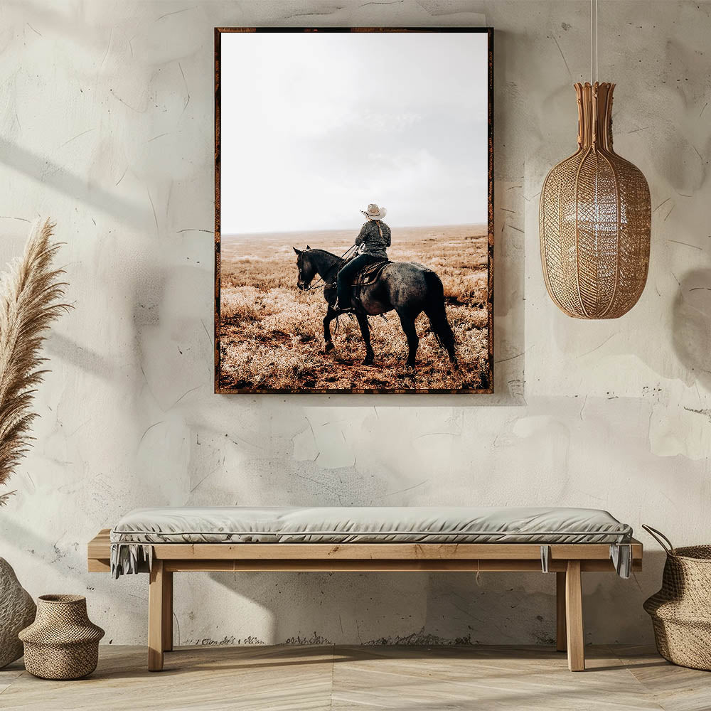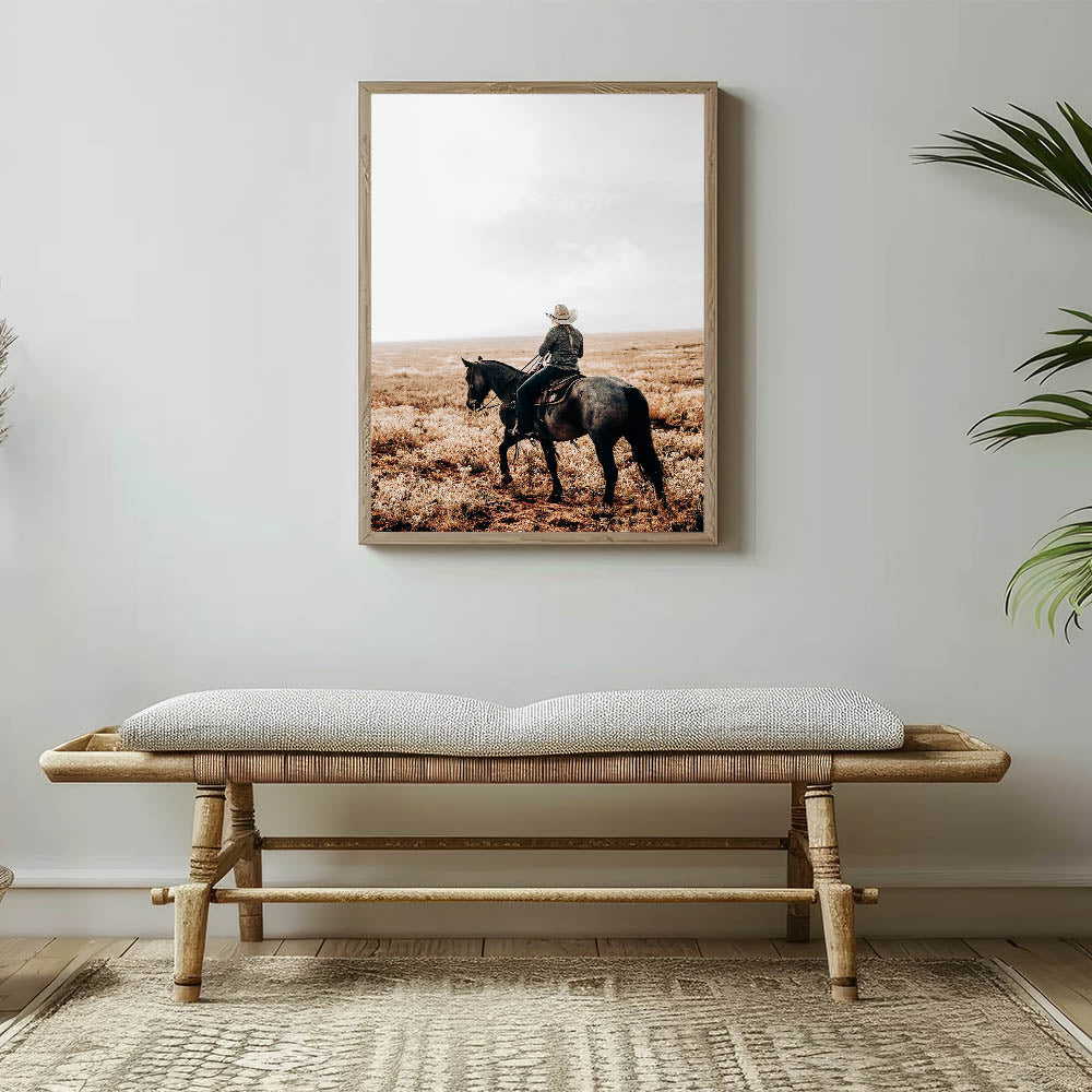 • Rustic charm: A cowboy and horse riding across a serene, open landscape, perfect for farmhouse-style decor.