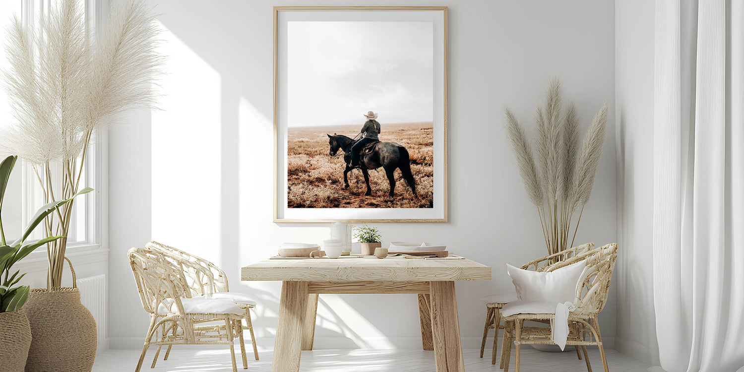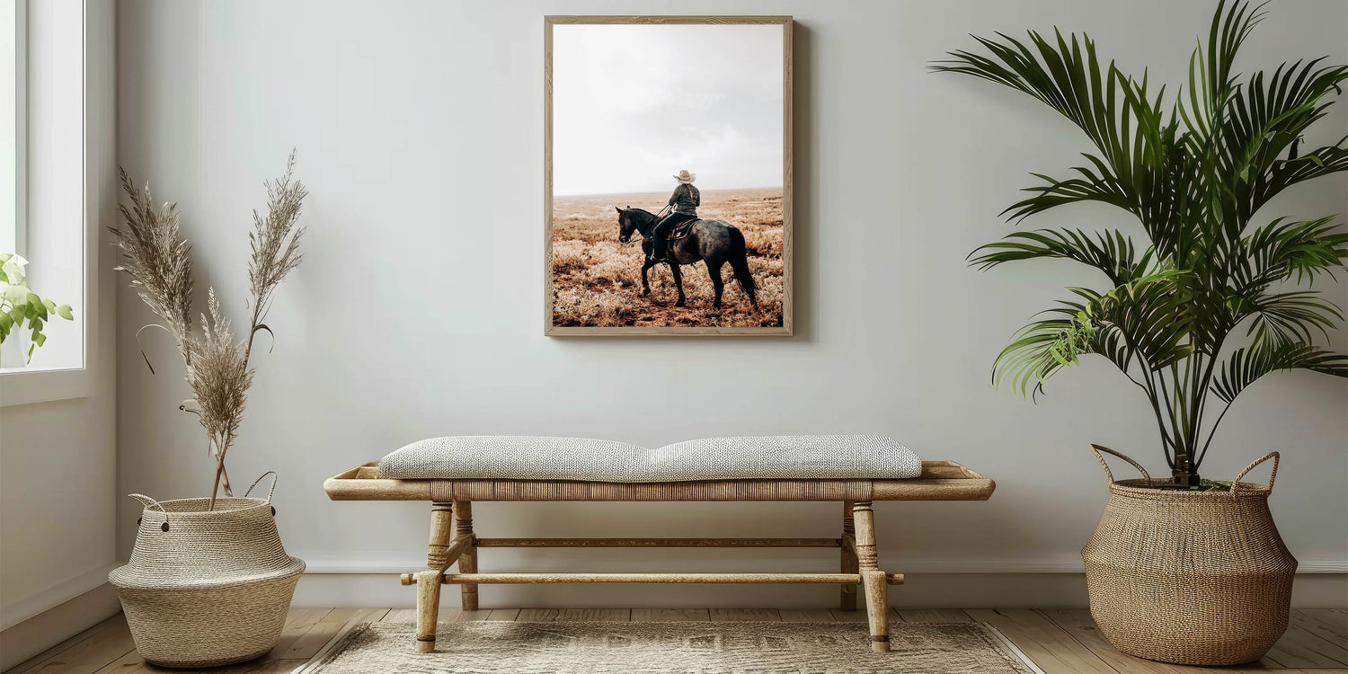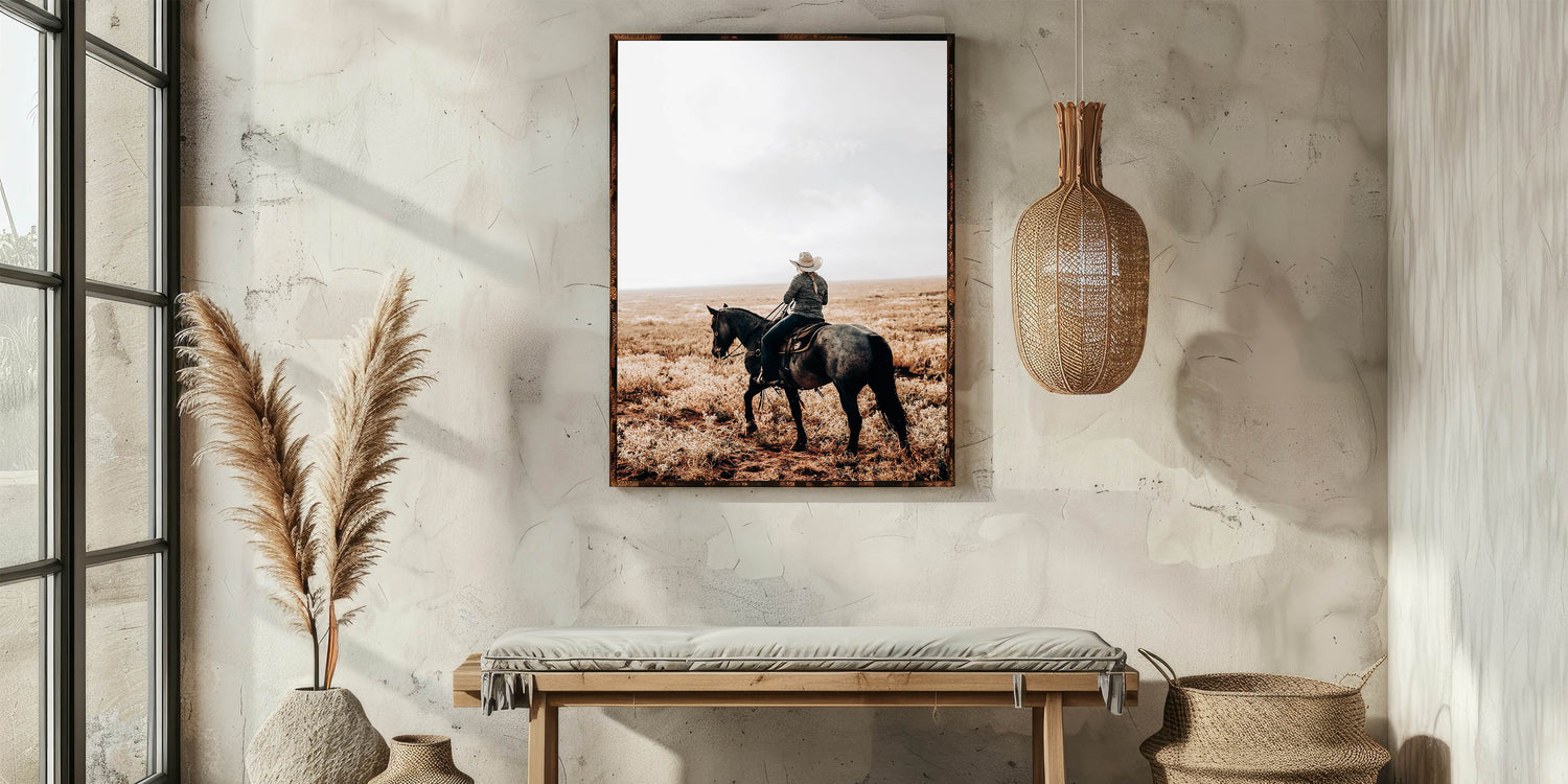 • Rustic charm: A cowboy and horse riding across a serene, open landscape, perfect for farmhouse-style decor.